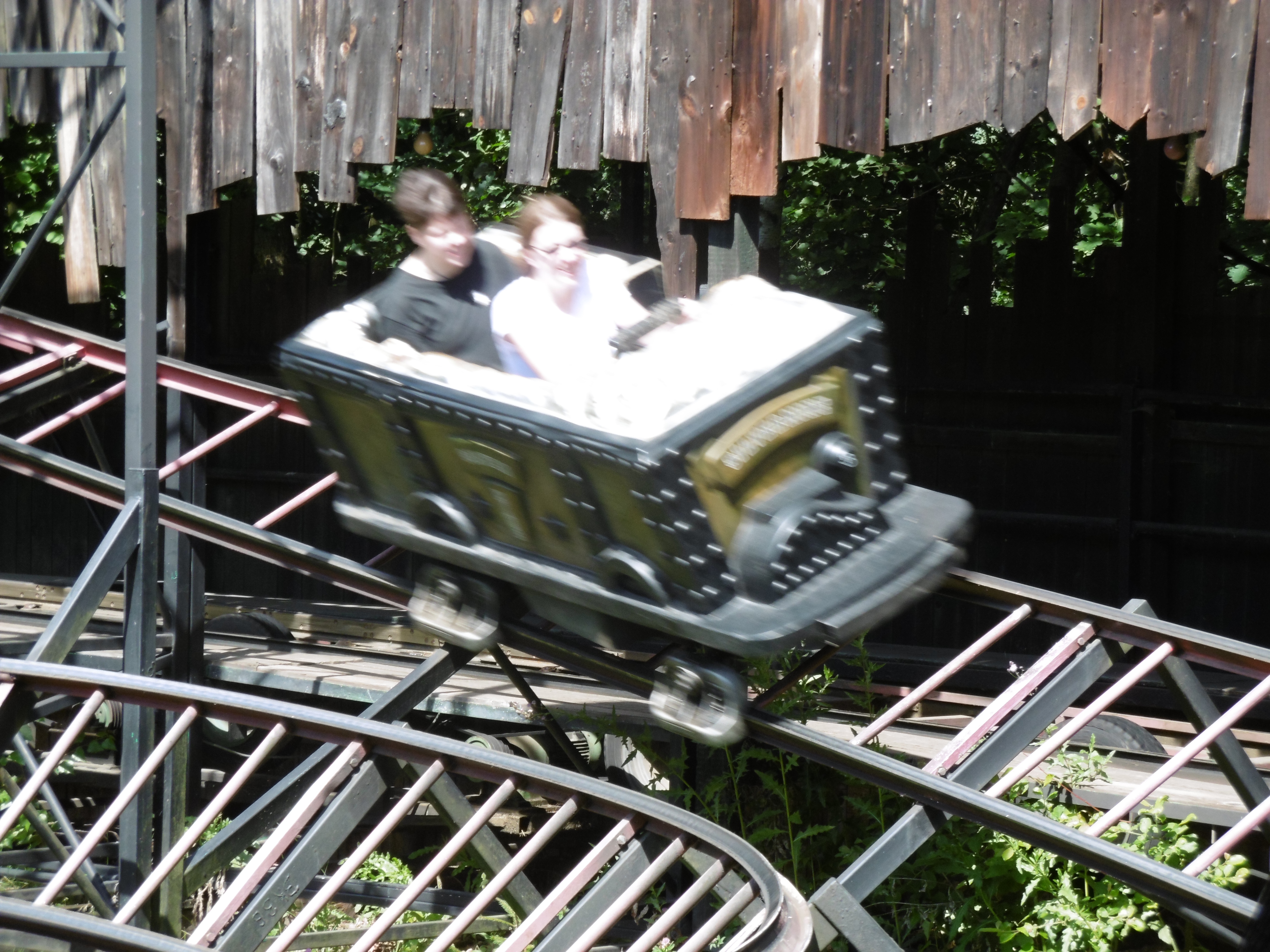 Nach ein wenig herumschippern auf dem Hügelchen geht es ein letztes Mal in die Höhe, bevor eine 16 Meter hohe Abfahrt folgt. Die mündet in einen Tunnel, der für eine dem heutigem Wetter angepasste Benässung leider ein paar Meter zu kurz war. So hielt sich der Nässegrad leider sehr in Grenzen. Mit dem anfänglichen Darkride-Teil und der Verschachtelung mit dem Woodie aber eine tolle Attraktion. Und dieser war dann auch der Grund warum …