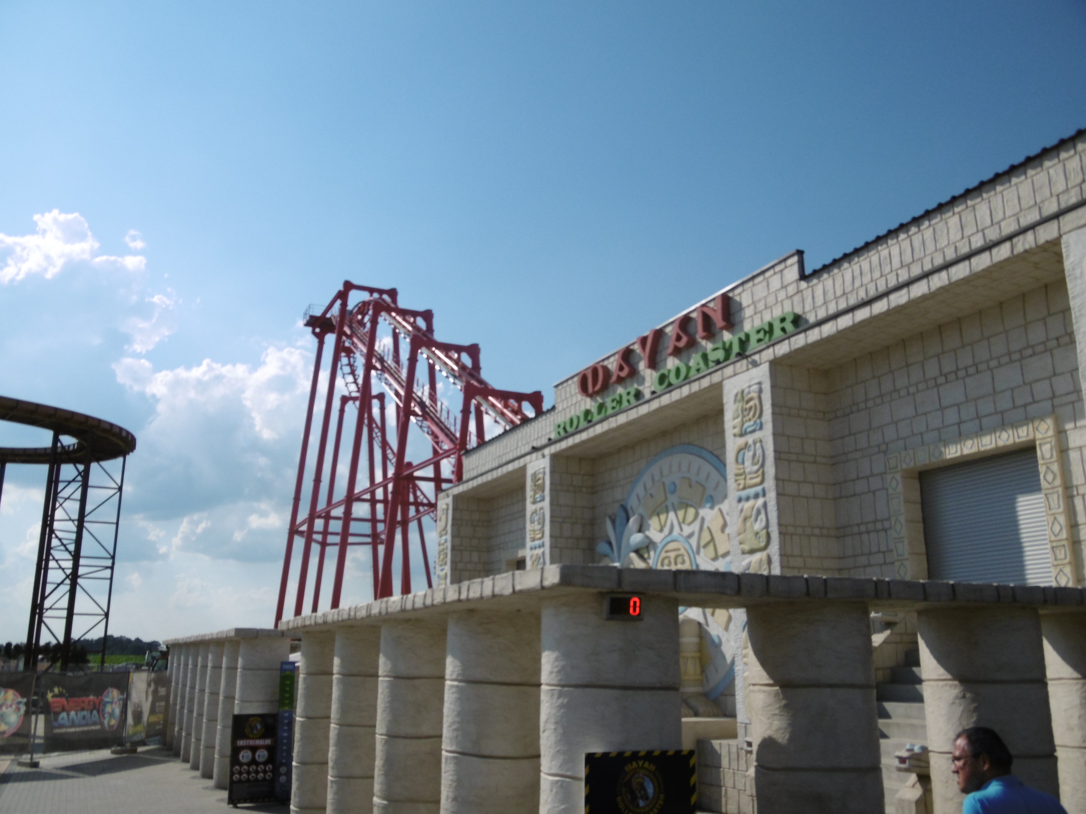 Bei allen Attraktionen im Park gibt es direkt vor der Station eine Zählanlange, auf der angezeigt wird, wie viele Plätze im Zug/Kino/o.ä. noch vorhanden sind. Da sich dann die meist liebenswerten Polen brav von vorne nach hinten anstellten, blieb meistens die letzte Reihe frei. So auch hier, wo ich bei einem SLC sowieso am liebsten sitze. Dort fuhr er sich mit dem bekannten SLC vibrieren, aber ohne jegliche Schläge, die durch die Westen sowieso Firlefanz gewesen wären. Bis auf die Station steht er aber sonst ziemlich kahl auf einer grünen Wiese.