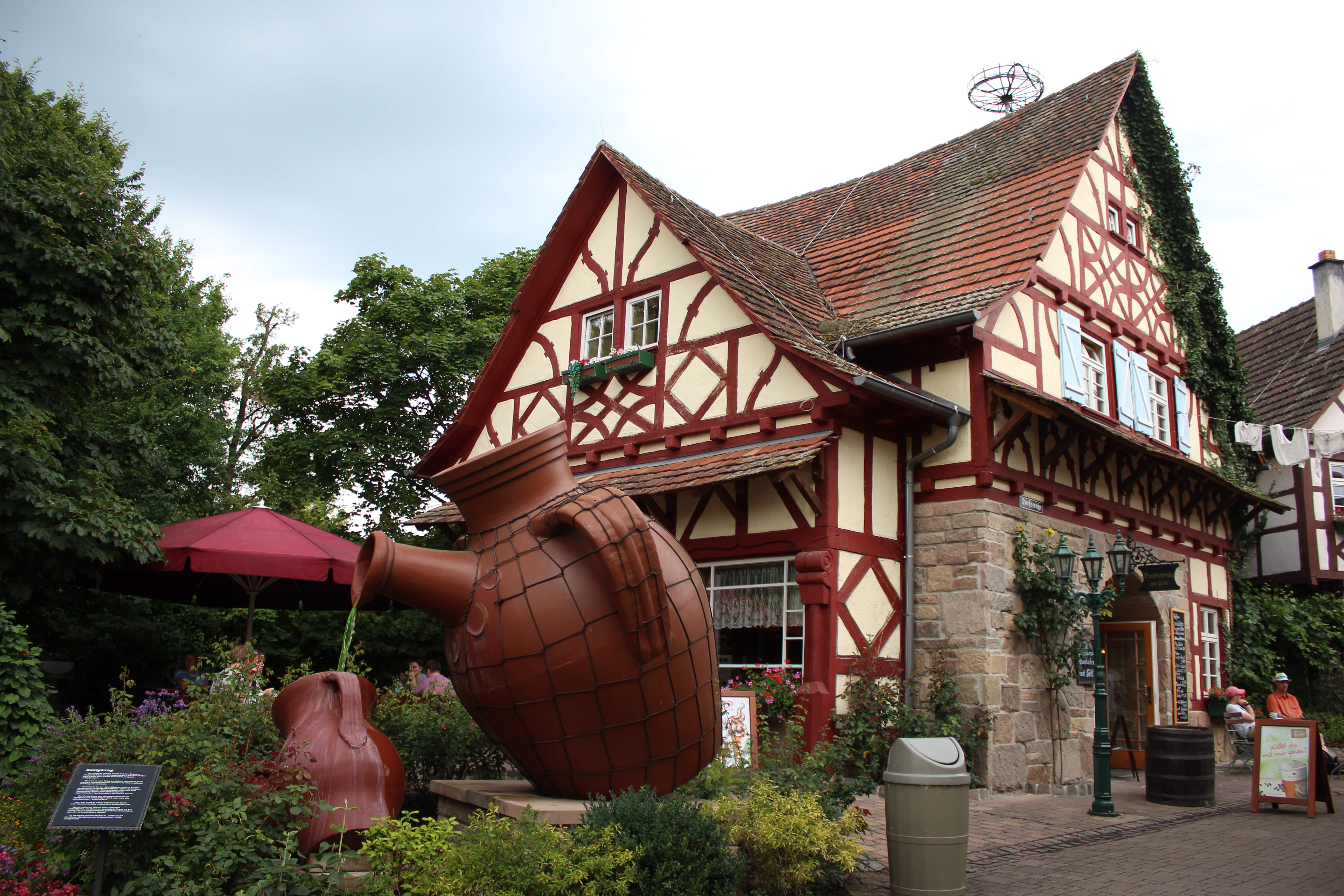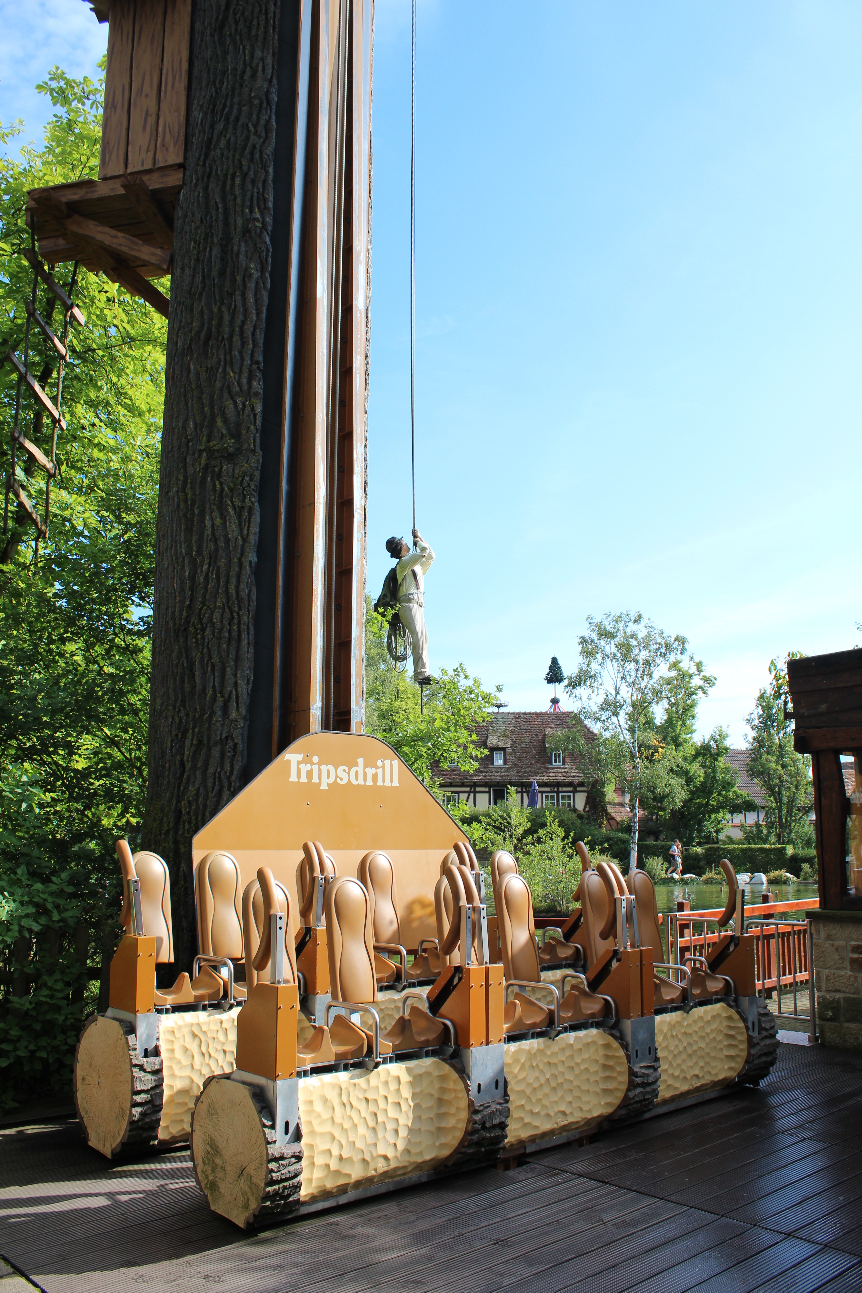 Den vorderen Bereich auf seine Attraktionen zu beschränken, wird dem Park jedoch nicht gerecht. Tripsdrill hat nämlich einen ganz speziellen Charme, der über die liebevolle Gestaltung der einzelnen Attraktionen hinausgeht. So ziert beispielsweise ein Plumpsklo im Gemüsebeet das Ende der Dorfstraße, wo man einem Opa bei der Verrichtung seiner Notdurft zuschauen kann. Alternativ kann man auf dem Heiratsmarkt über eine Leiter den Balkon seiner Angebeteten erklimmen und ihr den Hof machen. Klingt erstmal skurril, ist aber extrem witzig!
