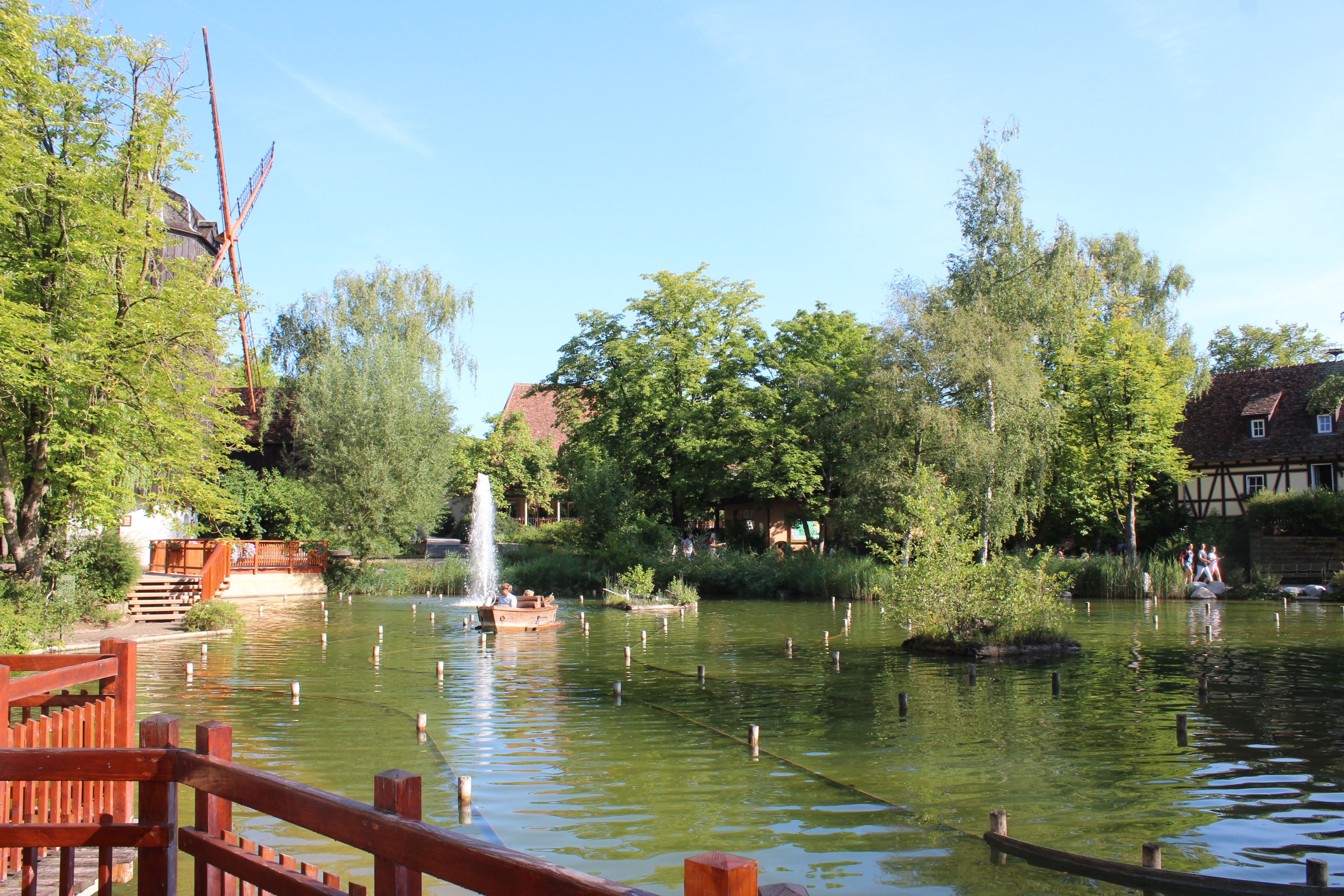 Da die Attraktionen im hinteren Parkbereich erst um 10:00 Uhr öffnen sollten, verbrachten wir die erste Stunde unseres Tripsdrill-Besuchs im vorderen (älteren) Parkbereich. Neben den bereits genannten Attraktionen bietet dieser Bereich insbesondere eine Reihe individuell thematisierter Flatrides und Themenfahrten, eine Mini-Wasserbahn für Kinder mit als Mehlsäcken gestalteten Booten sowie einen