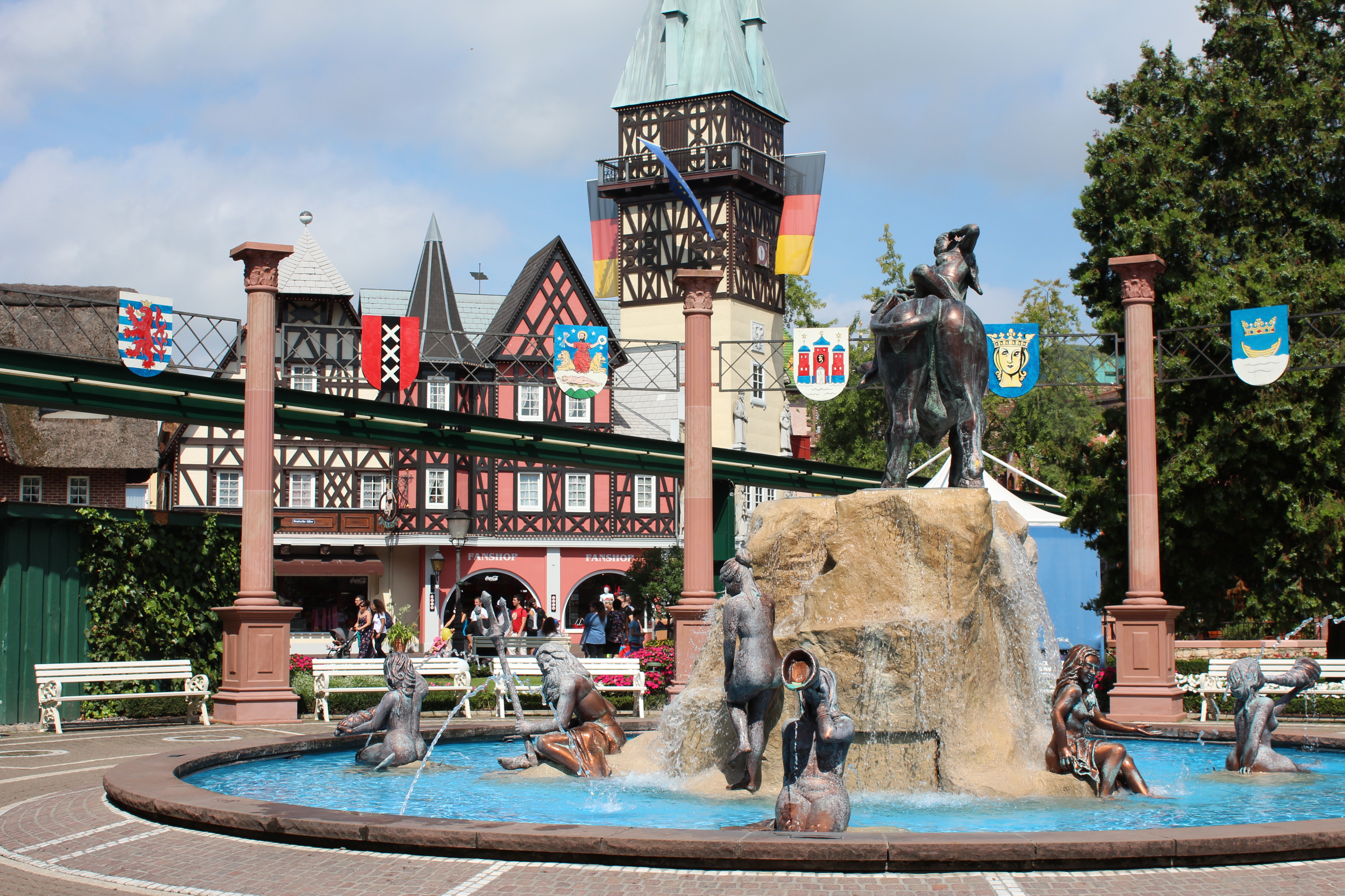 Passiert man den Eingangsbereich und die sich anschließende "Deutsche Allee" erwartet den Besucher der Europa-Brunnen mit seinen Wappen und Bronzestatuen.