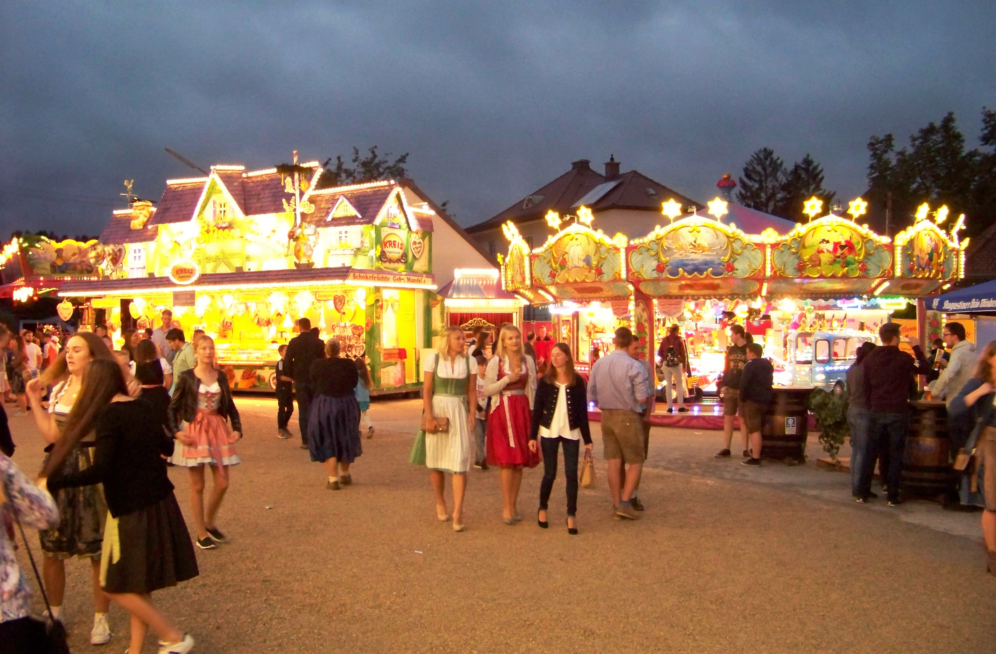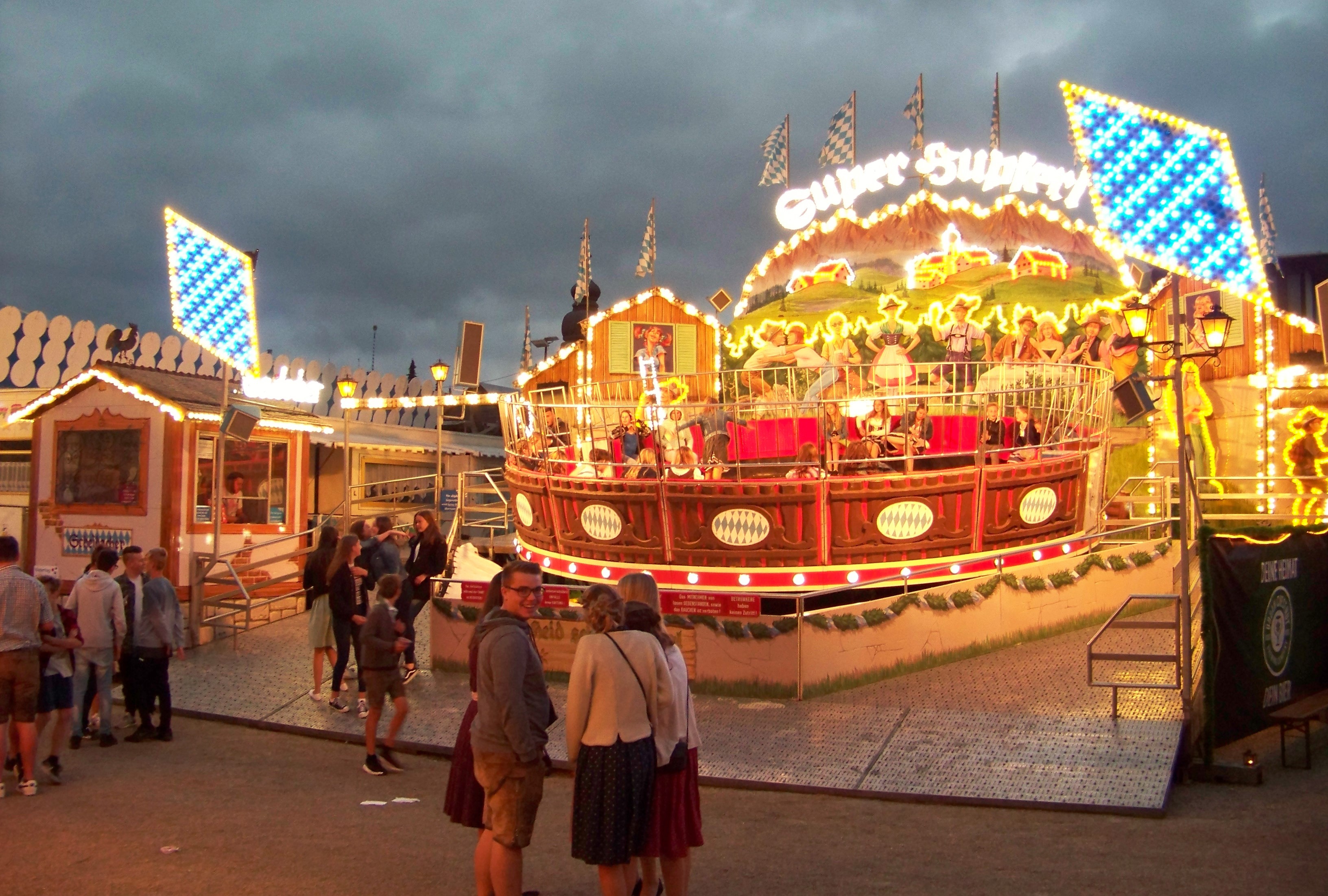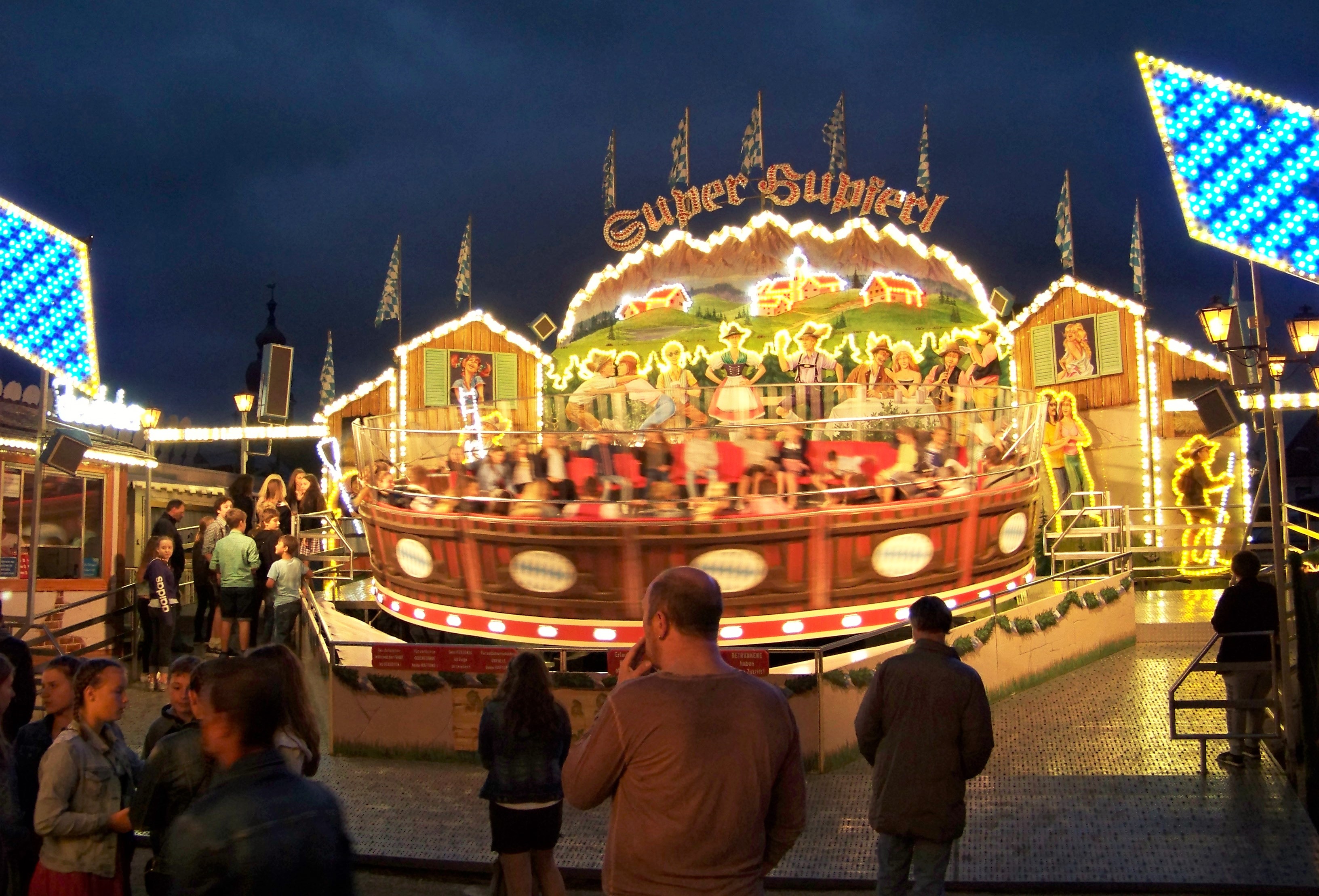 Da dankenswerter Weise der schon den ganzen Tag anhaltende Regen abends ausgesetzt hat, war in Wolnzach der Platz gut gefüllt und es herrschte eine deutlich bessere Stimmung als Tags zuvor in Kelheim, auch wenn der direkt in der Stadt gelegene Festplatz deutlich kleiner ist. Als größere Fahrgeschäfte befanden sich auf dem Platz ein Autoscooter von Fertsch (der Ex-Distel-Scooter) und Scheidachers Superhupferl, der hier von der Wolnzacher Jugend regelrecht gestürmt wurde.
