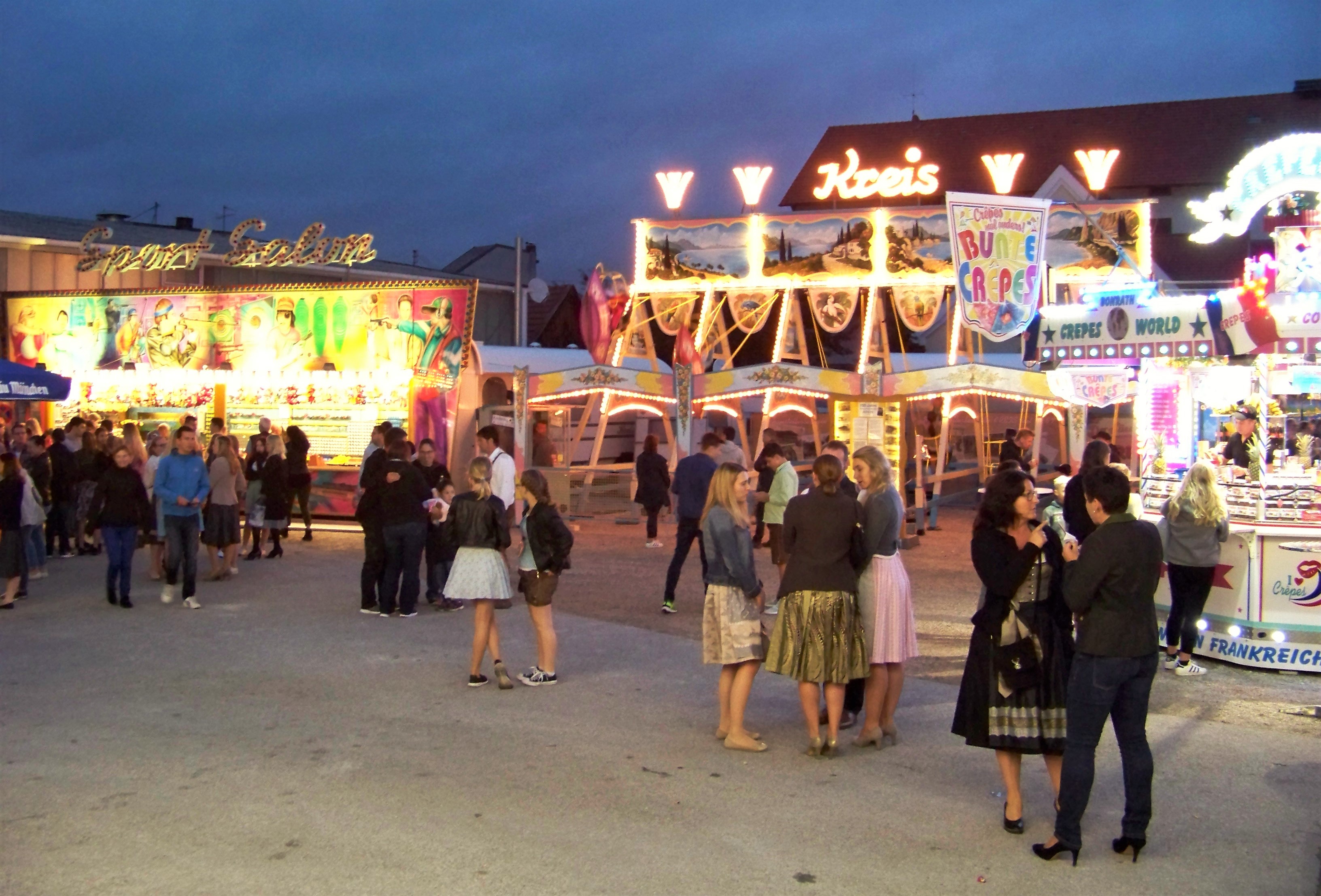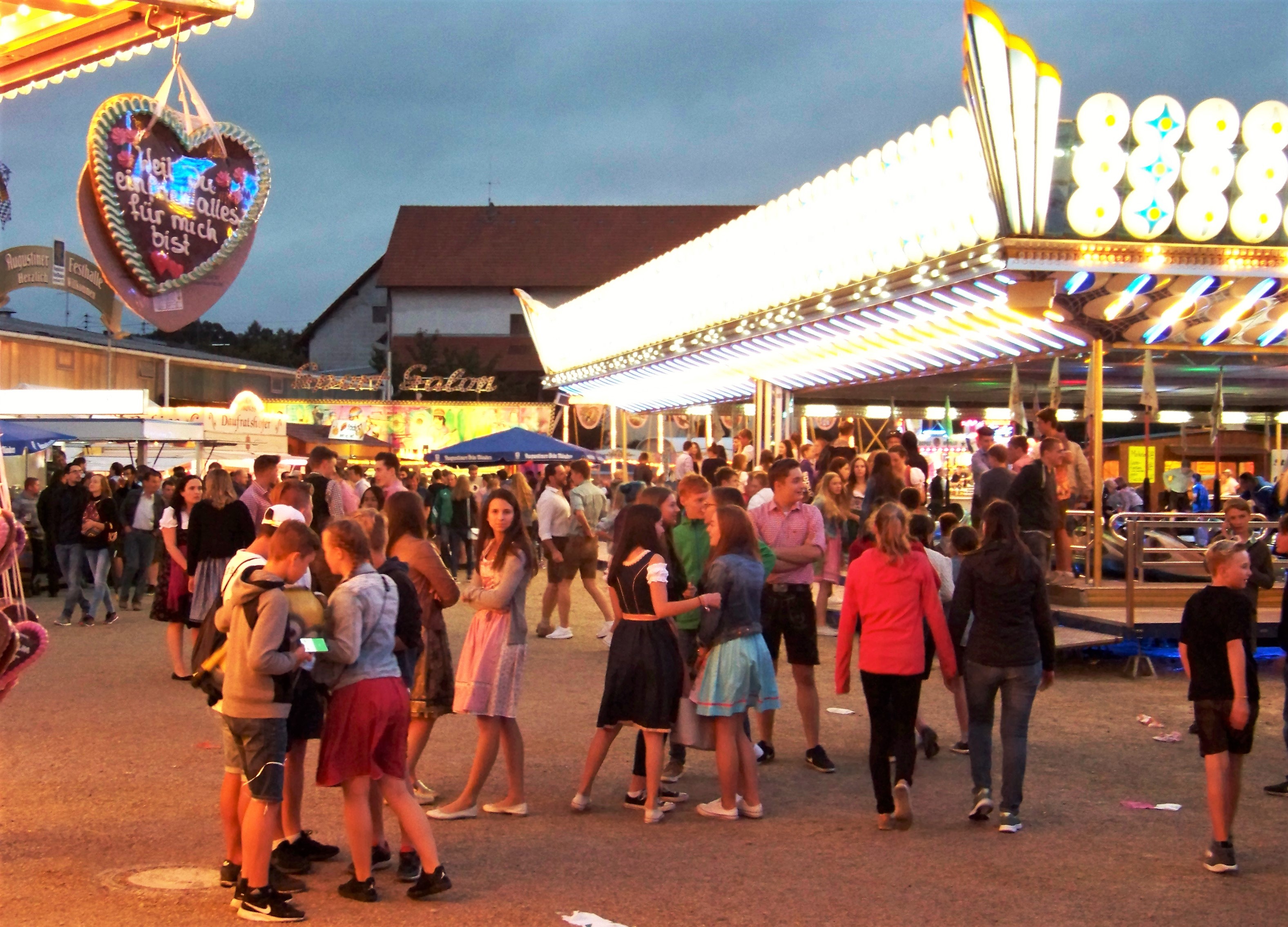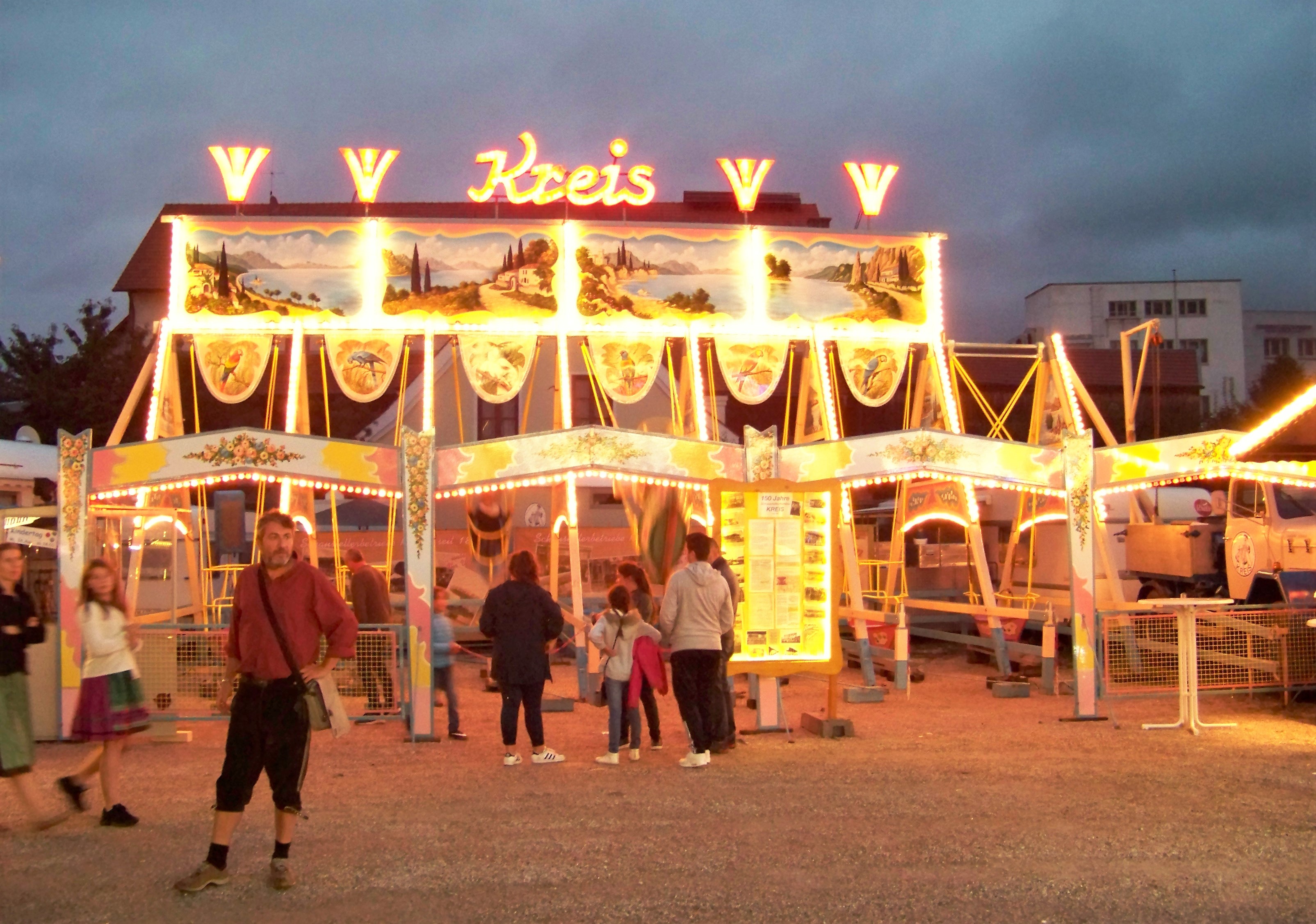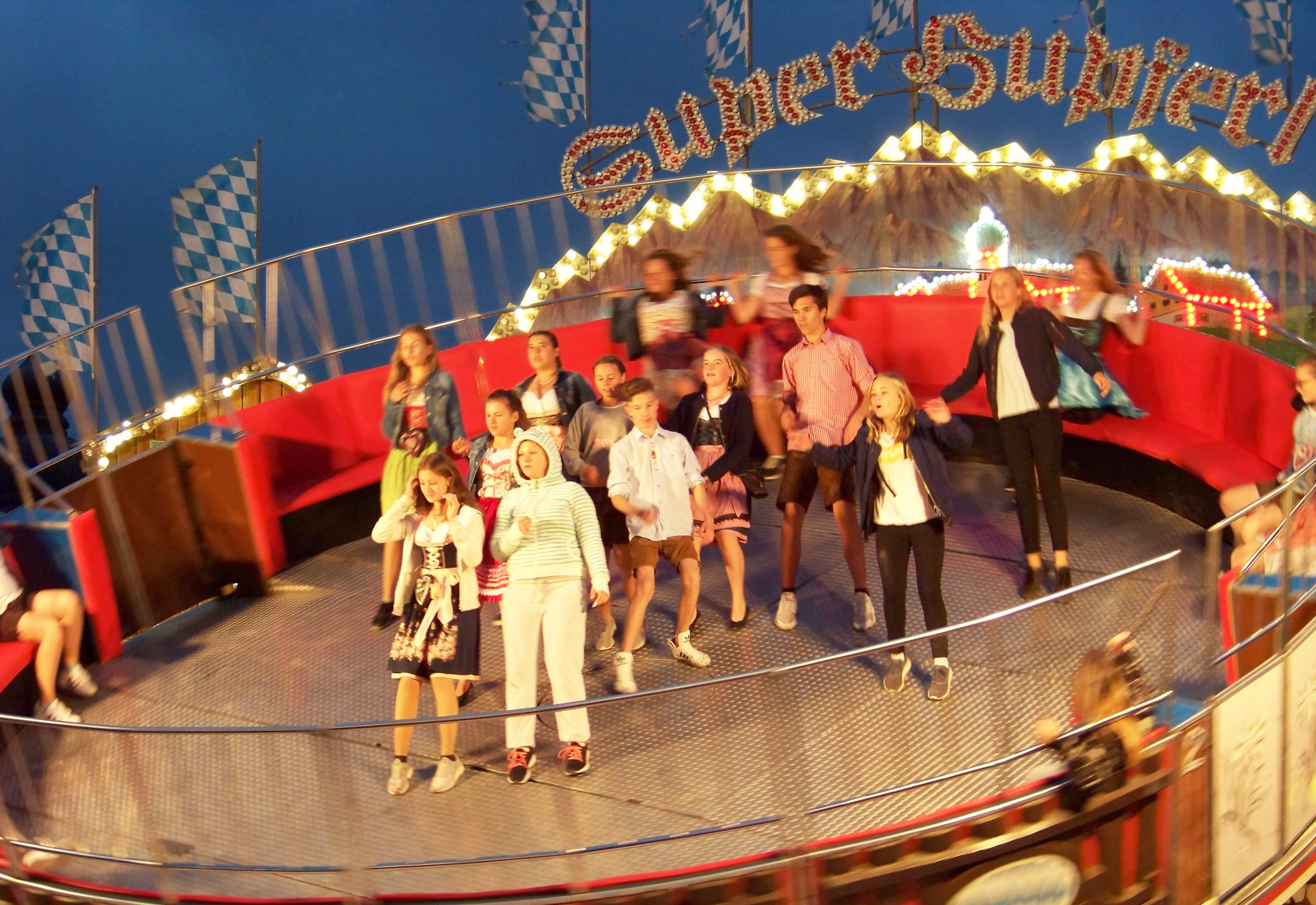 Da dankenswerter Weise der schon den ganzen Tag anhaltende Regen abends ausgesetzt hat, war in Wolnzach der Platz gut gefüllt und es herrschte eine deutlich bessere Stimmung als Tags zuvor in Kelheim, auch wenn der direkt in der Stadt gelegene Festplatz deutlich kleiner ist. Als größere Fahrgeschäfte befanden sich auf dem Platz ein Autoscooter von Fertsch (der Ex-Distel-Scooter) und Scheidachers Superhupferl, der hier von der Wolnzacher Jugend regelrecht gestürmt wurde.