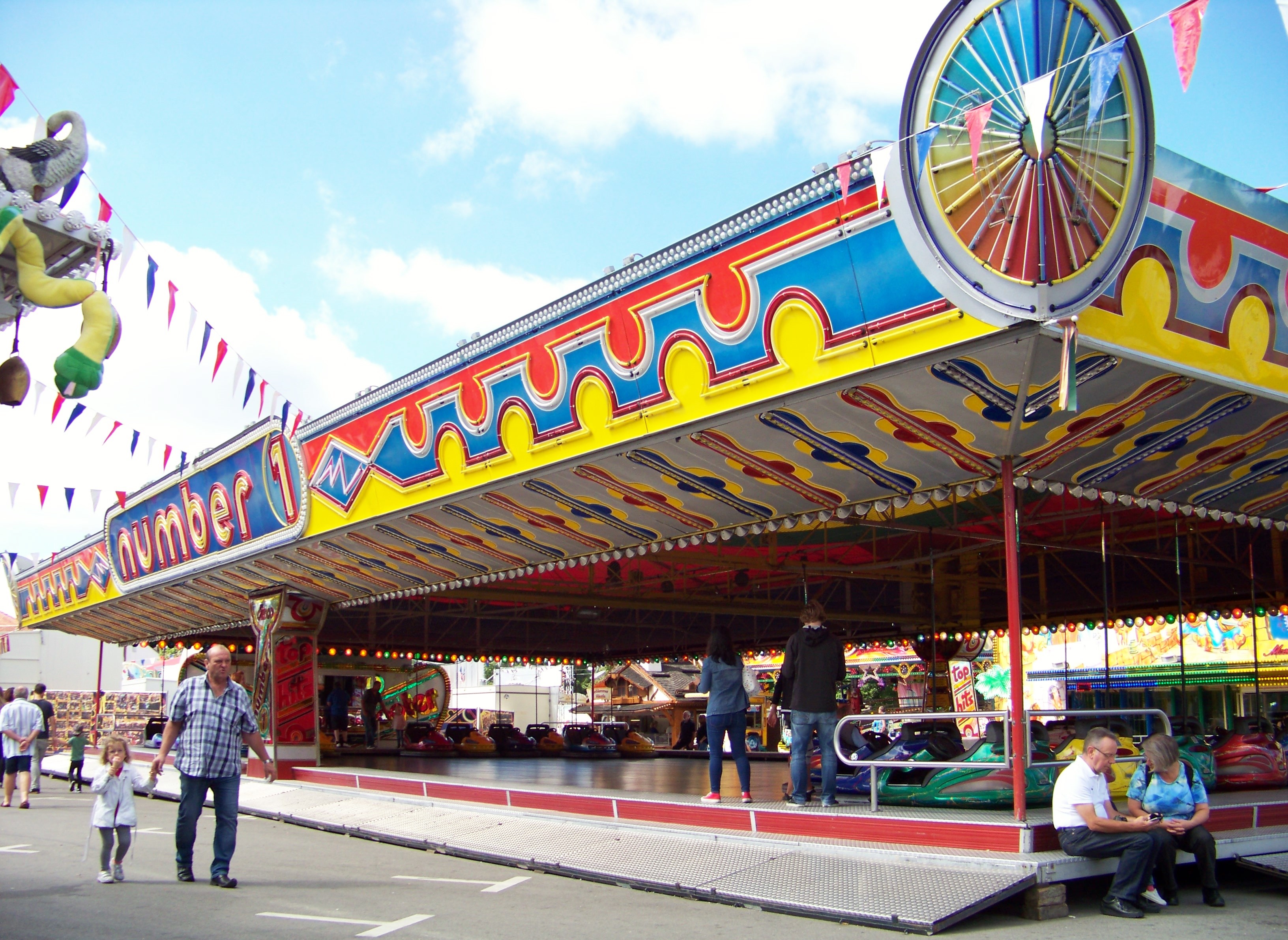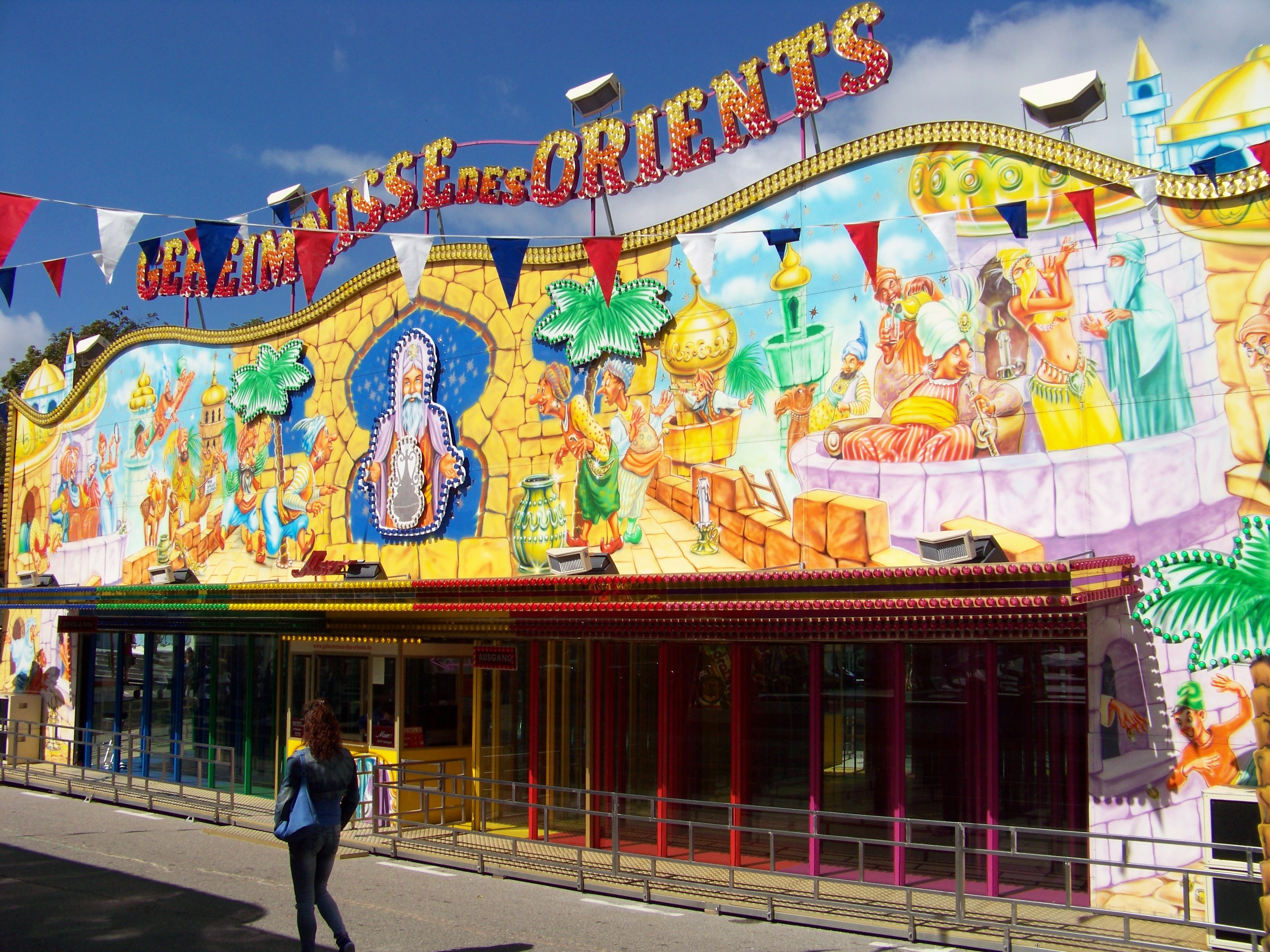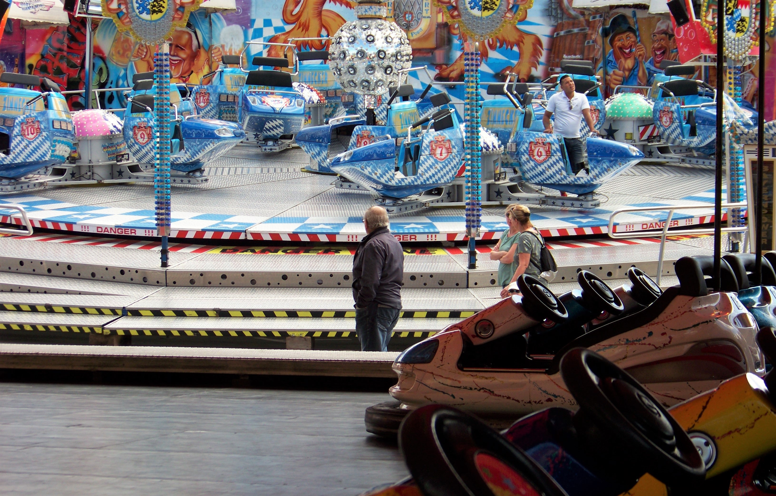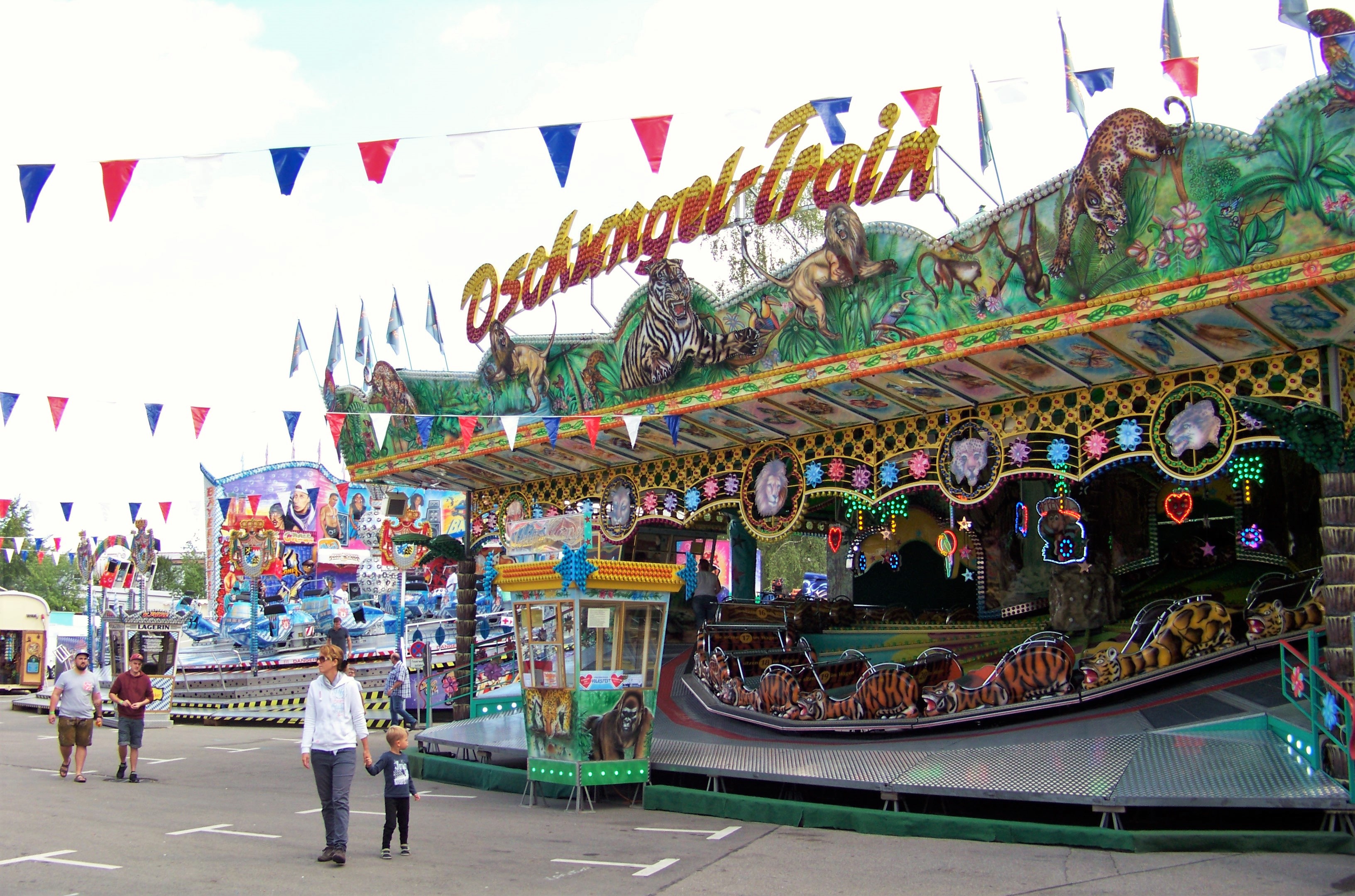 Was mich dann auf dem Friedberger Volksfest am Sonntagmorgen direkt bei Eröffnung erwartete, war zum einen natürlich noch kein überragender Besucherandrang, zum anderen jedoch ein sehr schönes, als kompakter Rundlauf angelegtes, klassisches bayrisches Volksfest. Ironischerweise stammten gleich zwei der Großfahrgeschäfte vor Ort von Schaustellern, die in bzw. direkt an der hessischen Grenze (allerdings nicht in Bayern) ihren Firmensitz haben: der Bayern Breaker von Lagerin und der Dschungel Train, der mir unter Scheele hier zum ersten Mal begegnet war. Auch in Sachen Autoscooter setzte man in Friedberg nicht auf einen regionalen Schausteller (ganz zu schweigen von der saarländischen Kinderschleife auf dem Platz): hier stand die Number 1 von Haas aus Karlsruhe. Ergänzt wurde die Beschickung durch den Kettenflieger von Schwenold und Stey und das Laufgeschäft „Geheimnisse des Orients“ von Moser.