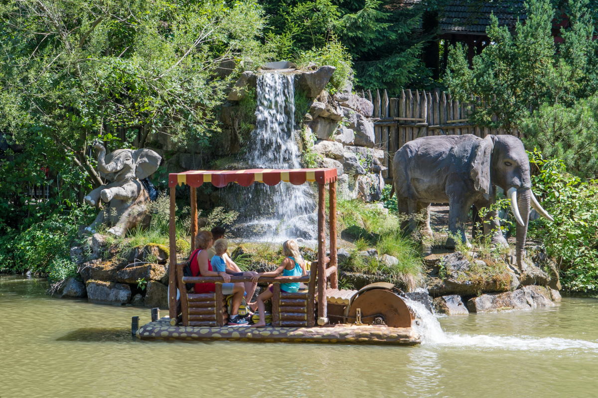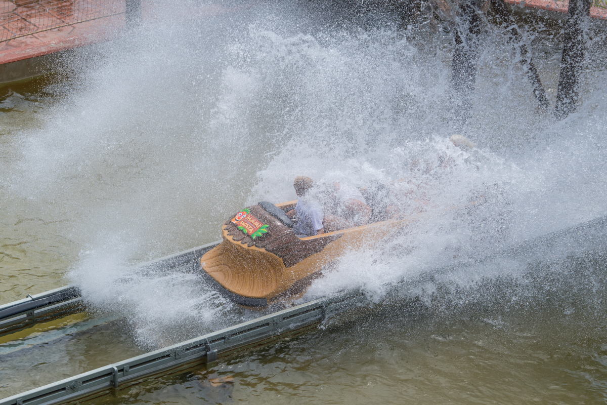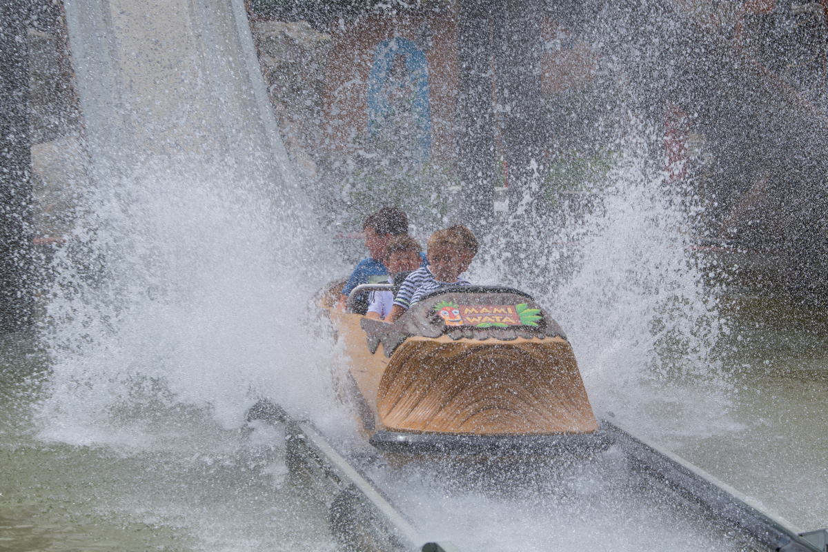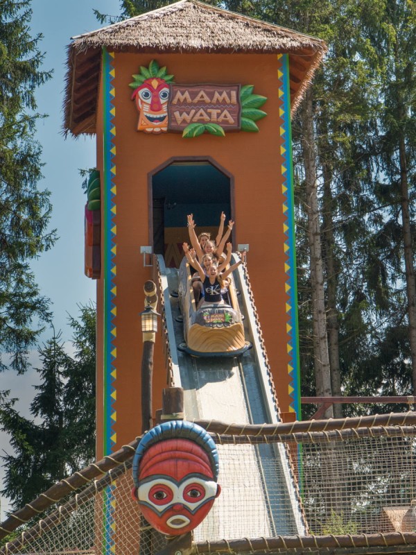 Die Wasserbahn Mami Wata mit afrikanischer Thematisierung beinhaltet auch einen Rückwärtsfahrt…