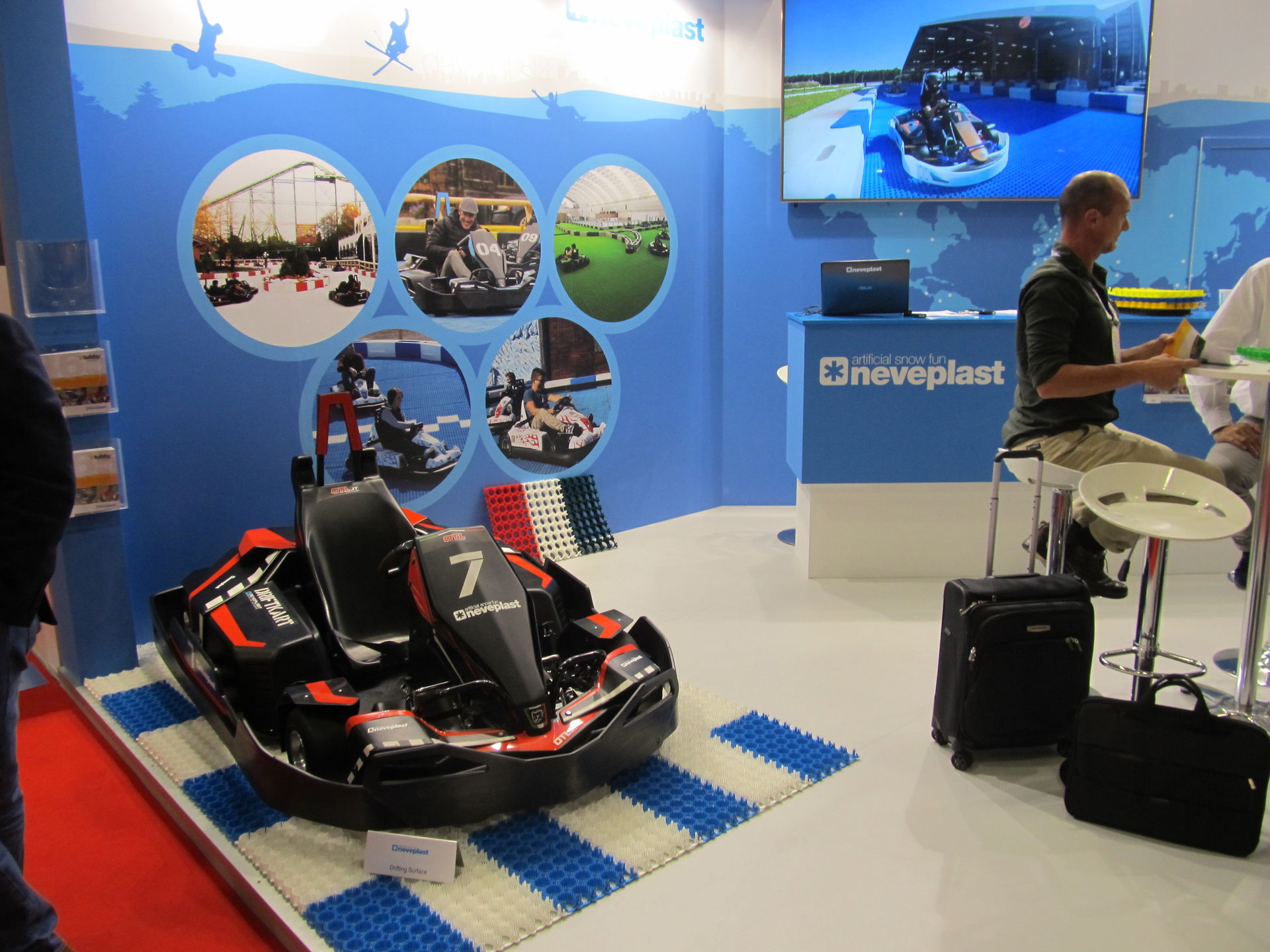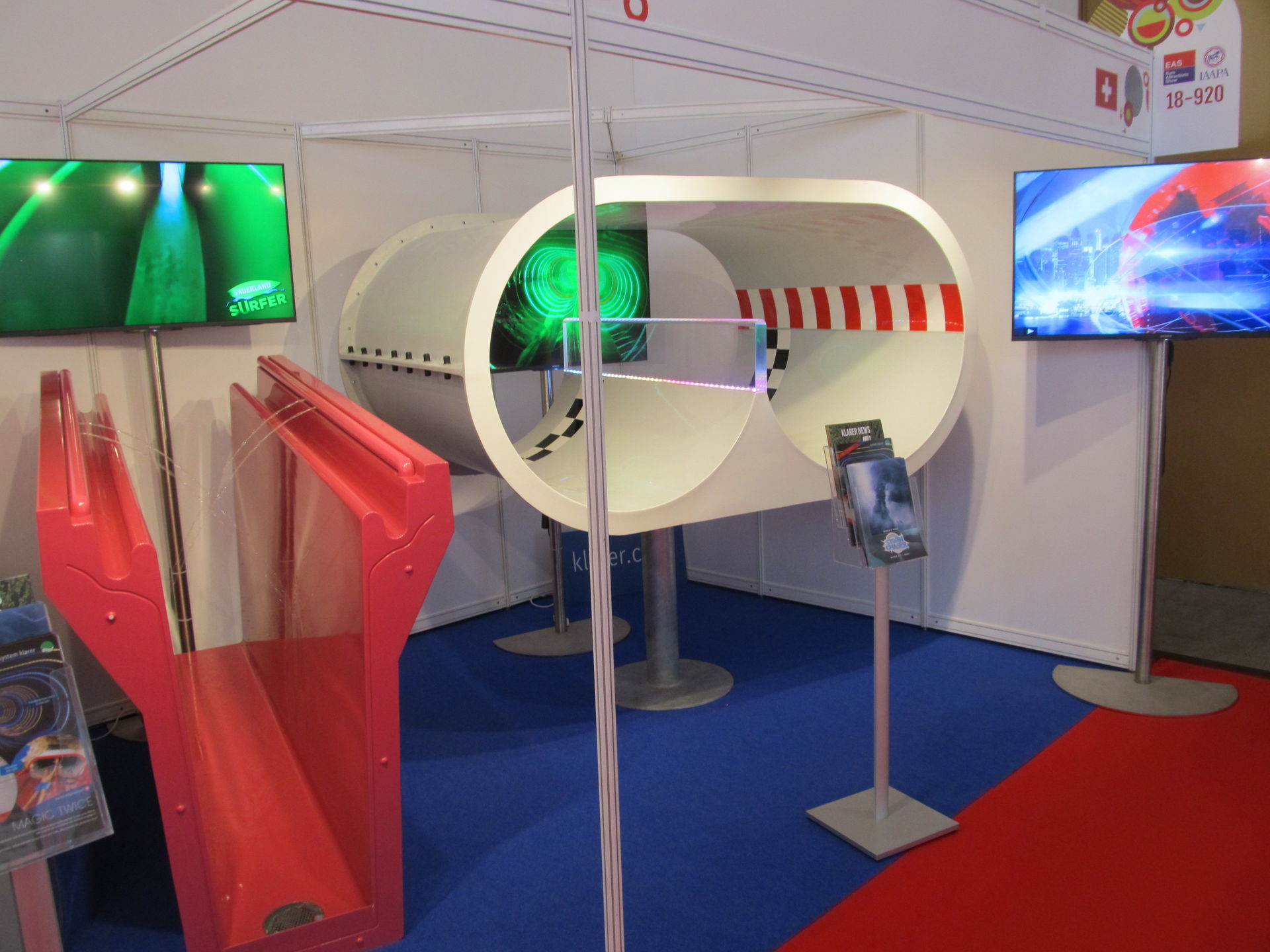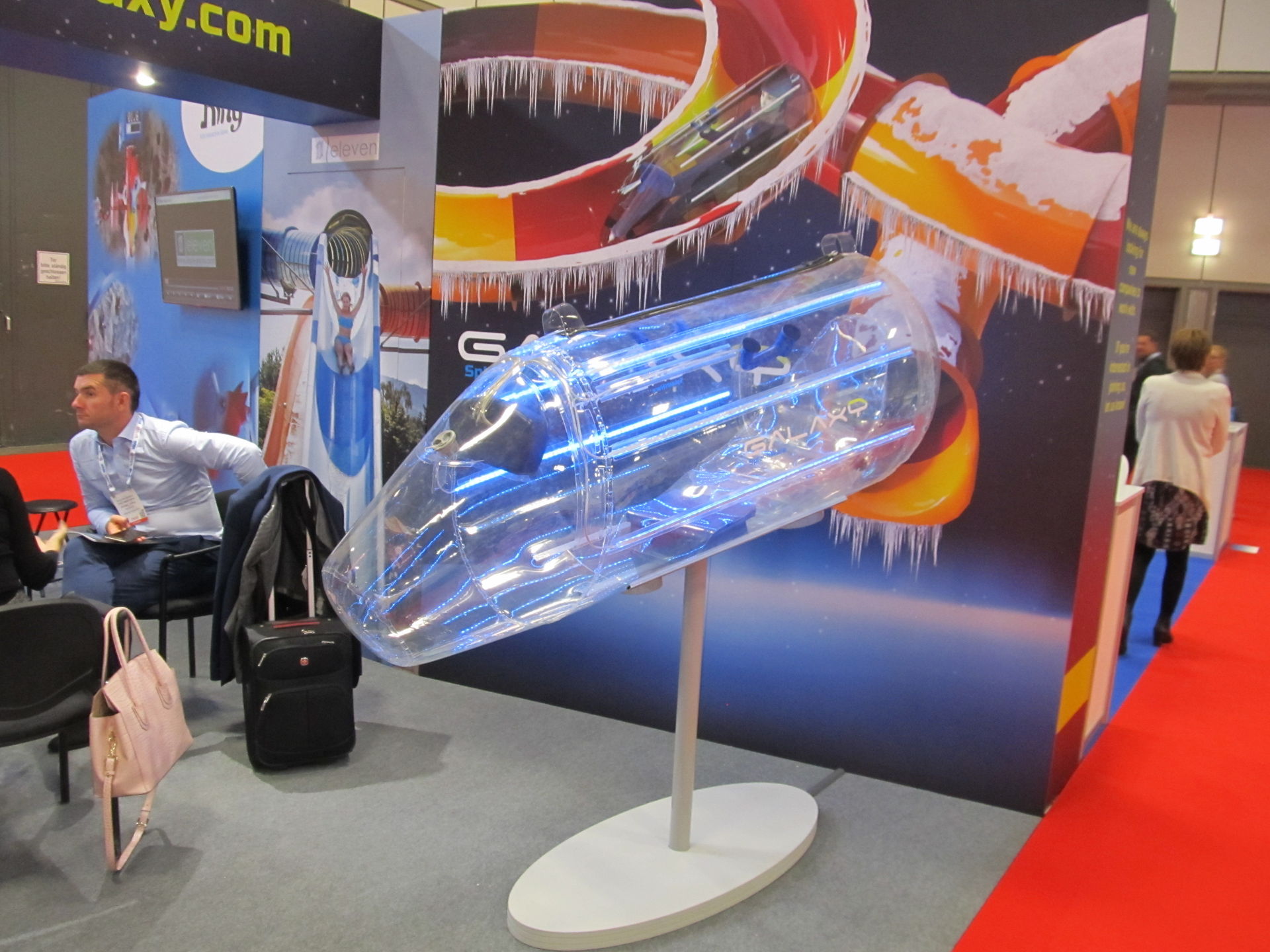 Auch Klarer war vertreten und hatte am Stand wieder die bekannten Ausstellungsstücke. Das eigentlich Interessante lief auf dem Bildschirm: Es wurde nämlich ein neuer Rutschentyp präsentiert, bei dem von einer Turbine in der Röhre ein künstlicher Sturm erzeugt wird, was die Rutschfahrt noch einmal spannender macht. Und genau so eine Rutsche wird man wohl schon nächstes Jahr mitten in Deutschland erleben können...