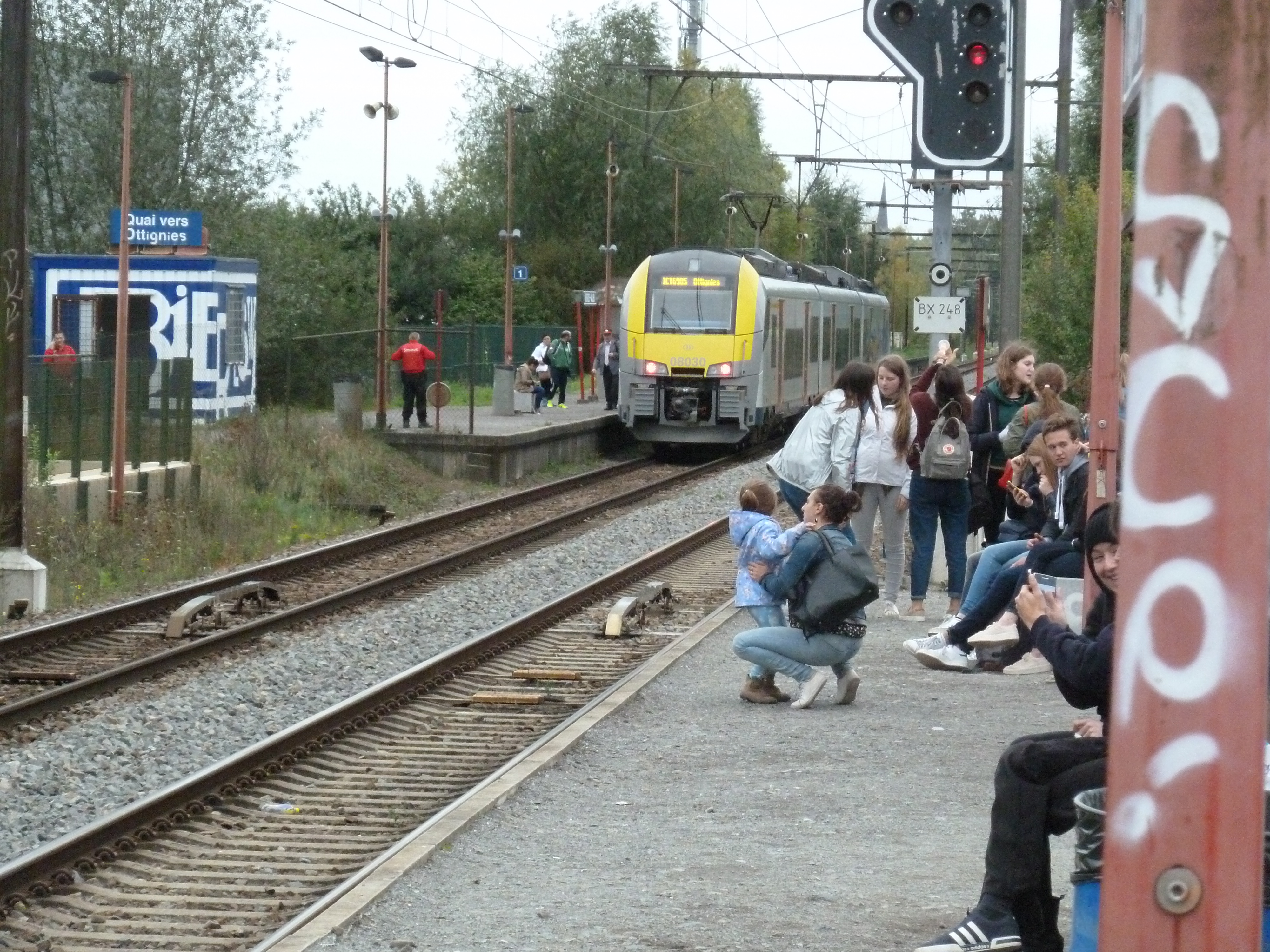 Hier die Bahnstation BIERGES-WALIBI, aufgepasst, Linksverkehr der Züge, abends zurück nach Louven bitte auf Bahnsteig 2 einsteigen, der Zug im Bild fährt linksspurig nach Ottignies von Bahnsteig 1