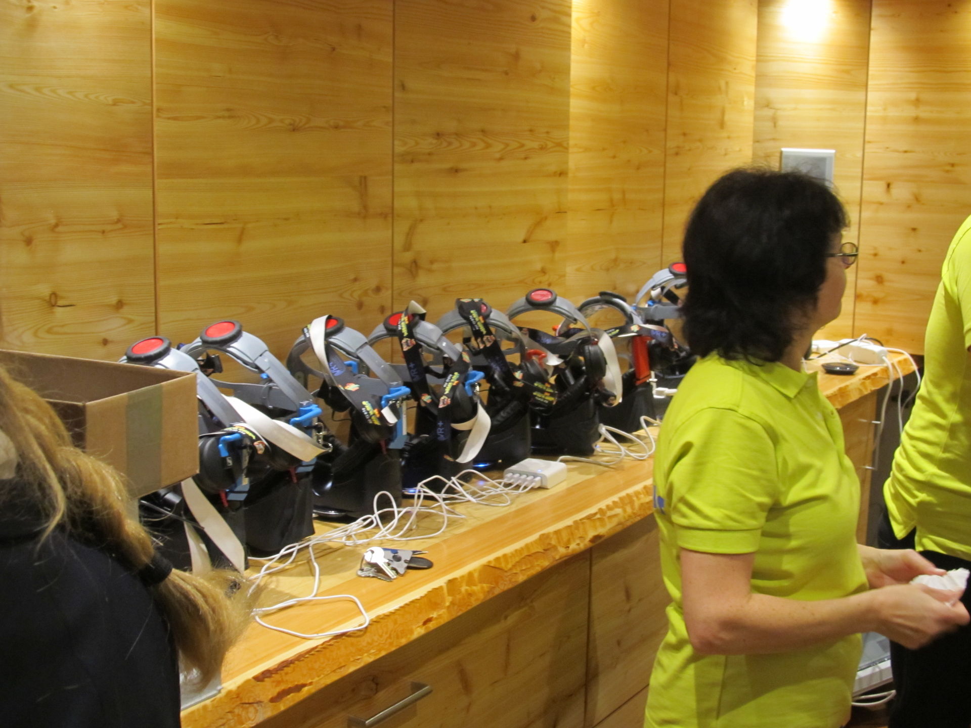 Im Wagen sitzend werden die Brillen mit Blick nach vorne aufgezogen. Dabei fällt direkt die neue Halterung der Brillen mit integrierten Kopfhörern auf. Hier muss nicht viel vor dem Einsteigen eingestellt werden, sondern nur schnell die Brille übergestülpt und hinten das Verschlussrädchen zugedreht werden. Das funktioniert sehr gut und schnell, so dass es zu keinen großen Verzögerungen durch das Anlegen der VR-Brillen kommt. Zusätzlich werden die Brillen noch durch ein Schlüsselband um den Hals gesichert und schon kann die virtuelle Fahrt starten.