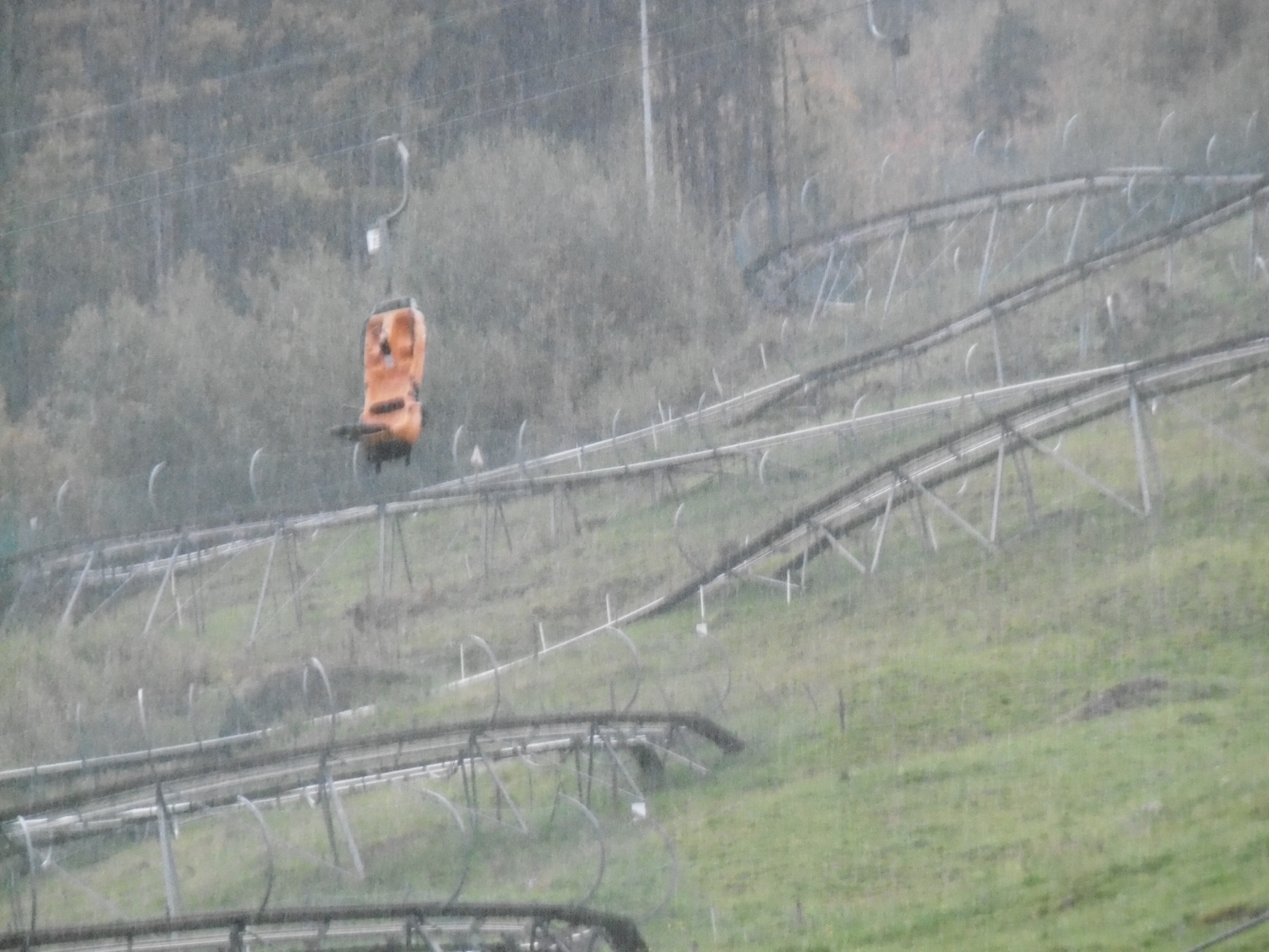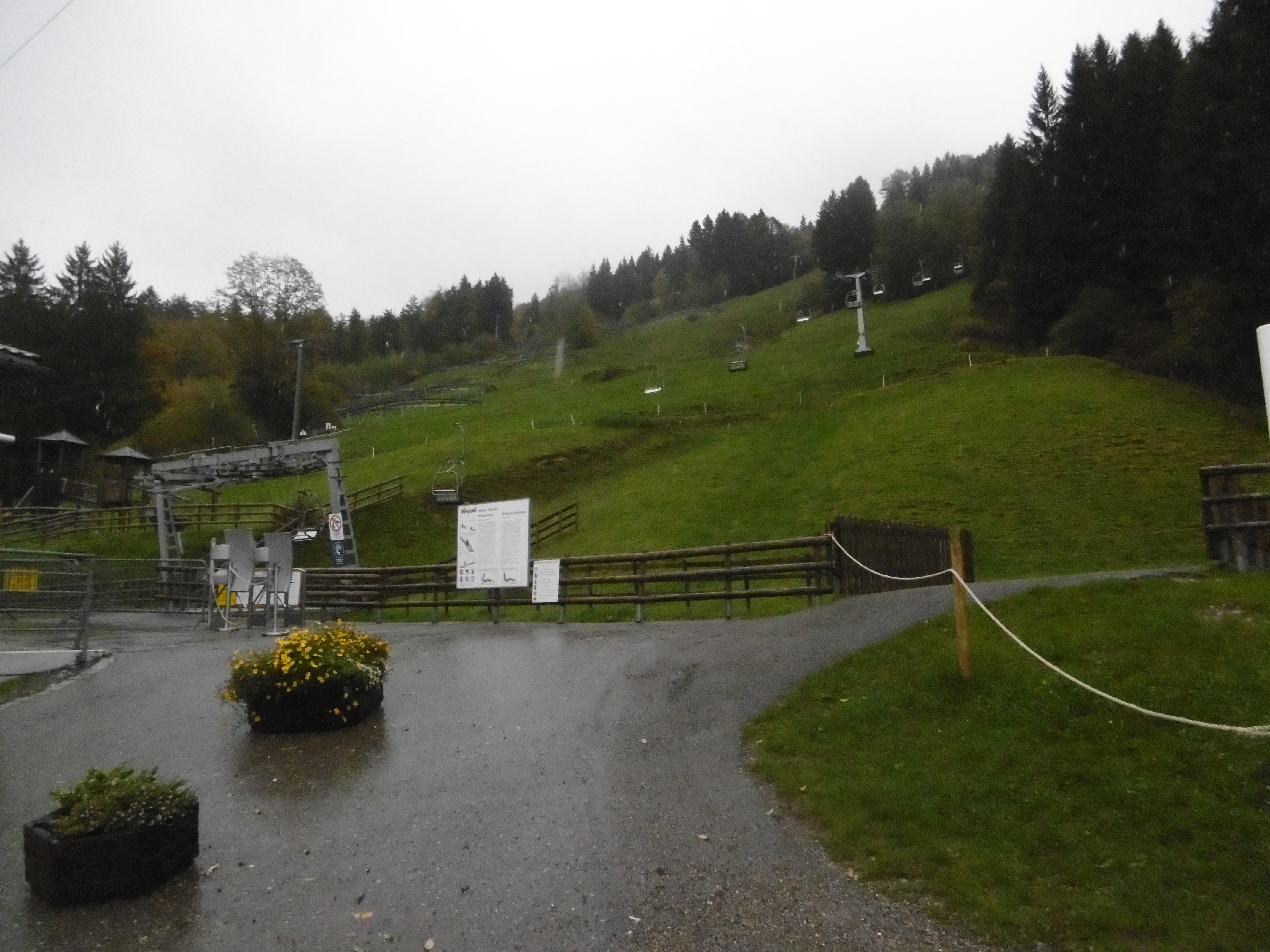 Beim Alpsee Coaster standen immerhin ein paar Autos auf dem Parkplatz. Auf dem Bild sind in keinster Weise die Wassermengen zu sehen, die zu dem Zeitpunkt herunterregneten.