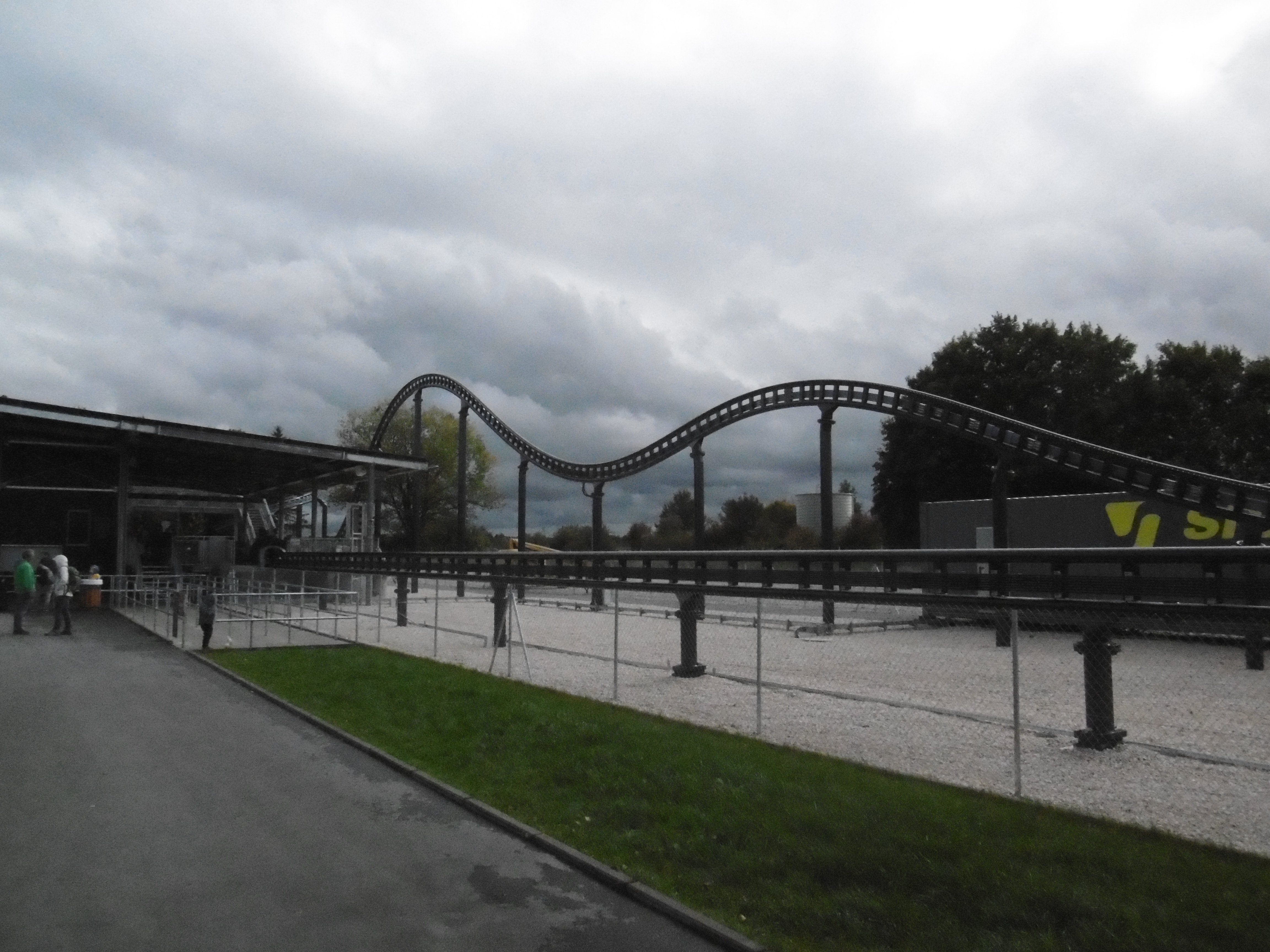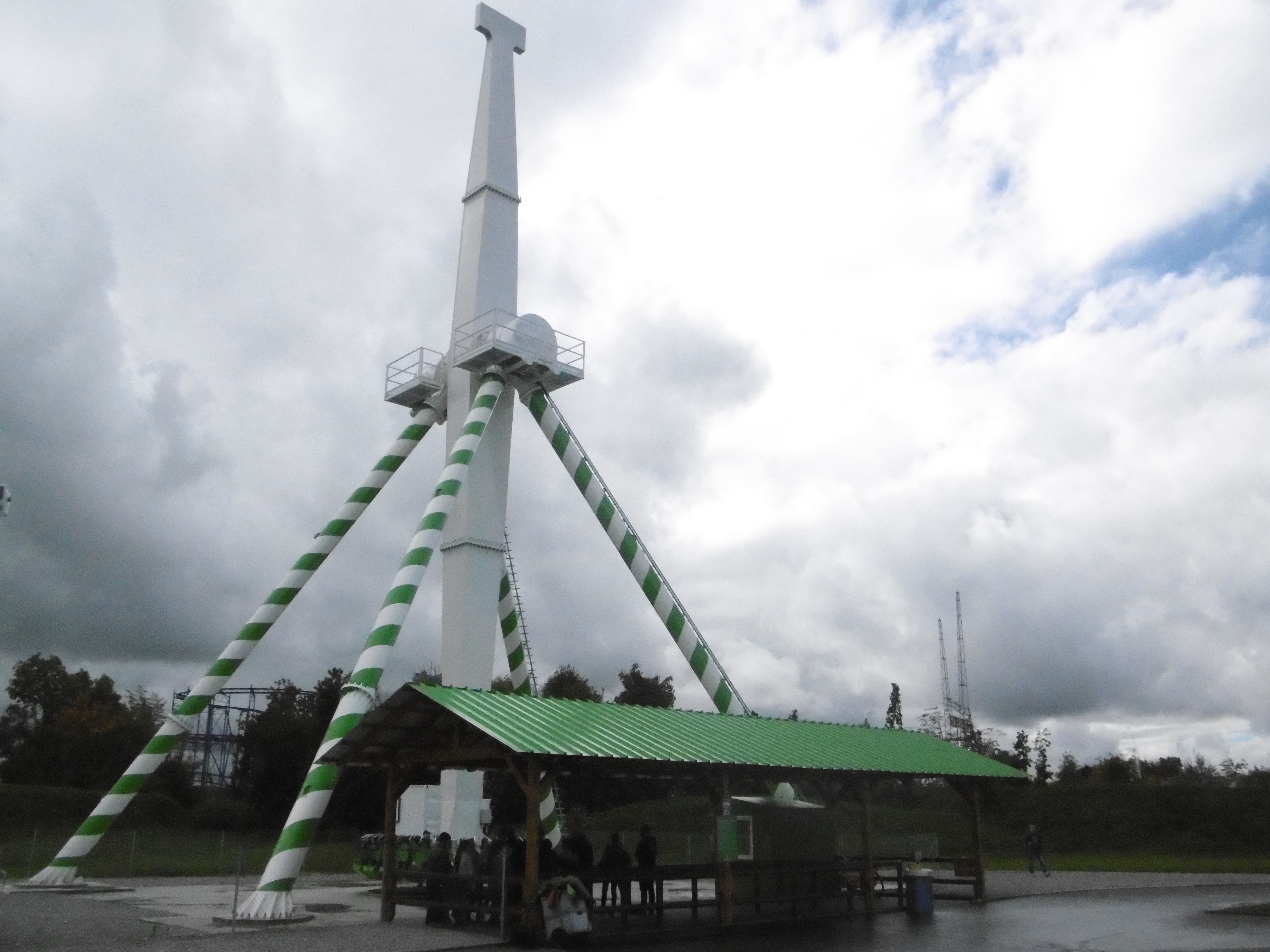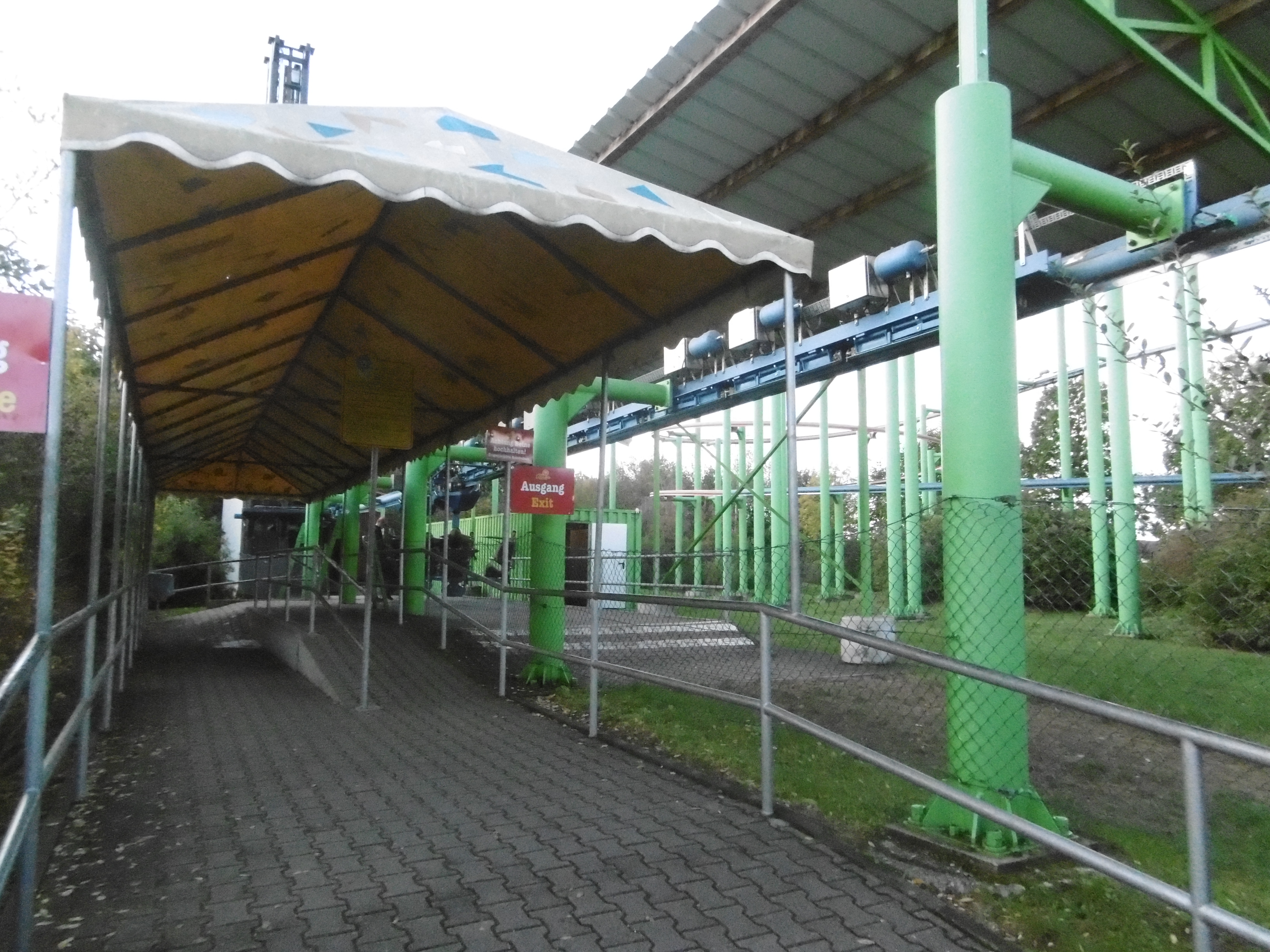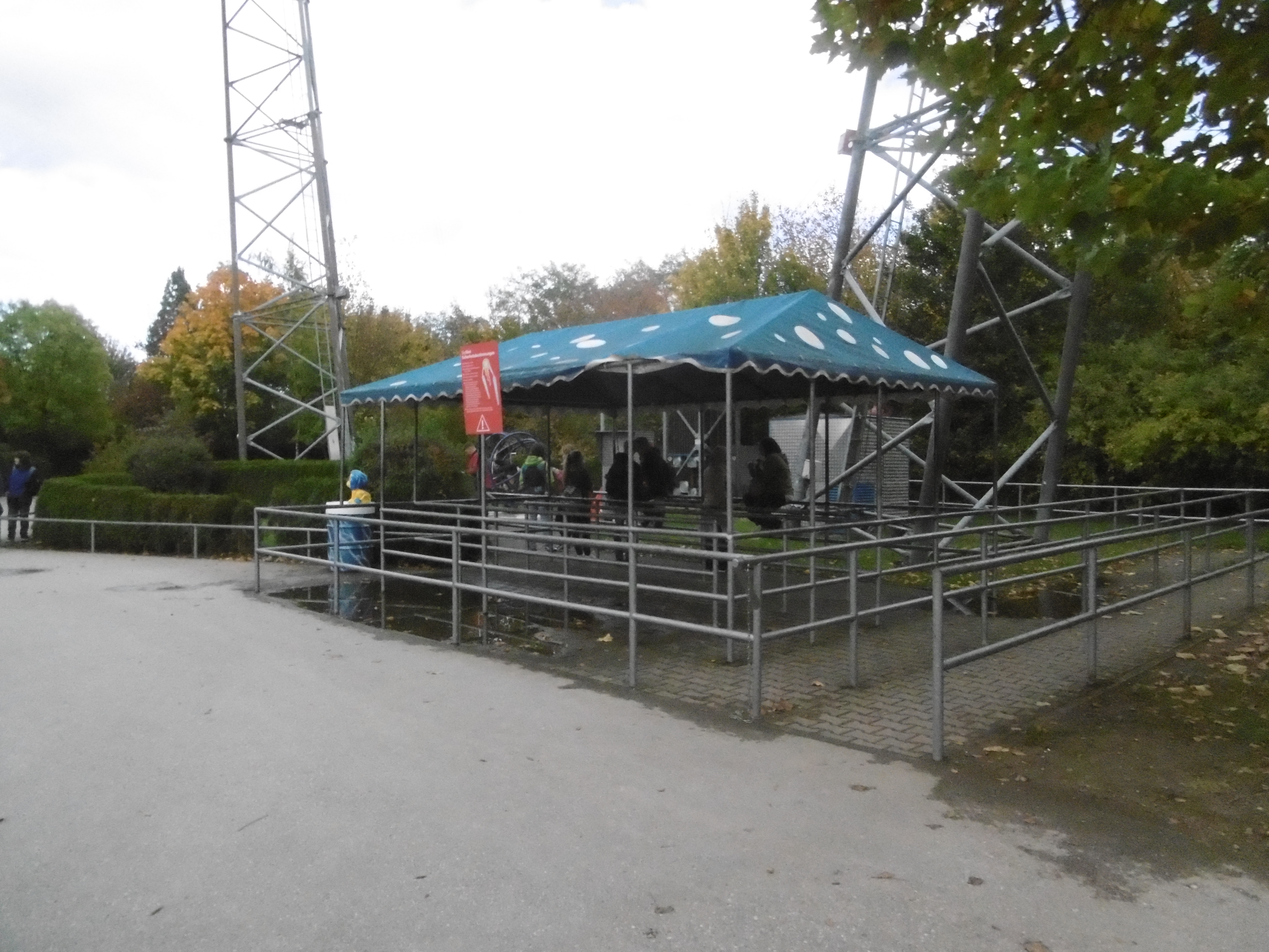 Da der Himmel zunächst noch sehr zugezogen war und später wieder, sind manche Bilder leider etwas dunkel und unscharf. Um kurz nach 12 traf ich auf dem Parkplatz ein, auf dem grob geschätzt vielleicht 50 Autos und drei Busse standen. Am Morgen haben mich meine Verwandten noch bemitleidet ob des schlechten Wetters, worauf ich entgegnete, dass dies nur gut für mich (und schlecht für den Park) sein kann. So machten sich der Jonas und meine Wenigkeit auf den Weg durch den sehr leeren Park. Zwar mit Plan ausgestattet, liefen wir einfach mal ohne Wegkenntnis darauf los. Beschilderungen sind im Park leider etwas Mangelware. Irgendwann standen wir dann vor den Schienen des Sky Riders. Da wir aber die falsche Abzweigung wählten standen wir dann auf einmal vor zwei stählernen Stützen mit vier herunterhängenden Seilen daran.