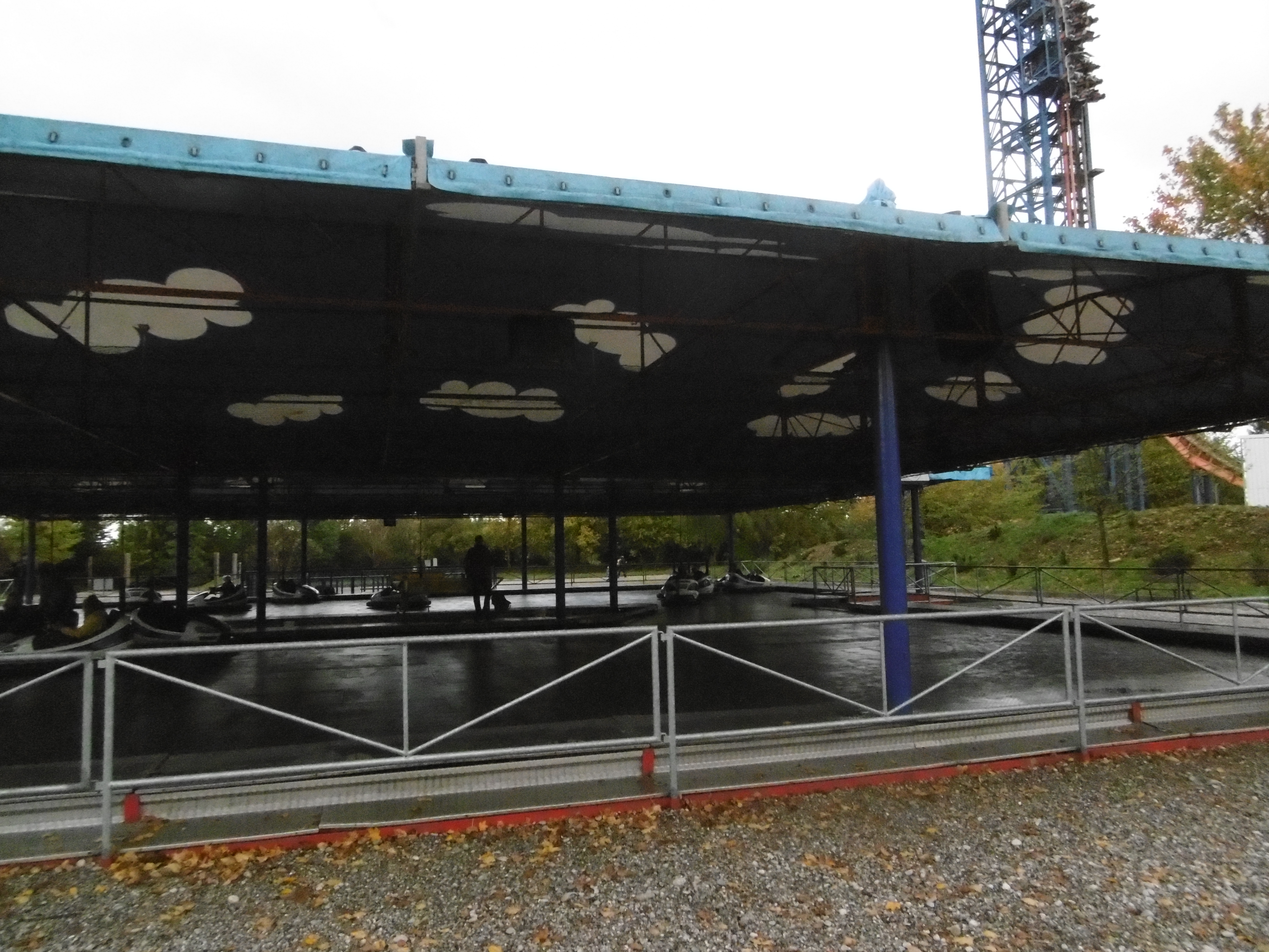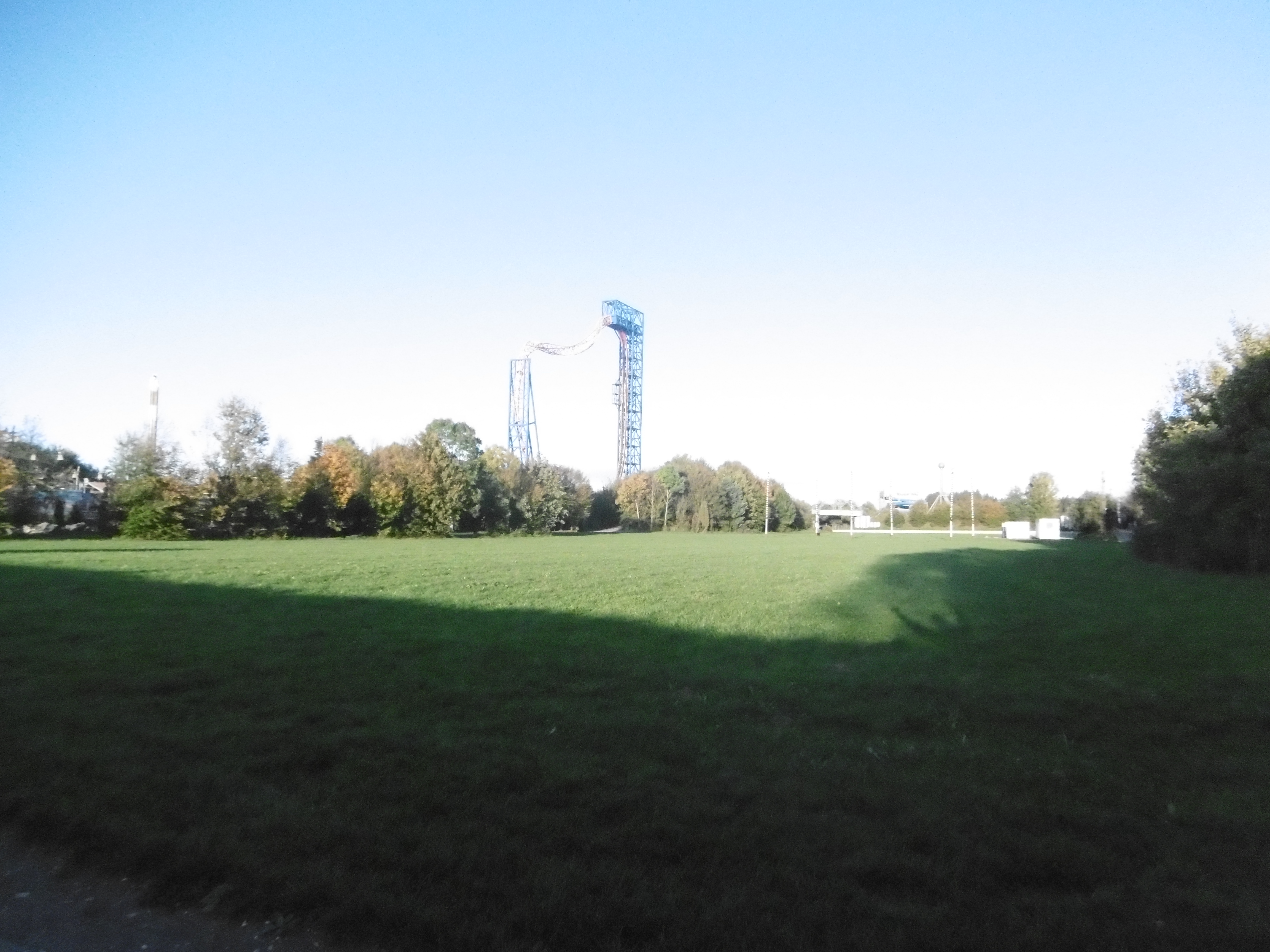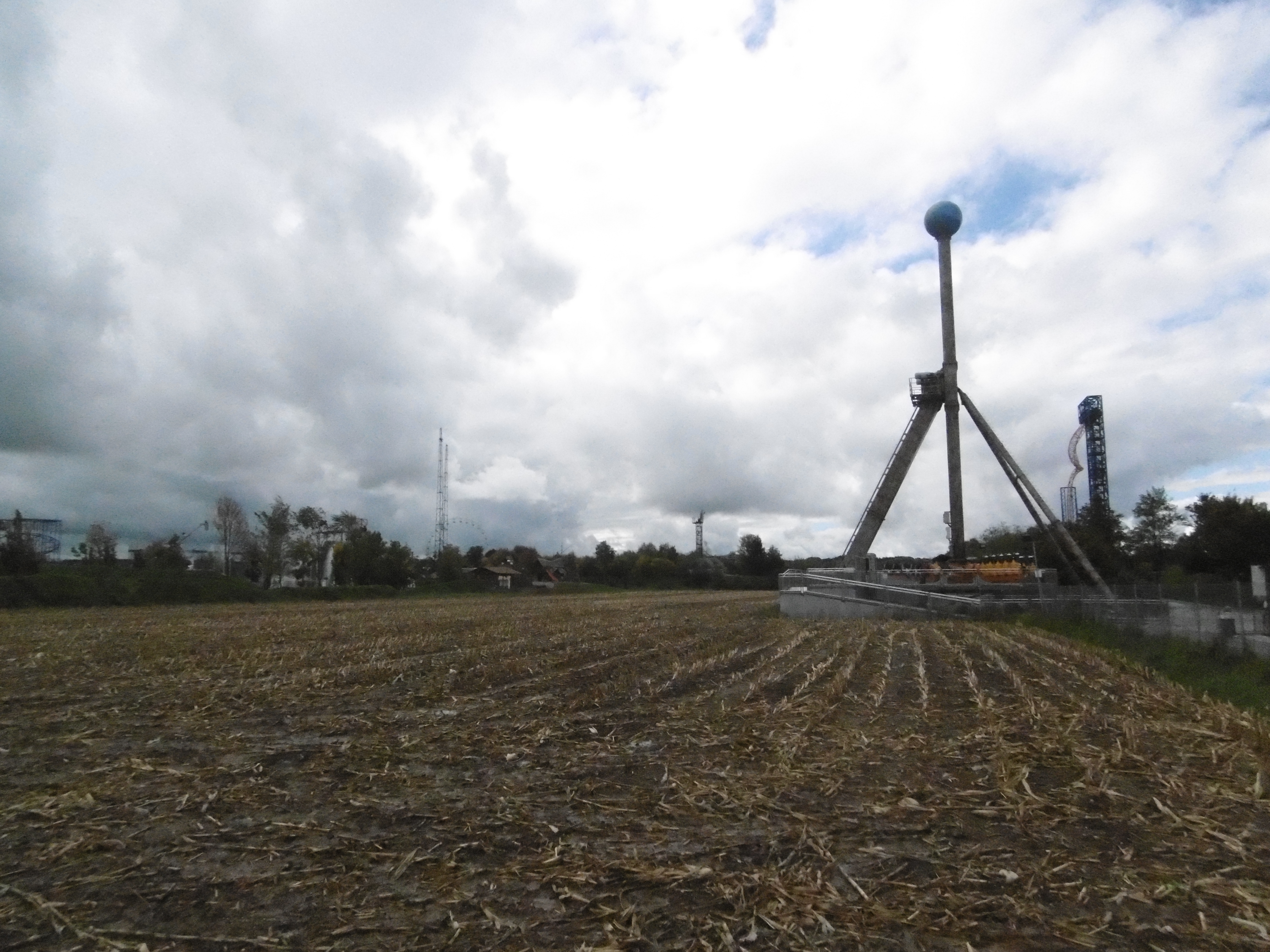 Da der Himmel zunächst noch sehr zugezogen war und später wieder, sind manche Bilder leider etwas dunkel und unscharf. Um kurz nach 12 traf ich auf dem Parkplatz ein, auf dem grob geschätzt vielleicht 50 Autos und drei Busse standen. Am Morgen haben mich meine Verwandten noch bemitleidet ob des schlechten Wetters, worauf ich entgegnete, dass dies nur gut für mich (und schlecht für den Park) sein kann. So machten sich der Jonas und meine Wenigkeit auf den Weg durch den sehr leeren Park. Zwar mit Plan ausgestattet, liefen wir einfach mal ohne Wegkenntnis darauf los. Beschilderungen sind im Park leider etwas Mangelware. Irgendwann standen wir dann vor den Schienen des Sky Riders. Da wir aber die falsche Abzweigung wählten standen wir dann auf einmal vor zwei stählernen Stützen mit vier herunterhängenden Seilen daran.