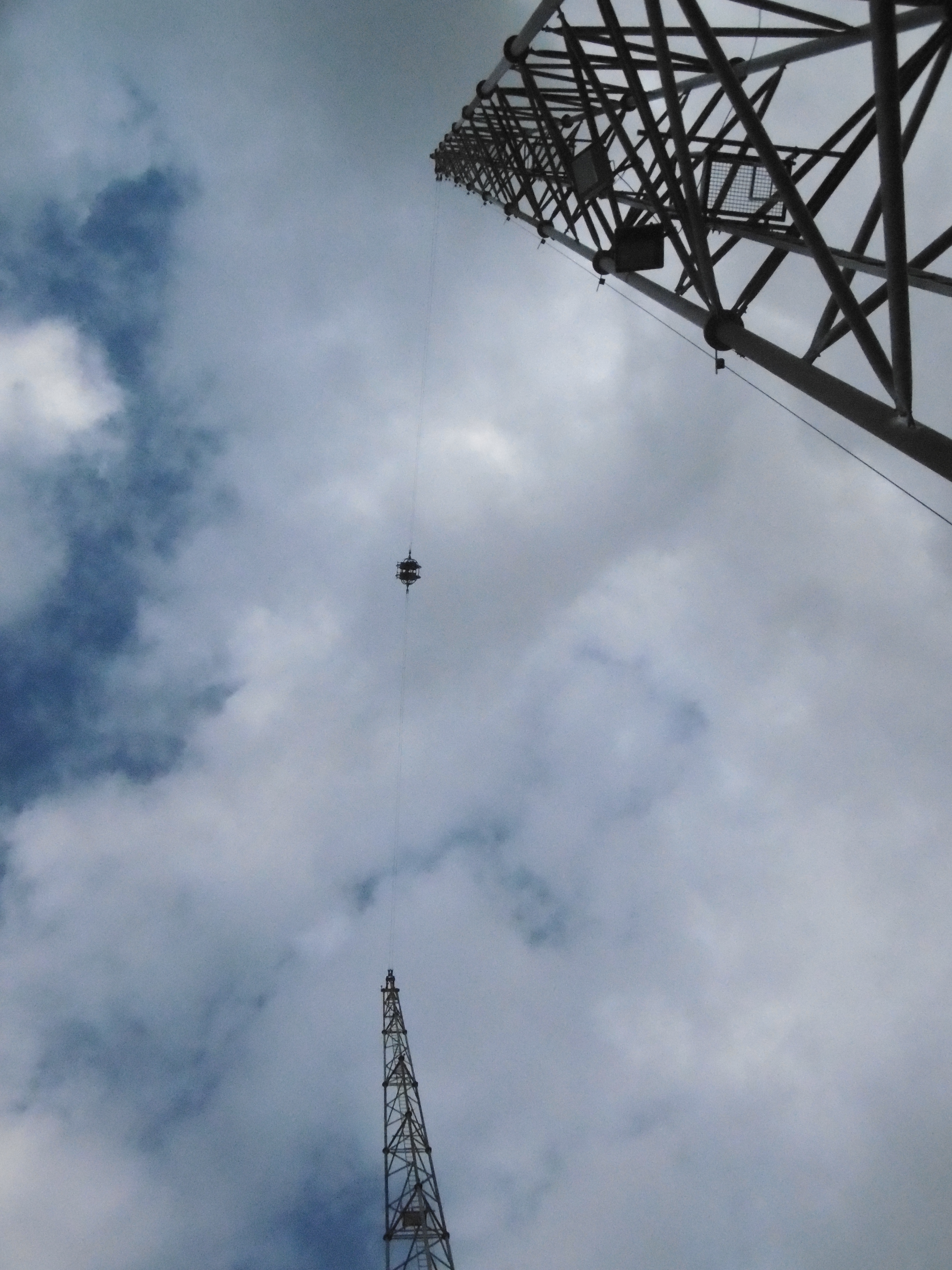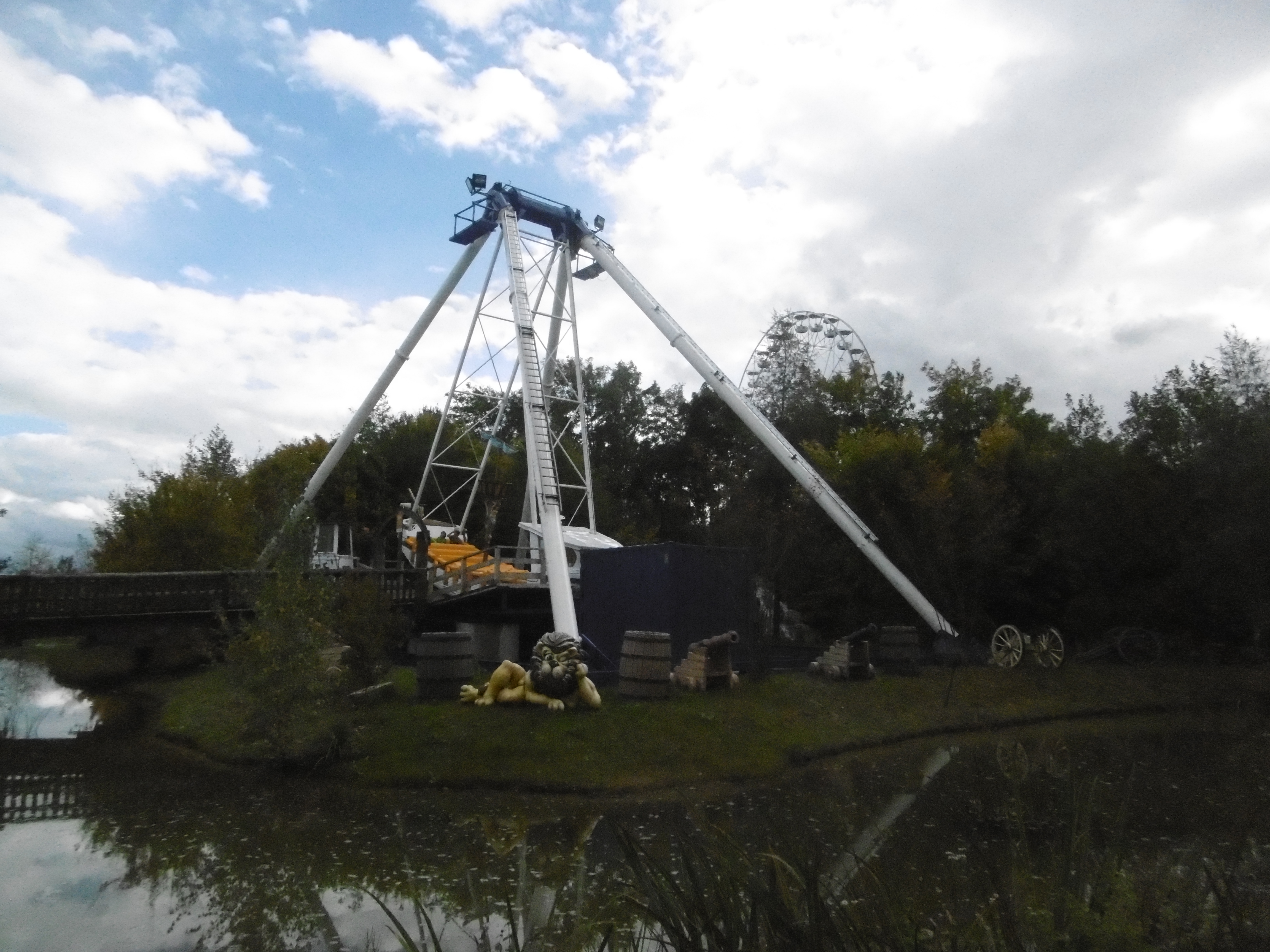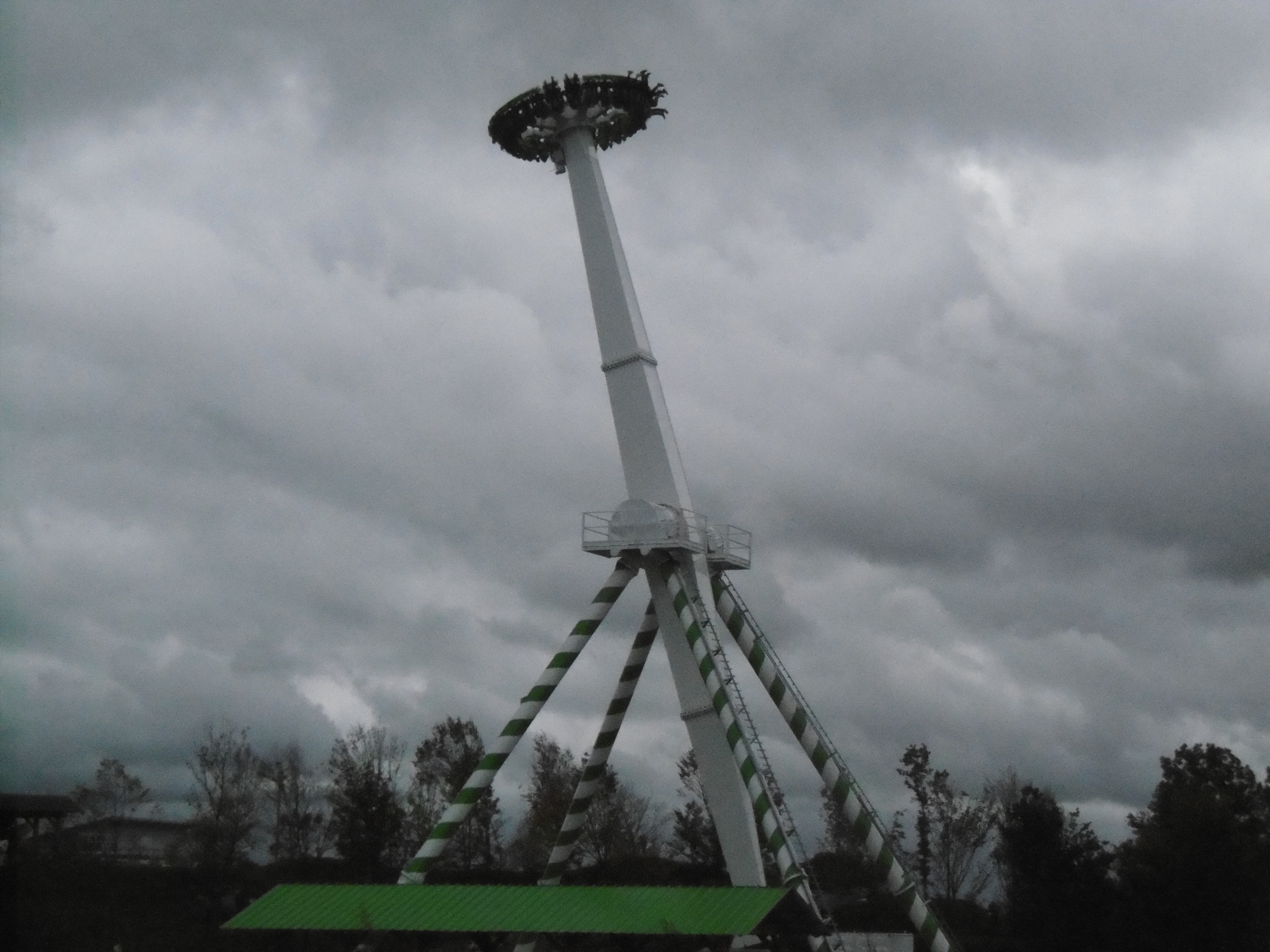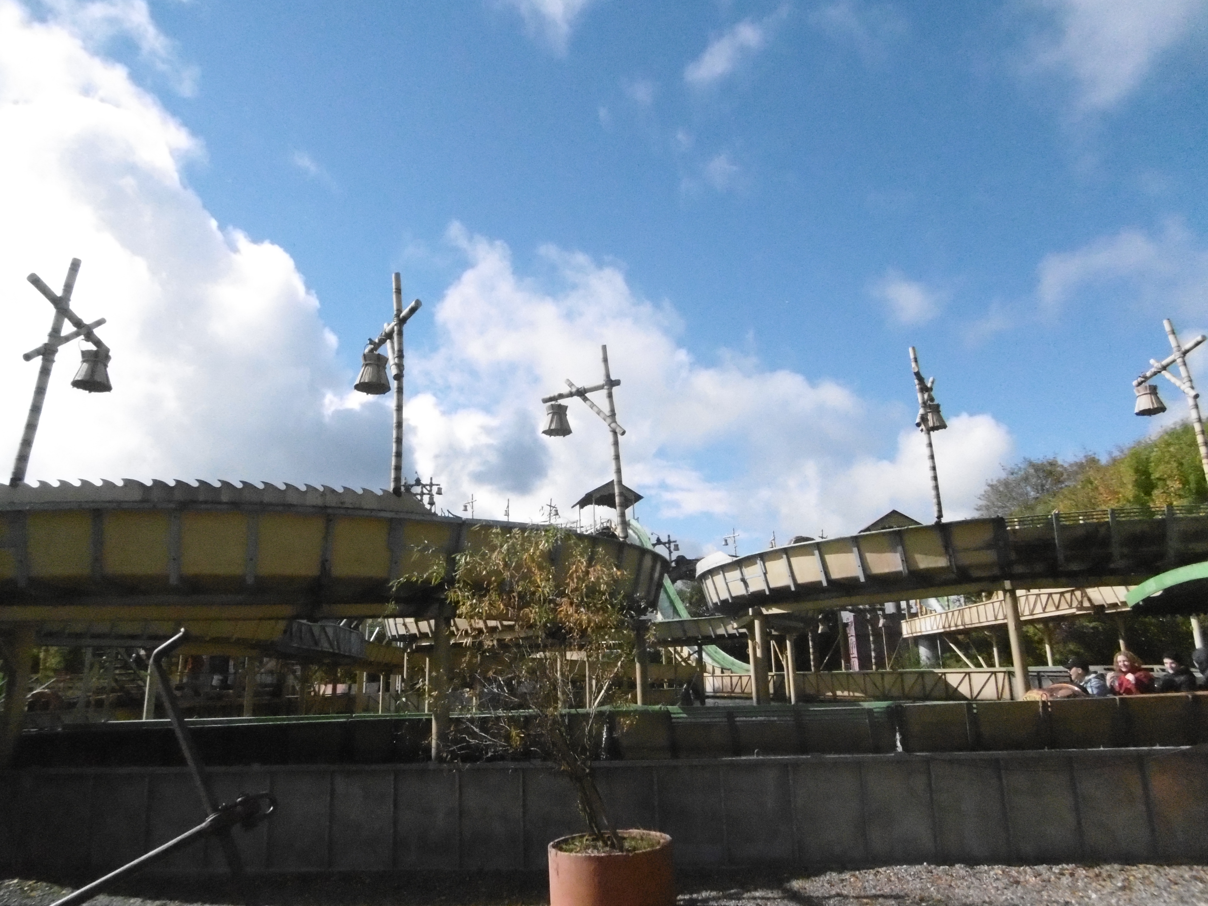 Da der Himmel zunächst noch sehr zugezogen war und später wieder, sind manche Bilder leider etwas dunkel und unscharf. Um kurz nach 12 traf ich auf dem Parkplatz ein, auf dem grob geschätzt vielleicht 50 Autos und drei Busse standen. Am Morgen haben mich meine Verwandten noch bemitleidet ob des schlechten Wetters, worauf ich entgegnete, dass dies nur gut für mich (und schlecht für den Park) sein kann. So machten sich der Jonas und meine Wenigkeit auf den Weg durch den sehr leeren Park. Zwar mit Plan ausgestattet, liefen wir einfach mal ohne Wegkenntnis darauf los. Beschilderungen sind im Park leider etwas Mangelware. Irgendwann standen wir dann vor den Schienen des Sky Riders. Da wir aber die falsche Abzweigung wählten standen wir dann auf einmal vor zwei stählernen Stützen mit vier herunterhängenden Seilen daran.
