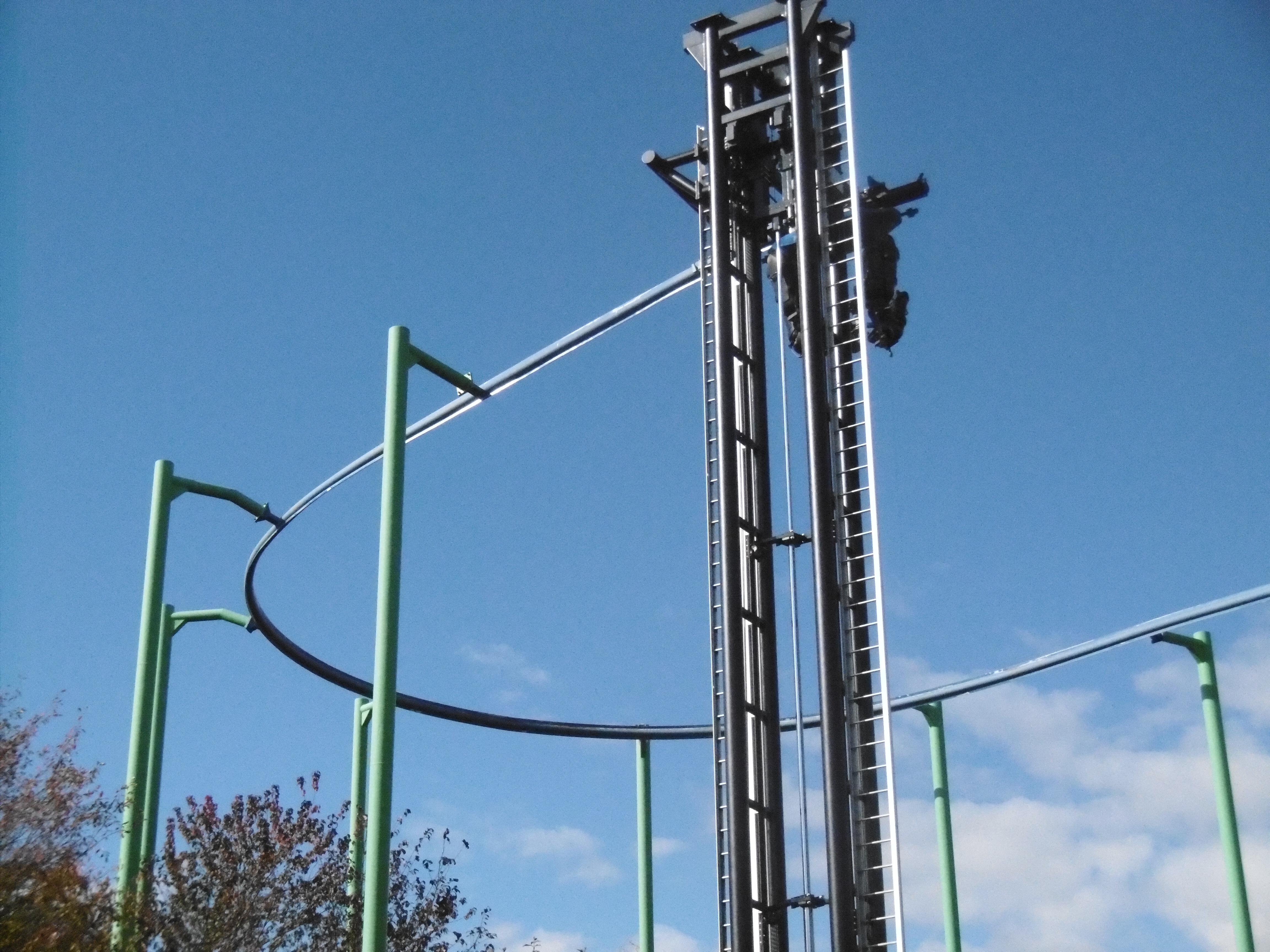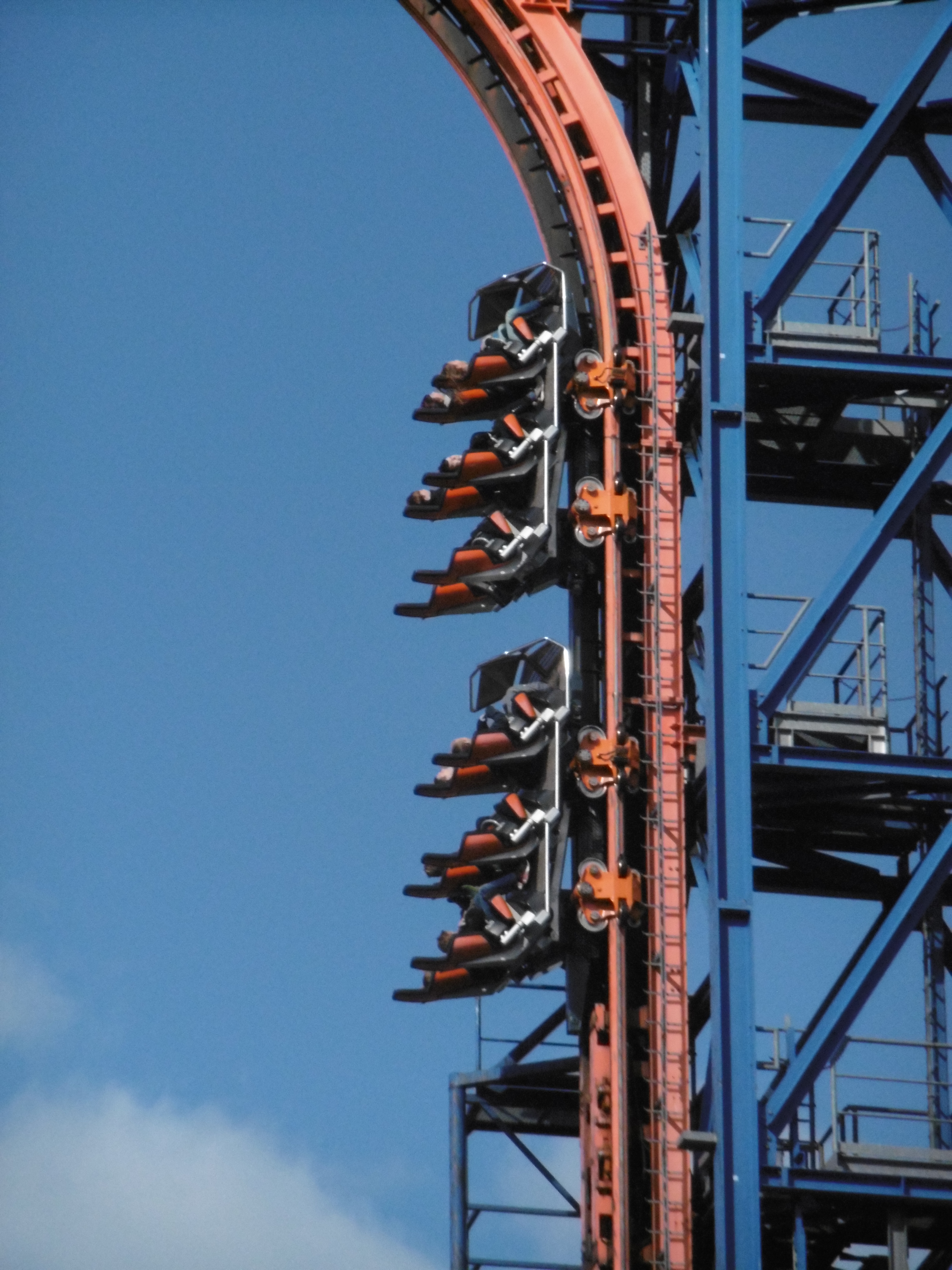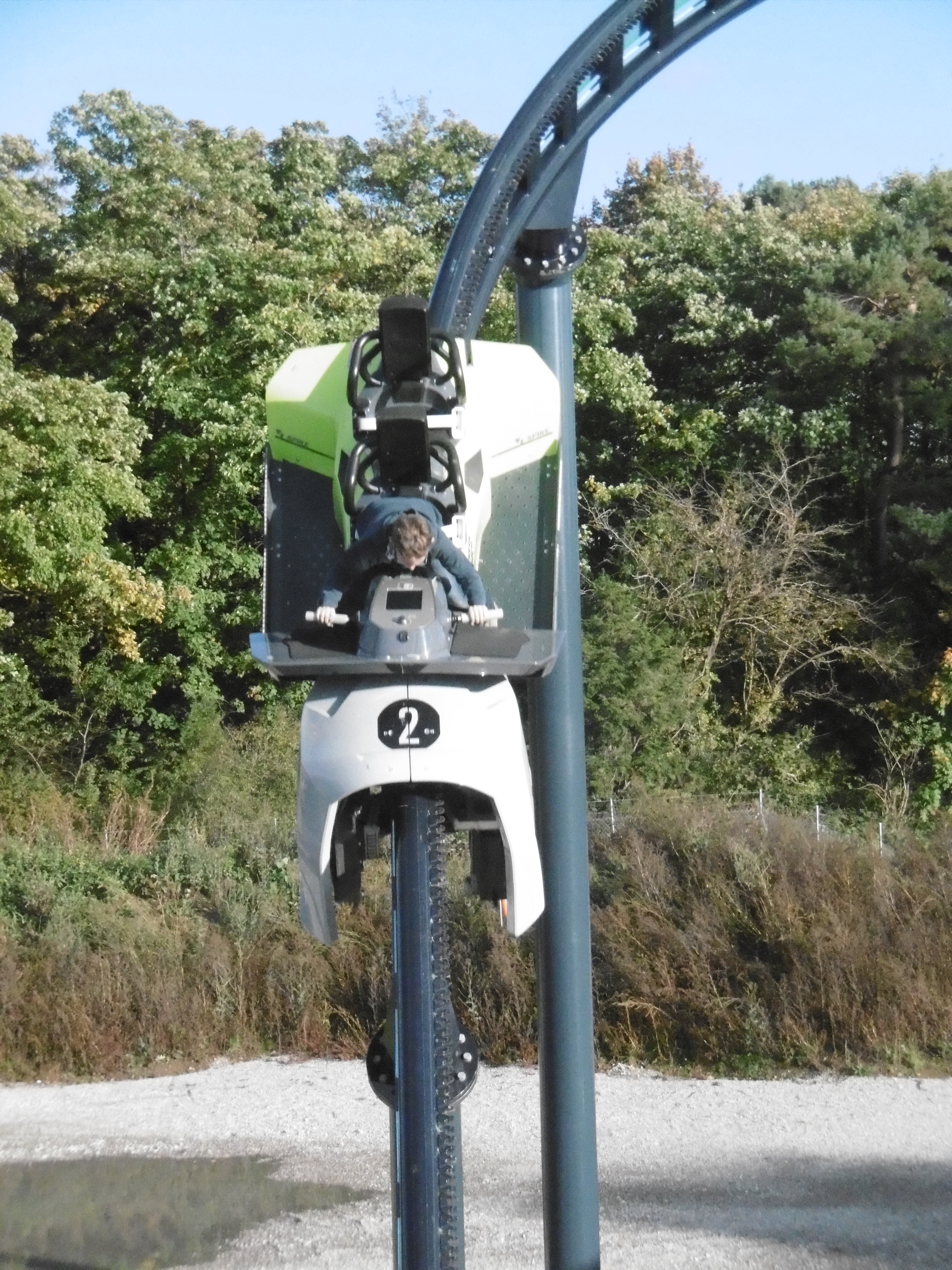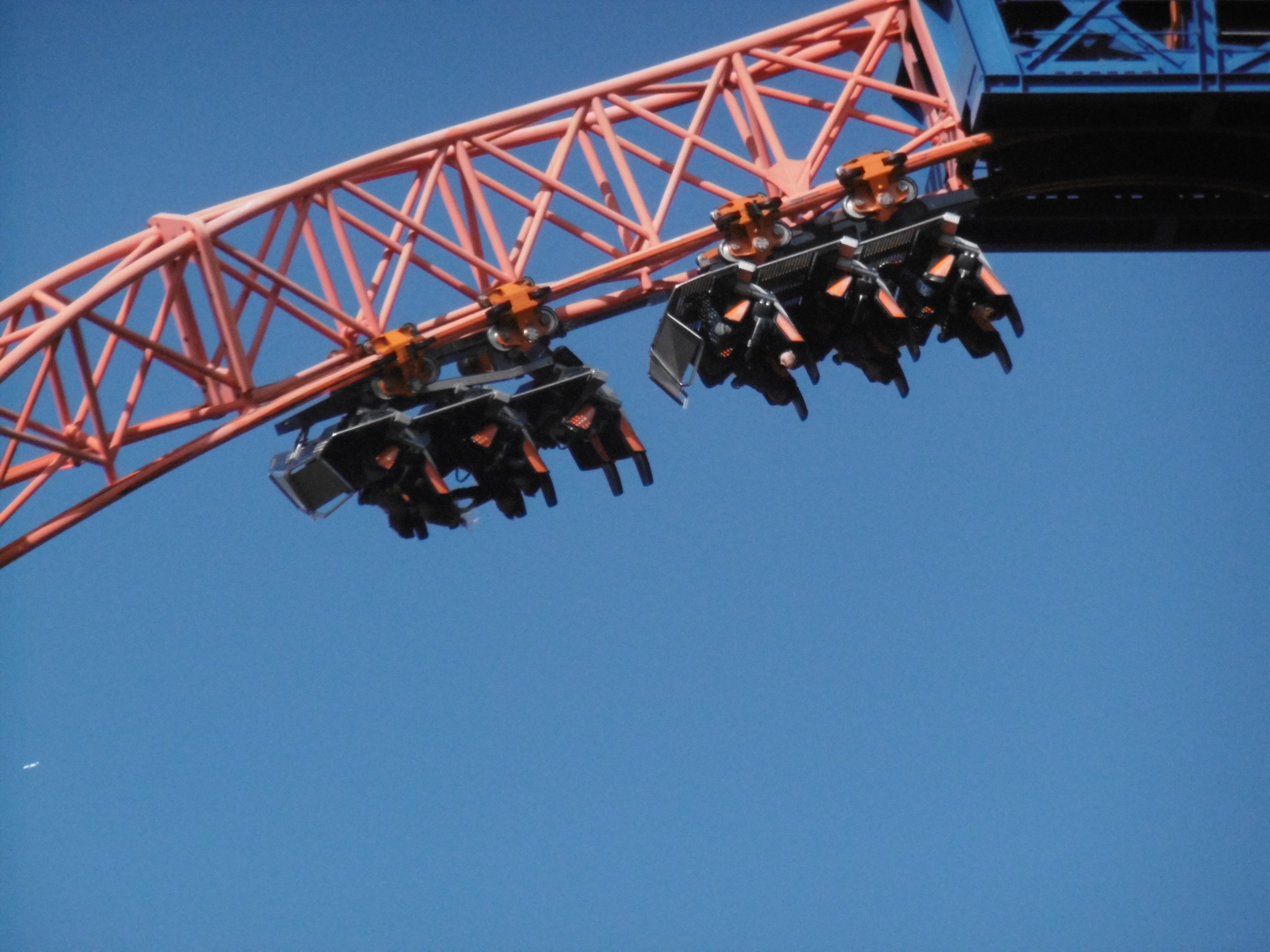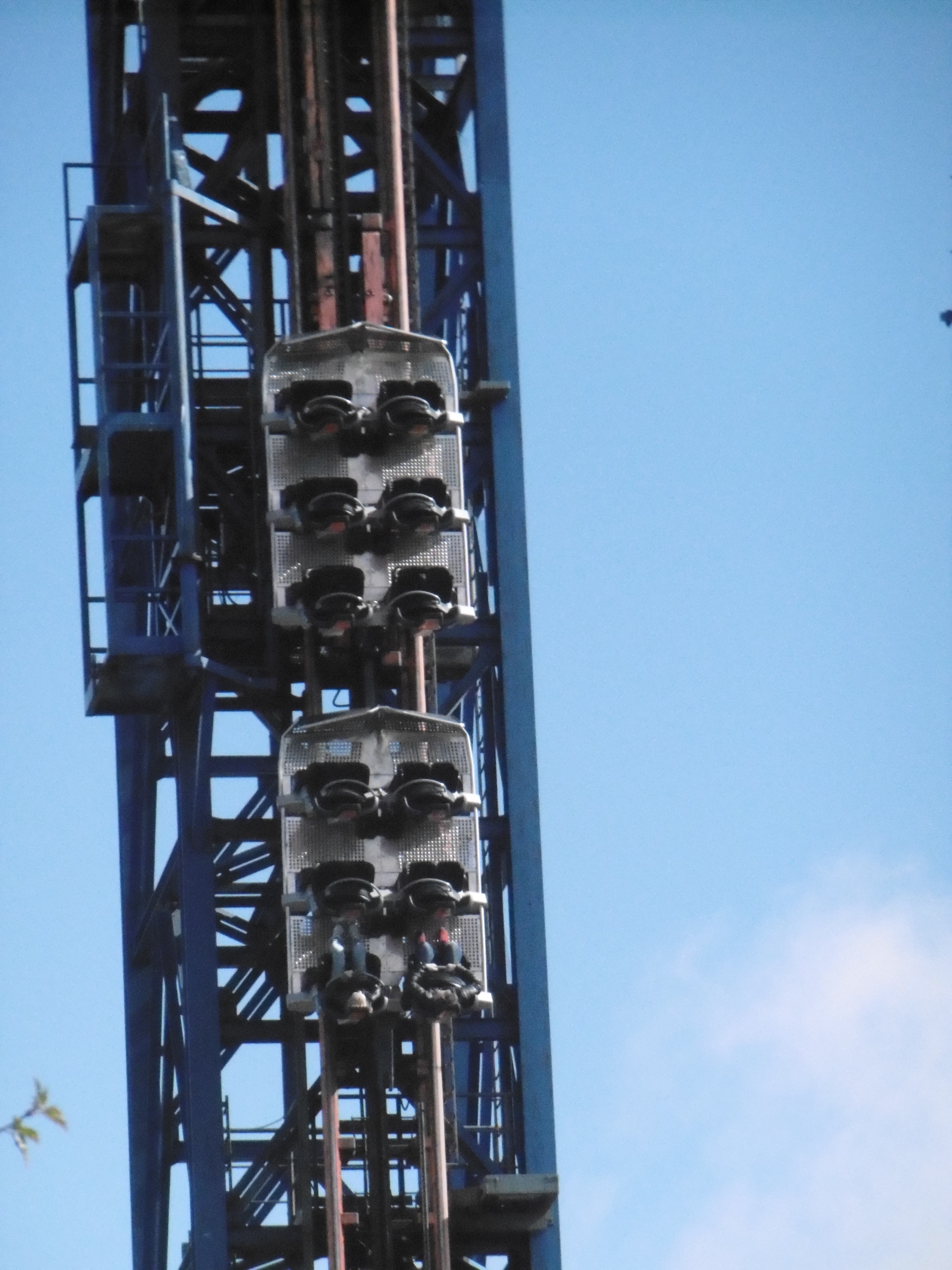 Die Bügel ließen mit ihrem schwergängigen Schließmechanismus, der einen Bodybuilder als Mitarbeiter nötig machte, auf ein hundert Meter hohes Exemplar schließen. Immerhin auf 24 Meter schafft es dieses kleine Ding. Leider war der Kippeffekt nicht aktiv, aber auch so machte das ganz kurze ruckartige Fallen aufgrund des magenhebenden Effekts ziemlich viel Spaß.