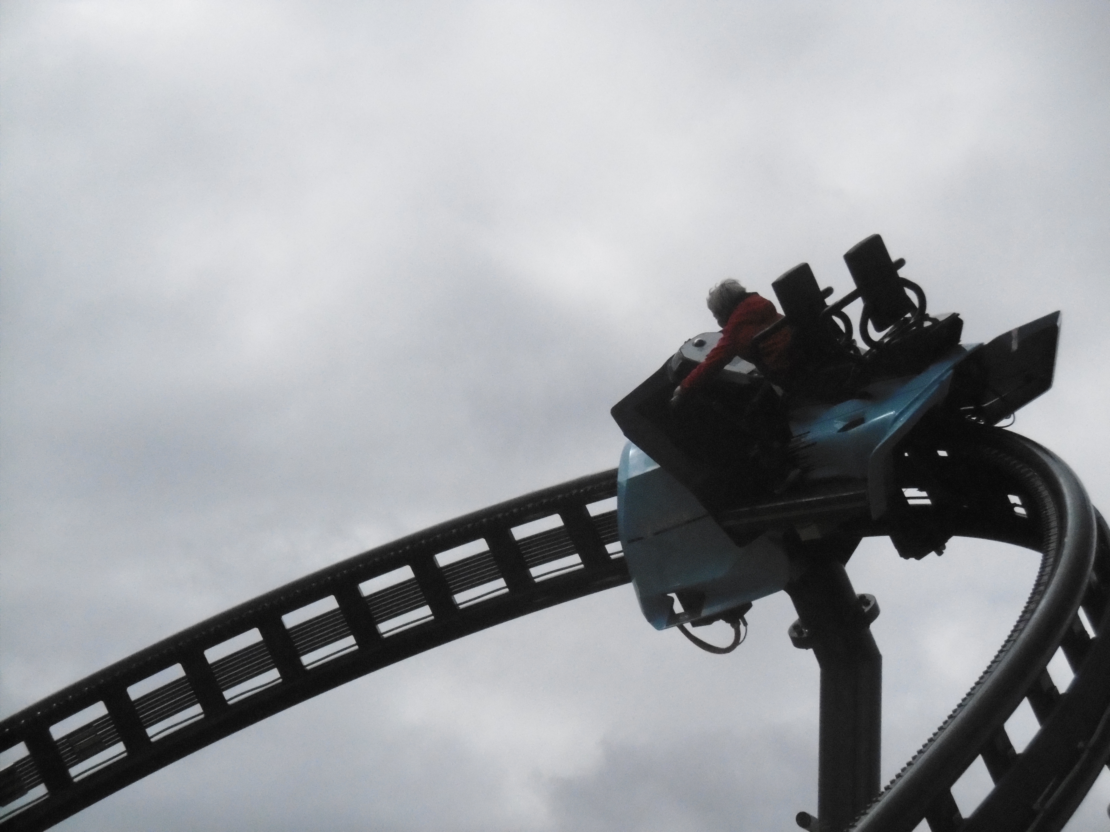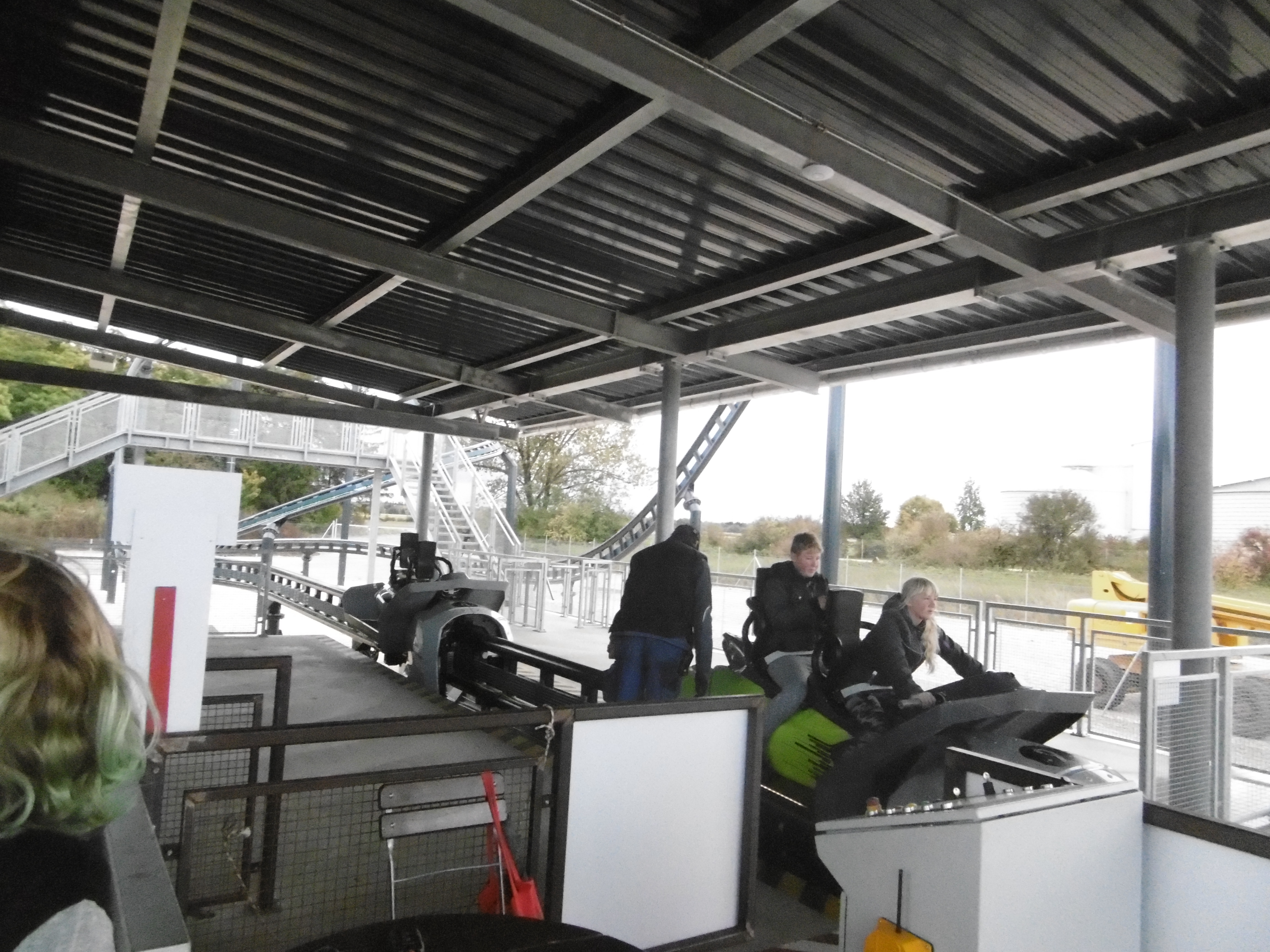Die einzige Menschenseele weit und breit war die Mitarbeiterin, die uns schräg versetzt in die Chaise setzte. Von ihr wusste ich nur noch, dass sie mal im Camelot Theme Park stand. Ansonsten nichts, aufgrund unserer Laufroute hatte ich nicht mal auf den Fahrtverlauf geachtet. Da ich vorwärts eingestiegen bin und aufgrund der Tatsache, dass die Wagen direkt vom Lifthill herab anfangen zu drehen, habe ich so die erste Abfahrt nicht kommen sehen.