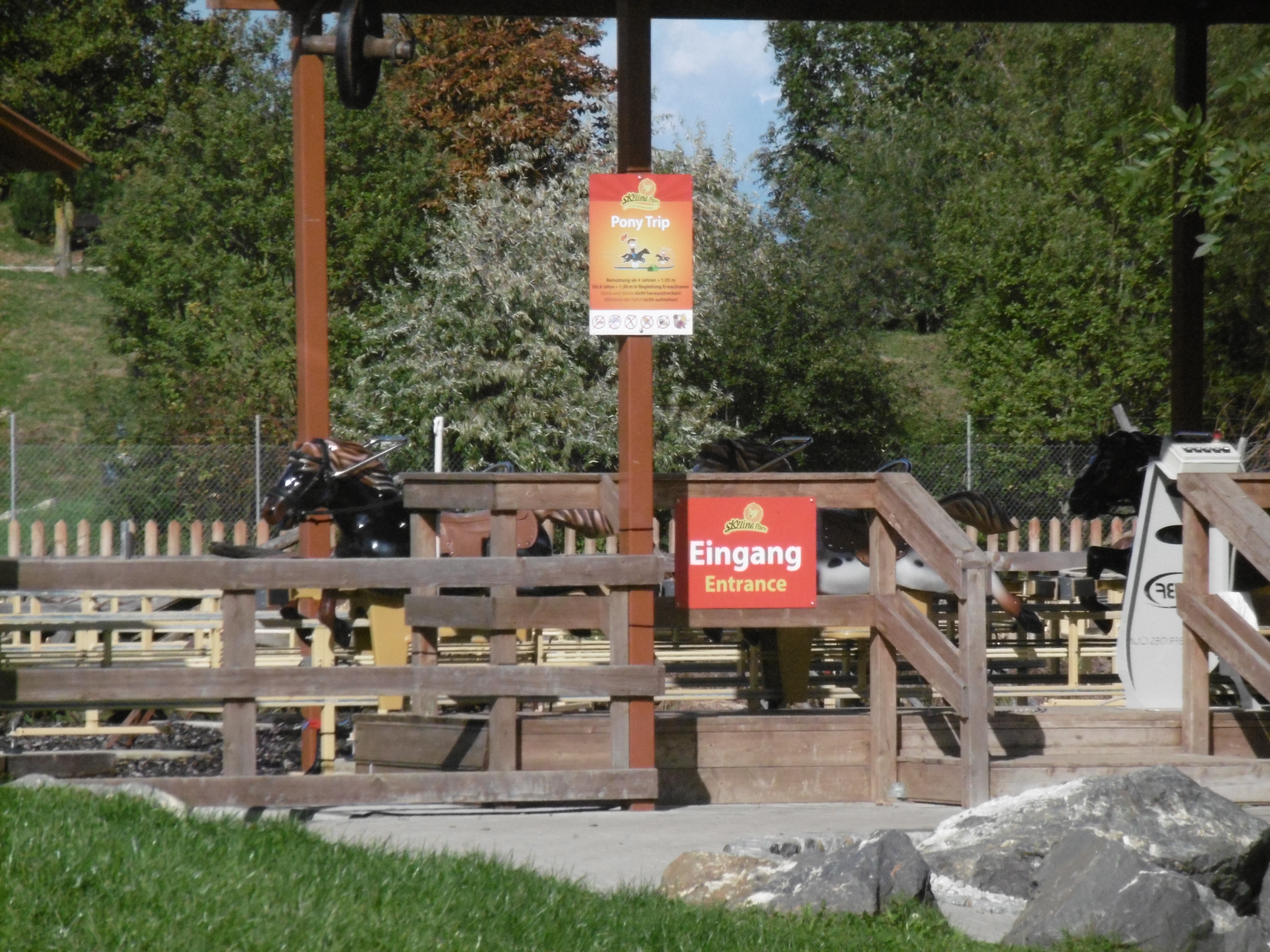 Wenigstens landeten wir so direkt vor dem Eingang vor der ersten richtigen Achterbahn des Parks: den Sky Rider.