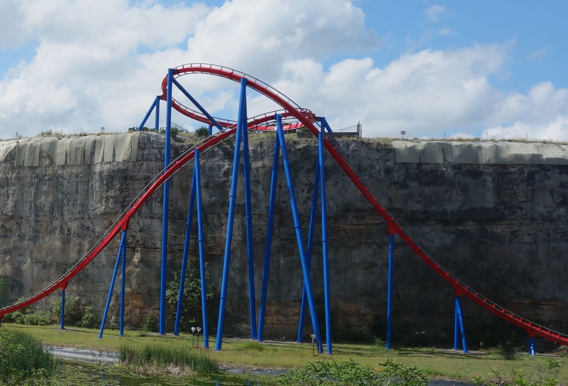 Direkt am See des Spillwaters (künftig Standort des Wonder Woman Coasters) wird noch eine knackige Cobra Roll durchfahren.