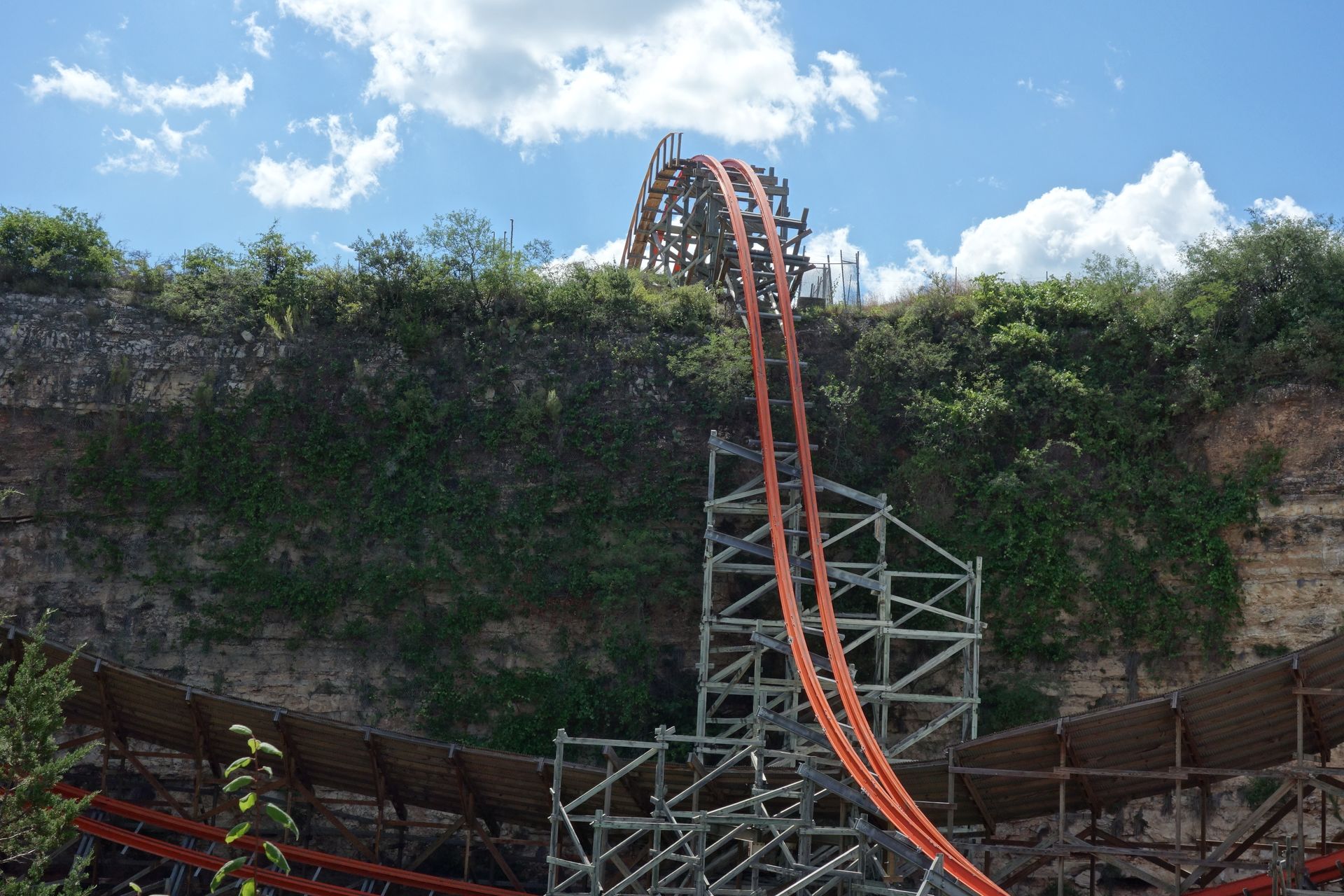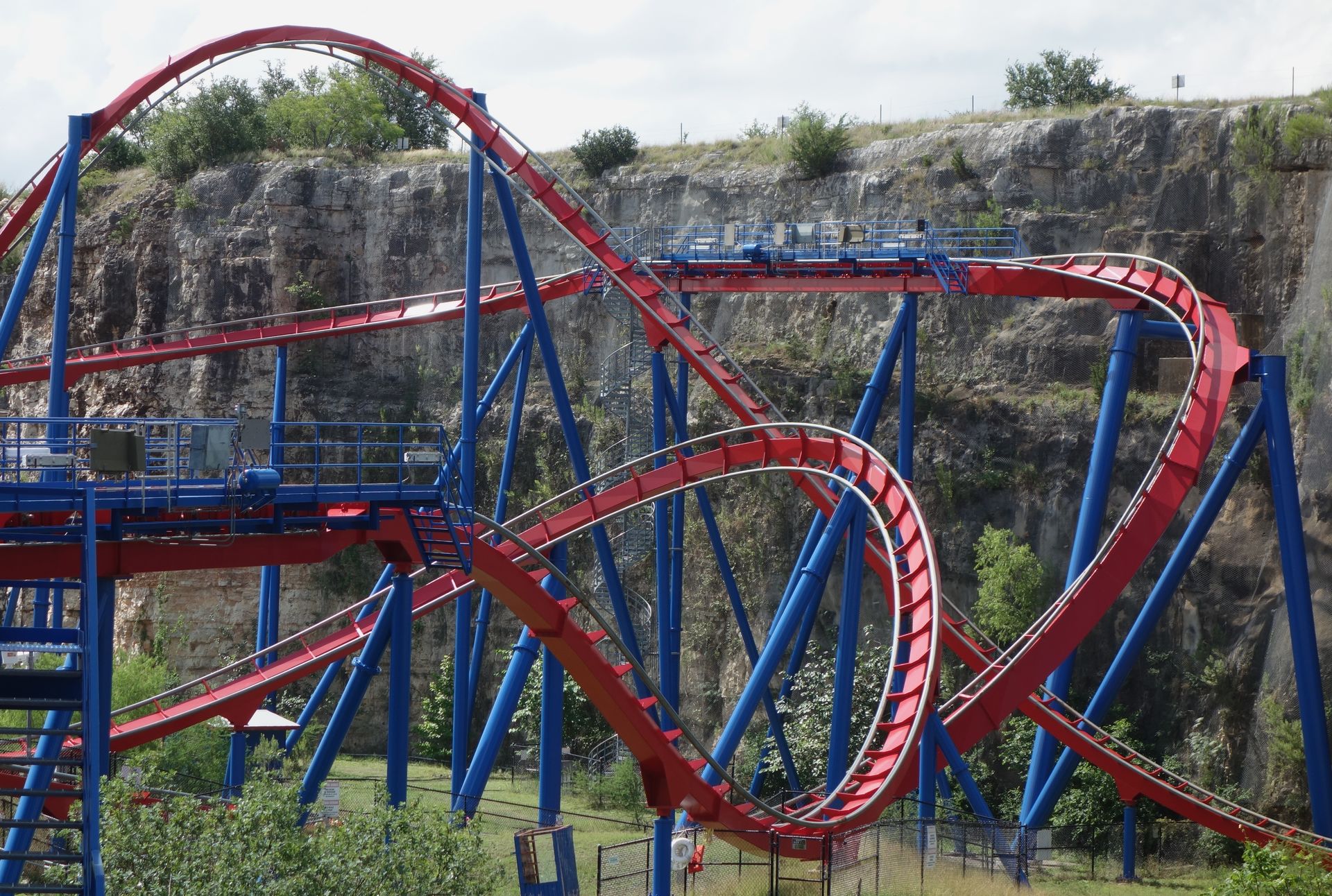 Ein Floorless Coaster von B&M, der im Jahr 2000 an die Klippen des ehemaligen Steinbruchs platziert wurde.