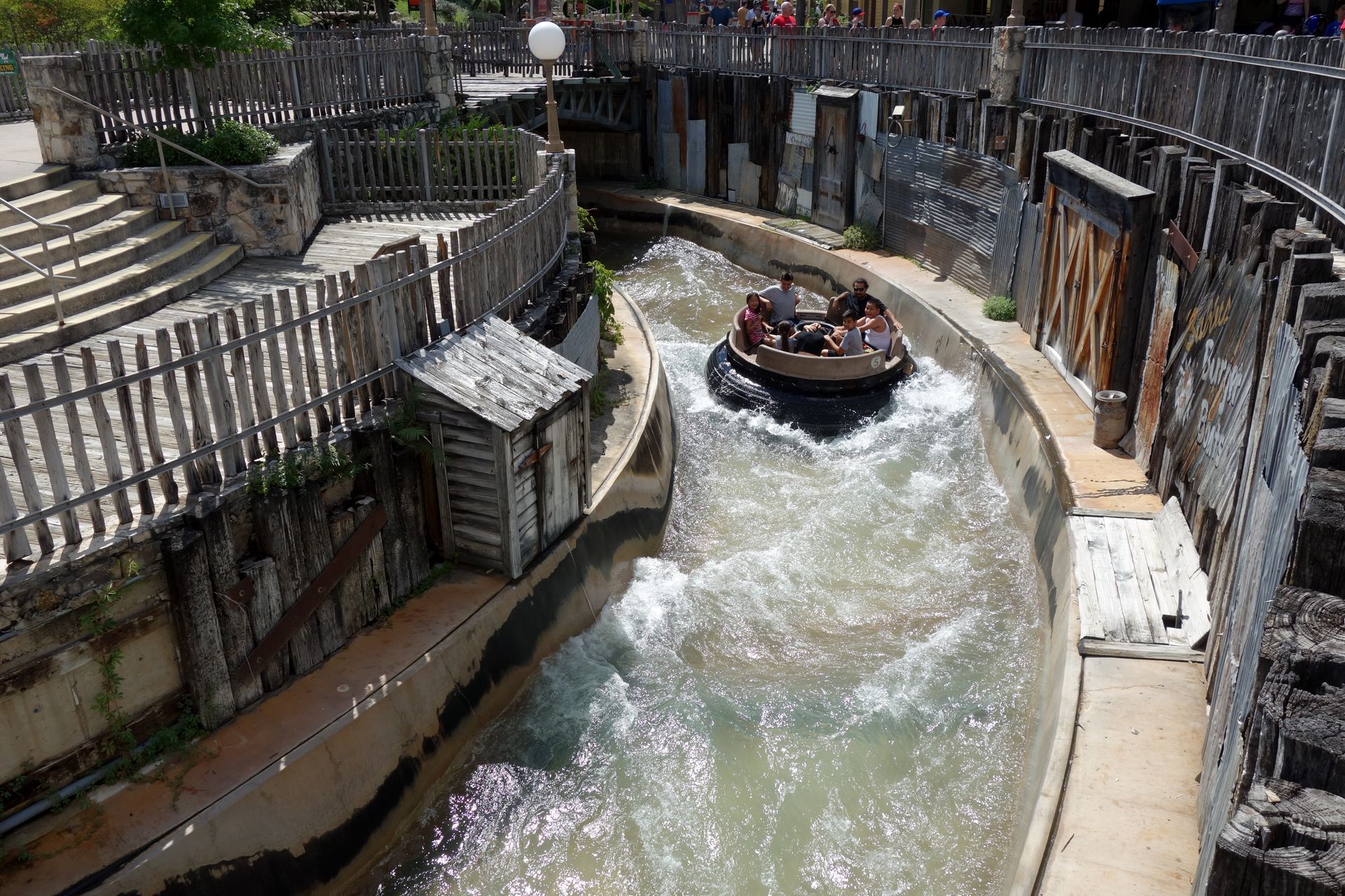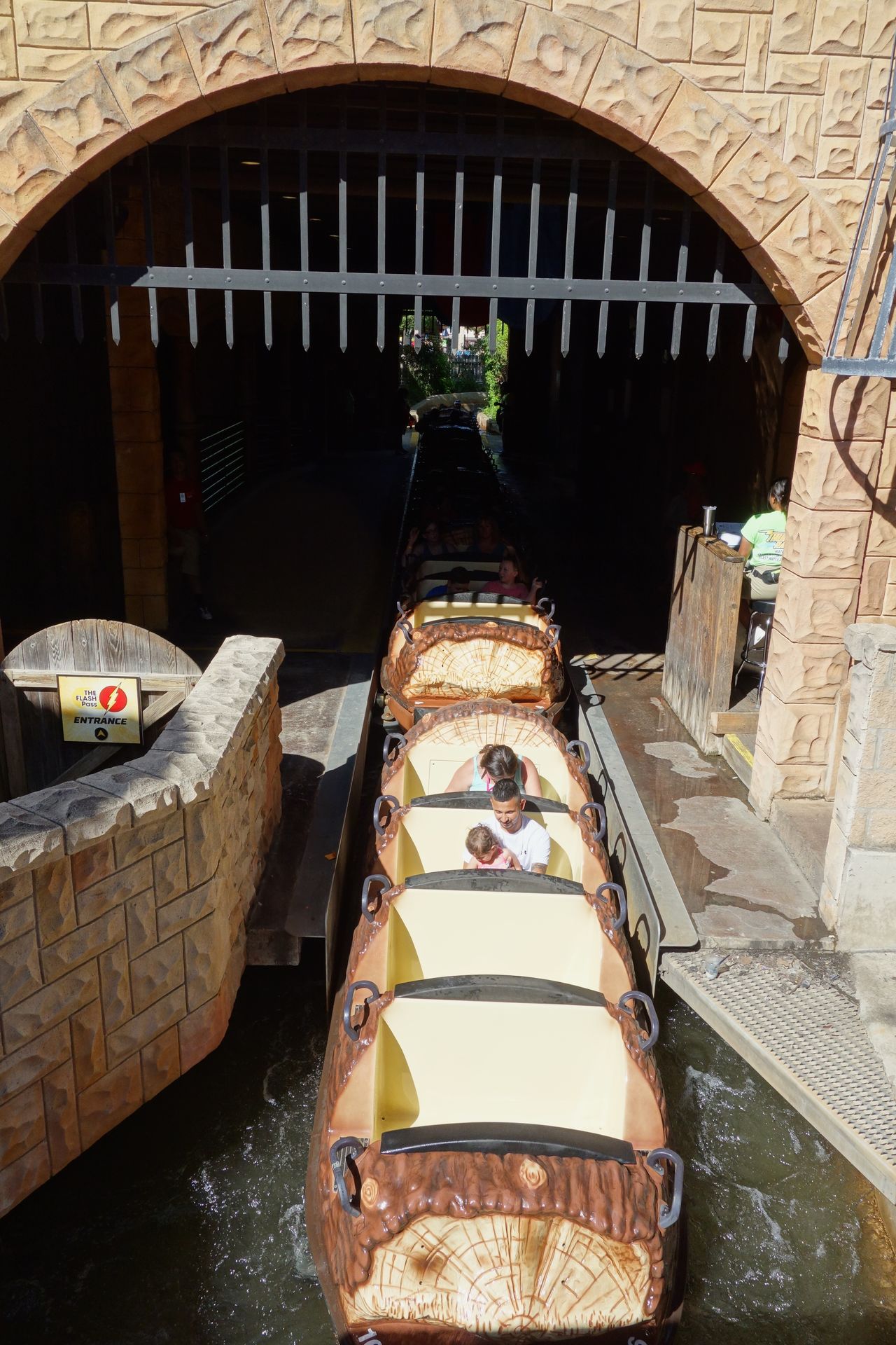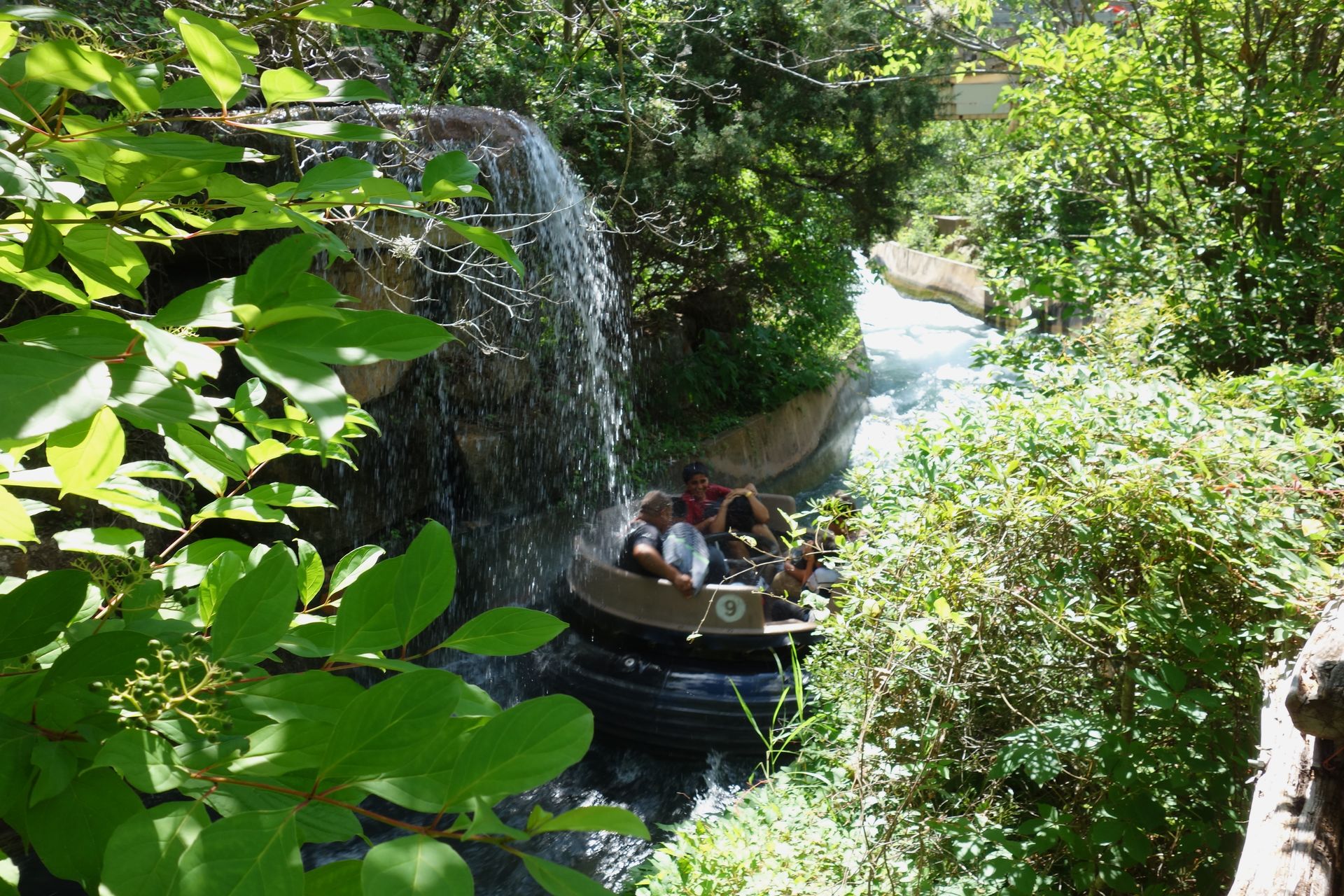 Die Baumstammboote bieten in vier Reihen jeweils Platz für zwei Passagiere. Zum Einstieg sind die Seiten bis knapp über Sitzhöhe ausgeschnitten, was die Fahrt zu einer verdammt spannenden Angelegenheit machte. Denn obwohl unser Boot recht kopflastig war (vorne zwei sichtlich schwerere Amis, wir ganz hinten), wanderte unser Blick beim Eintauchen ins Wasser sofort auf den Rand dieses Einstieges. Viel fehlte da nicht mehr, bis das kühle Nass ins Boot schwappen würde. Entsprechend starrte ich bei jeder Welle gespannt dort hin. Und davon hat die Fahrt genug zu bieten, besonders in den ruppigen S-Kurven im oberen Teil, wo das Boot eben zusätzlich noch etwas schaukelt. Tatsächlich blieb das Wasser aber draußen, nichtmal nach den beiden Drops kam dort die befürchtete Menge Wasser hinein. Auch sonst hielt sich der Nässefaktor in Grenzen.