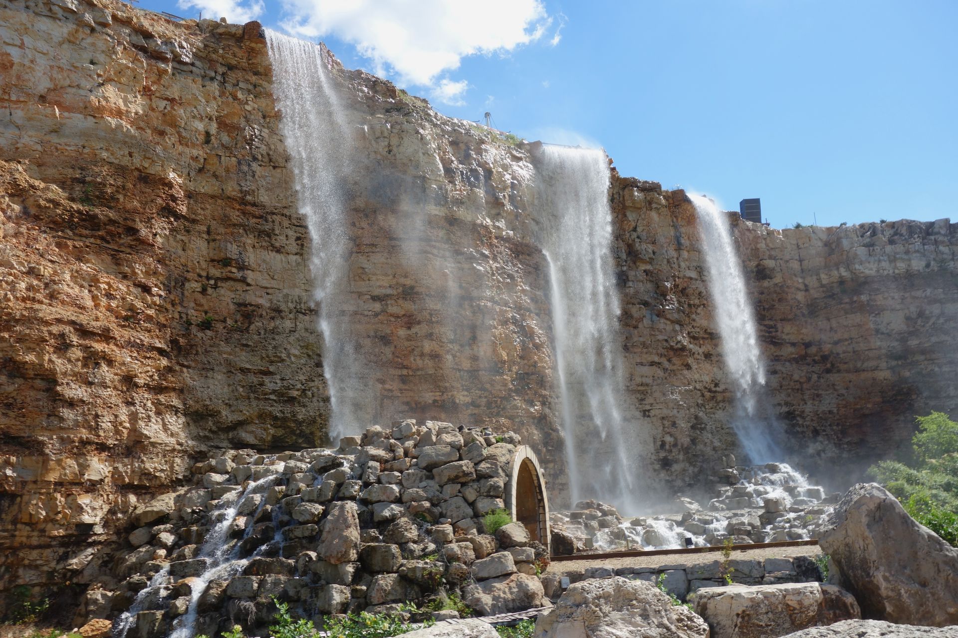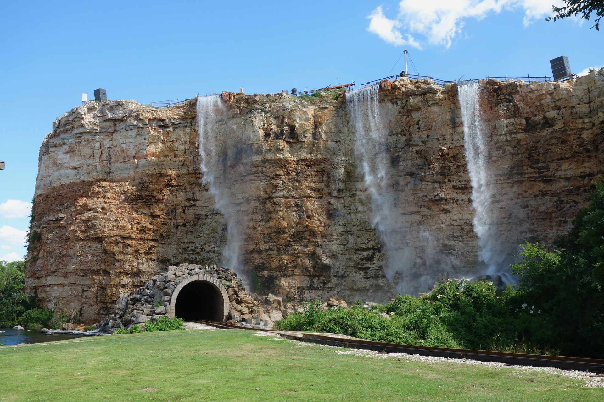 Die gegenüberliegende Felswand ist mit drei Wasserfällen ausgestattet. Künstlich wohl, denn zur Show wurden sie abgeschaltet.