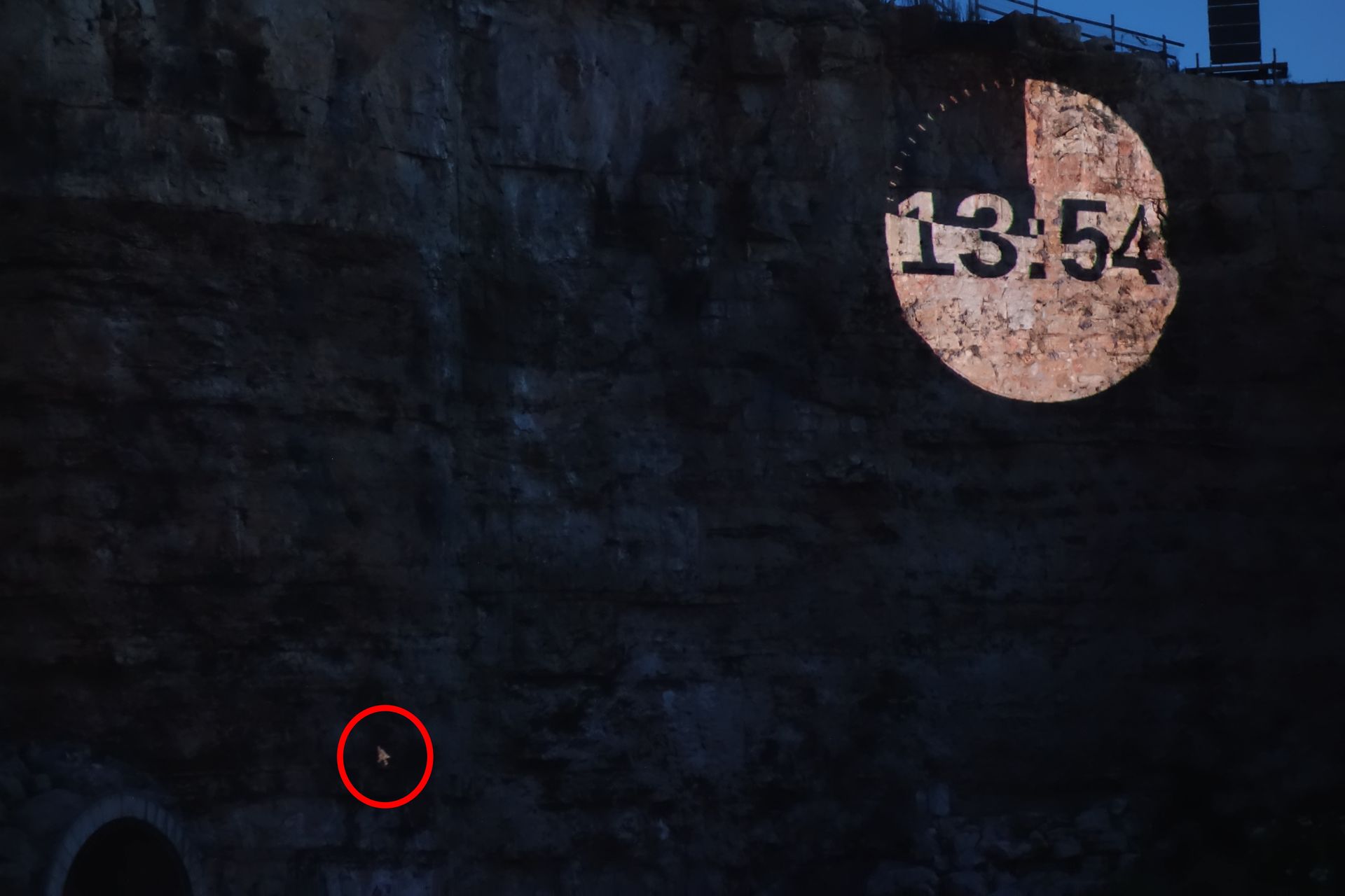Auf die Felswand wurde zu diesem Zeitpunkt nur eine kleine Countdown-Uhr projiziert. Der Mauszeiger fiel erst bei genauerem Hinsehen auf.