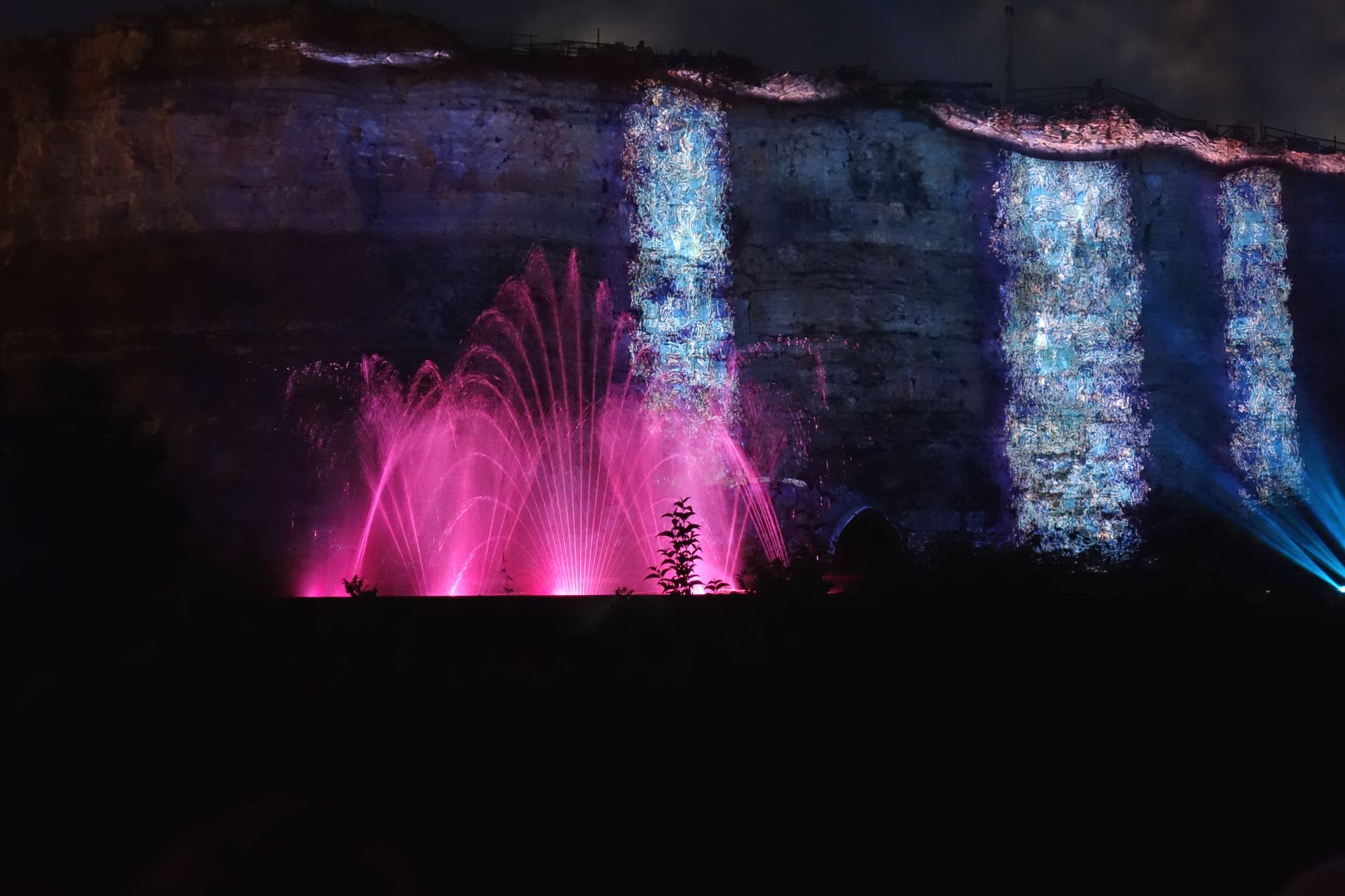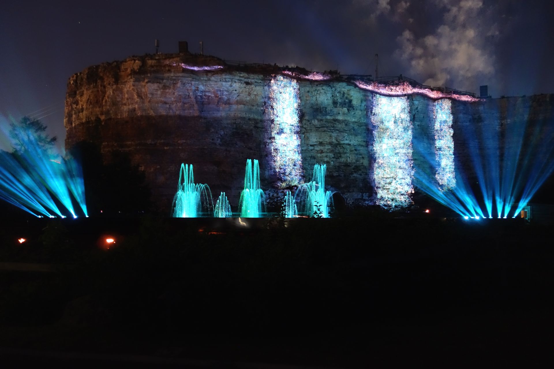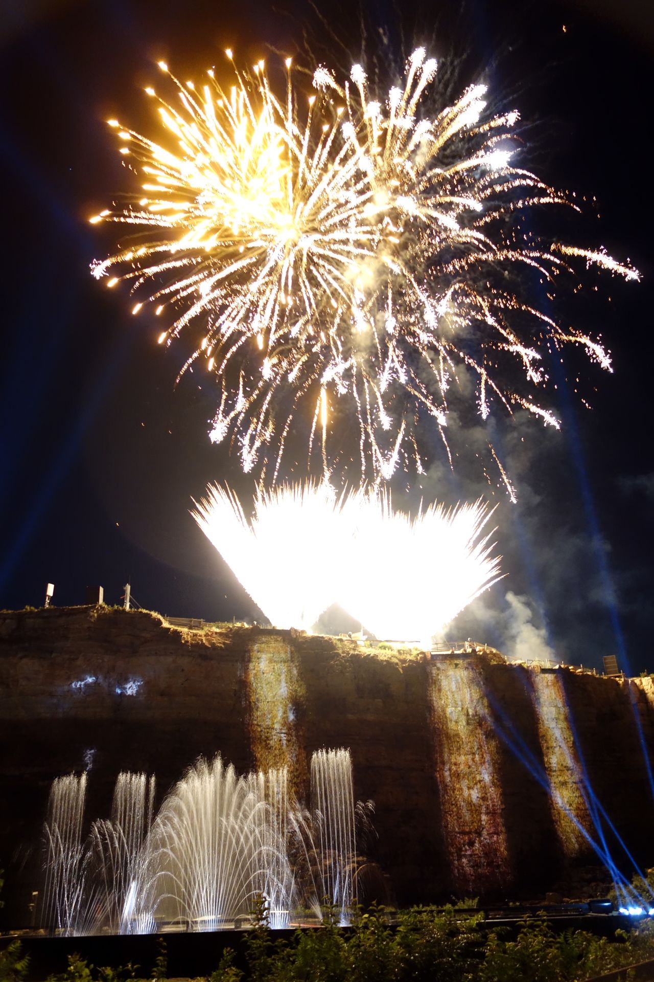 Die Wasserfälle - obwohl ja tatsächlich vorhanden - sind hier nur eine Projektion, dafür sind die Wasserspiele davor real.