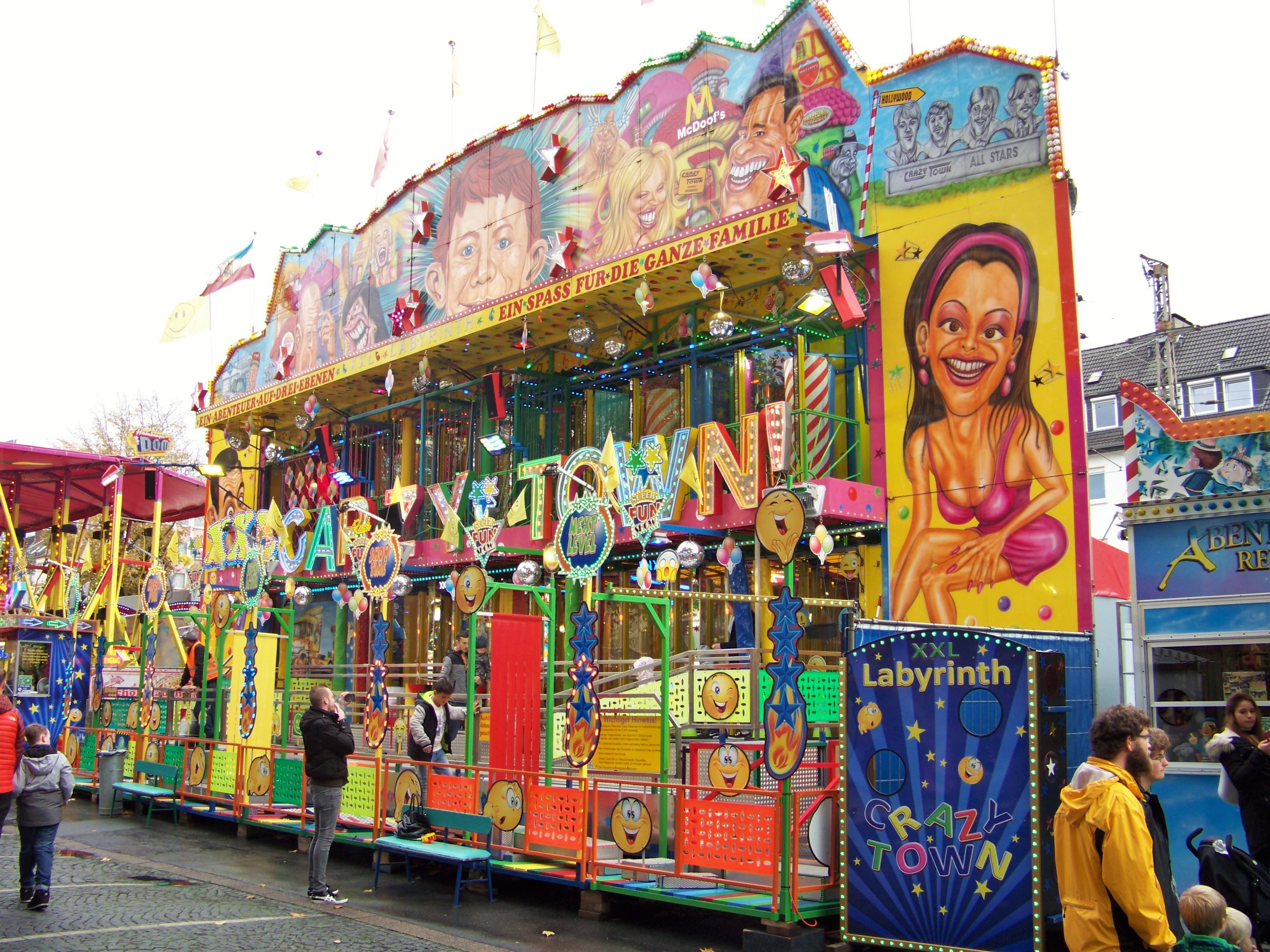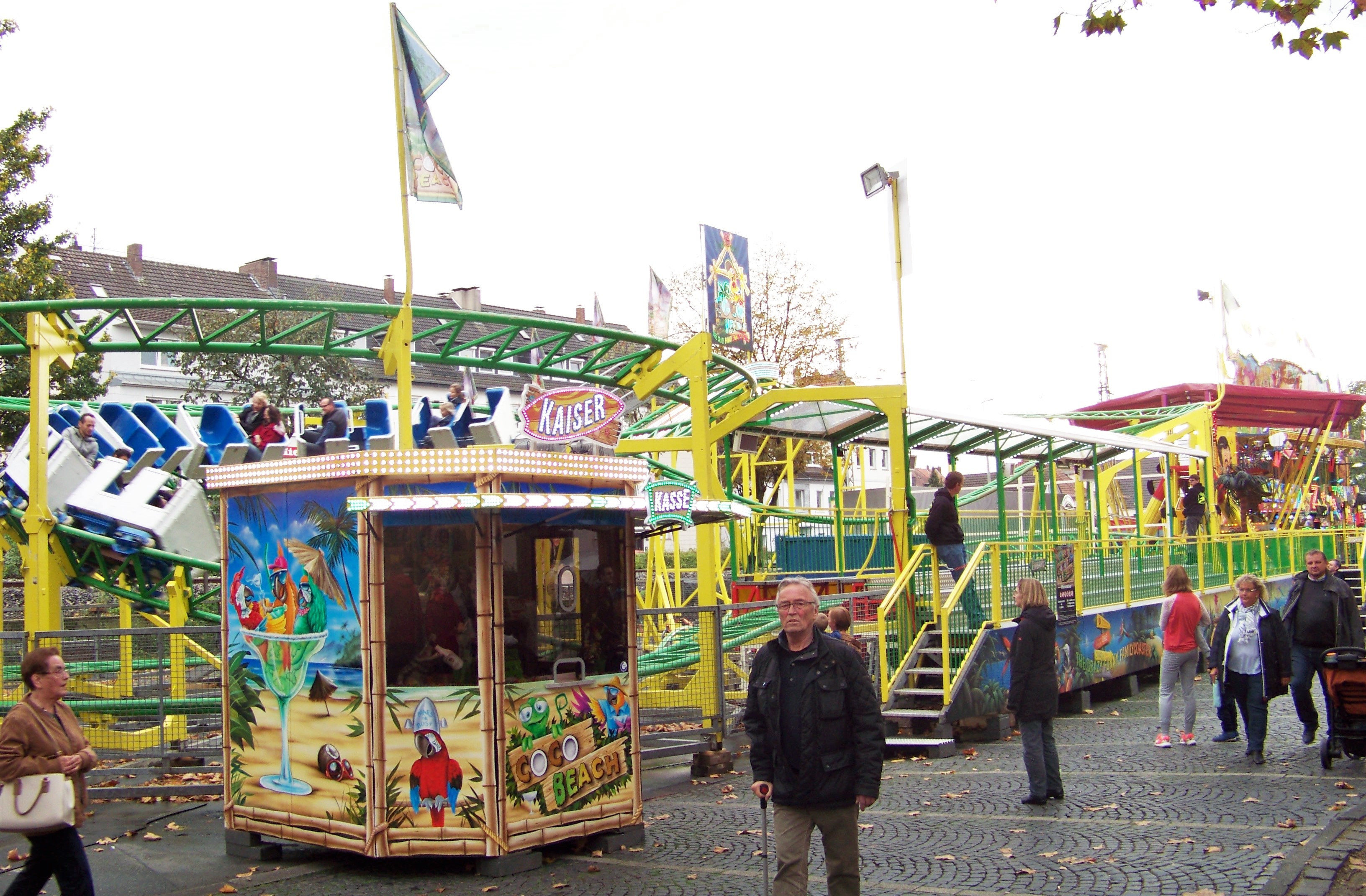 Direkt am unteren Ende des Liboribergs erwartet das Kirmespublikum (neben einer Kinderschleife) ein Trio aus familienfreundlichen Geschäften: das Laufgeschäft Crazy Town von Rasch (hier zunächst als "Carzy Town" getarnt - der Buchstabendreher wurde noch im Laufe des ersten Abends behoben. Als ich später am Geschäft vorbei kam, hing der Schriftzug mit der richtigen Buchstabenfolge am Geschäft), die Käfigschaukel von Anton und die kleine Achterbahn "Coco Beach" von Kaiser.