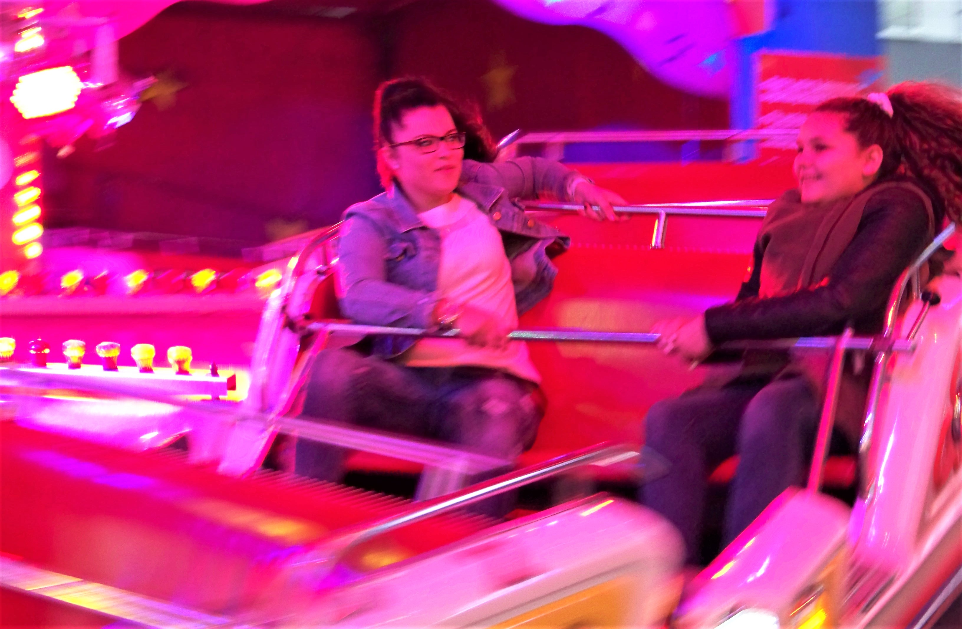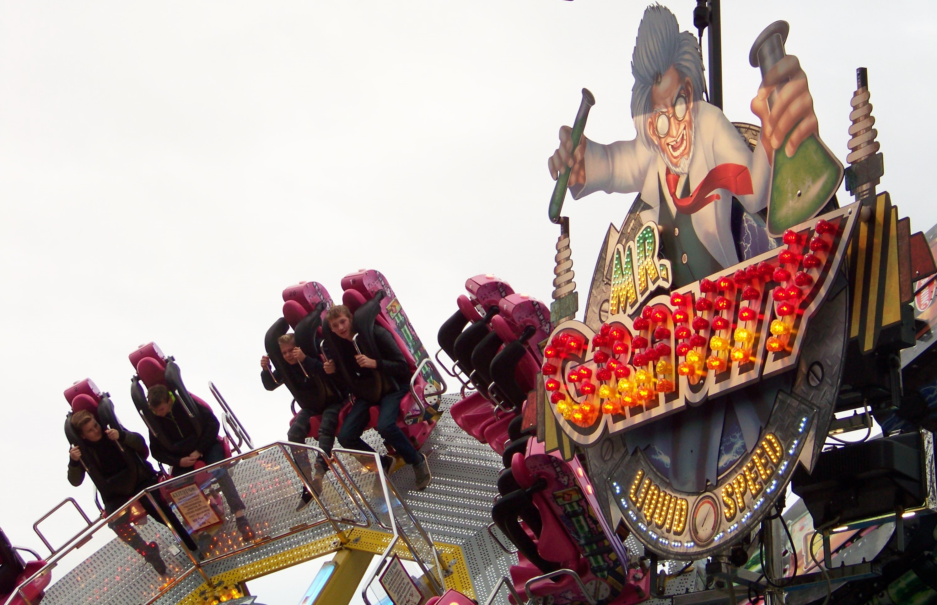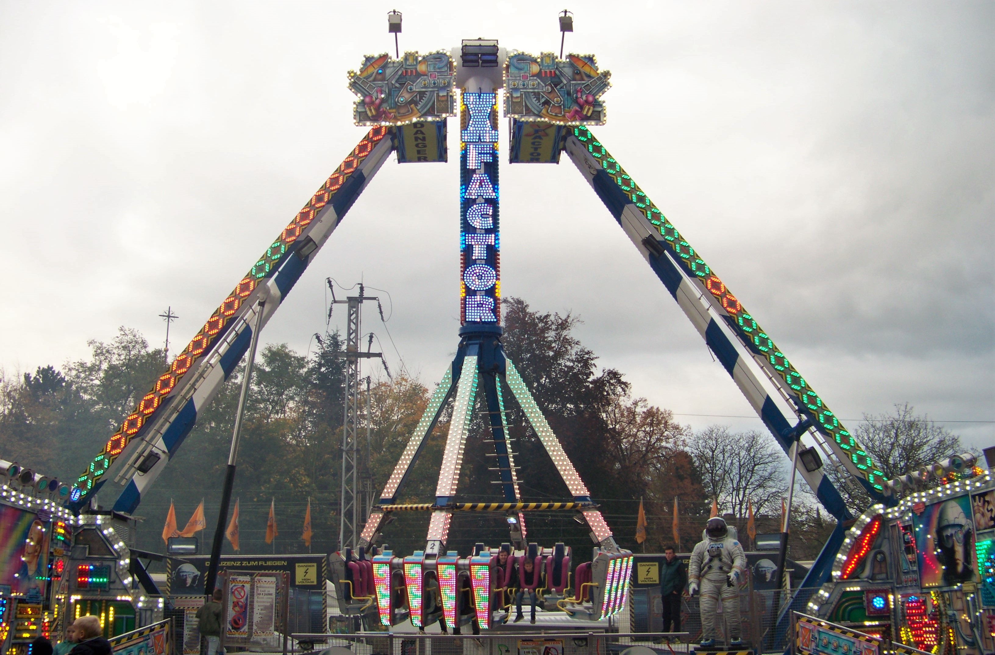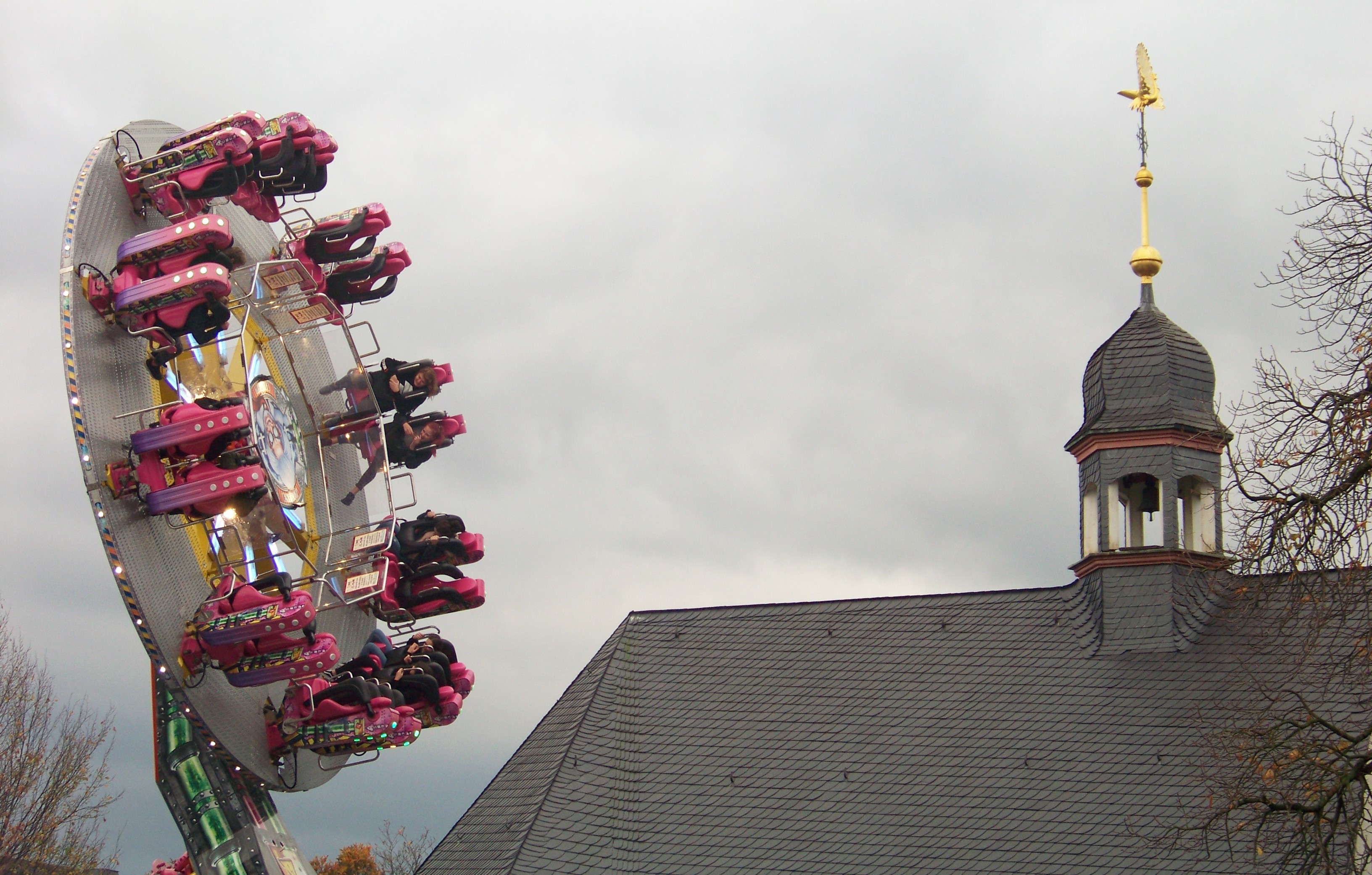 Wie oben schon genannt, fällt durch die stark zielgruppen-orientierte Aufteilung der Plätze des Liboribergs der obere Parkplatz sehr thrill-lastig aus. Direkt neben der Kapelle steht dadurch ein Hochfahrgeschäfts-Duo direkt beieinander. Was mir in der Aufbauwoche noch nach einer eher seltsamen Bebauung aussah, entfaltet im Spielbetrieb dann doch eine schon beeindruckende Wirkung, wenn die fast gleich hohen Mr. Gravity und X-Factor zu gleichen Zeit fahren.