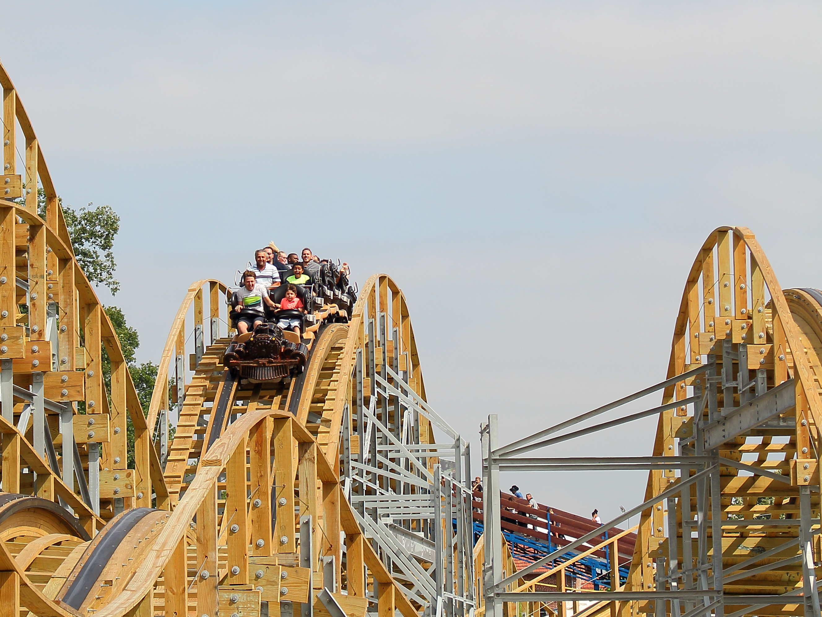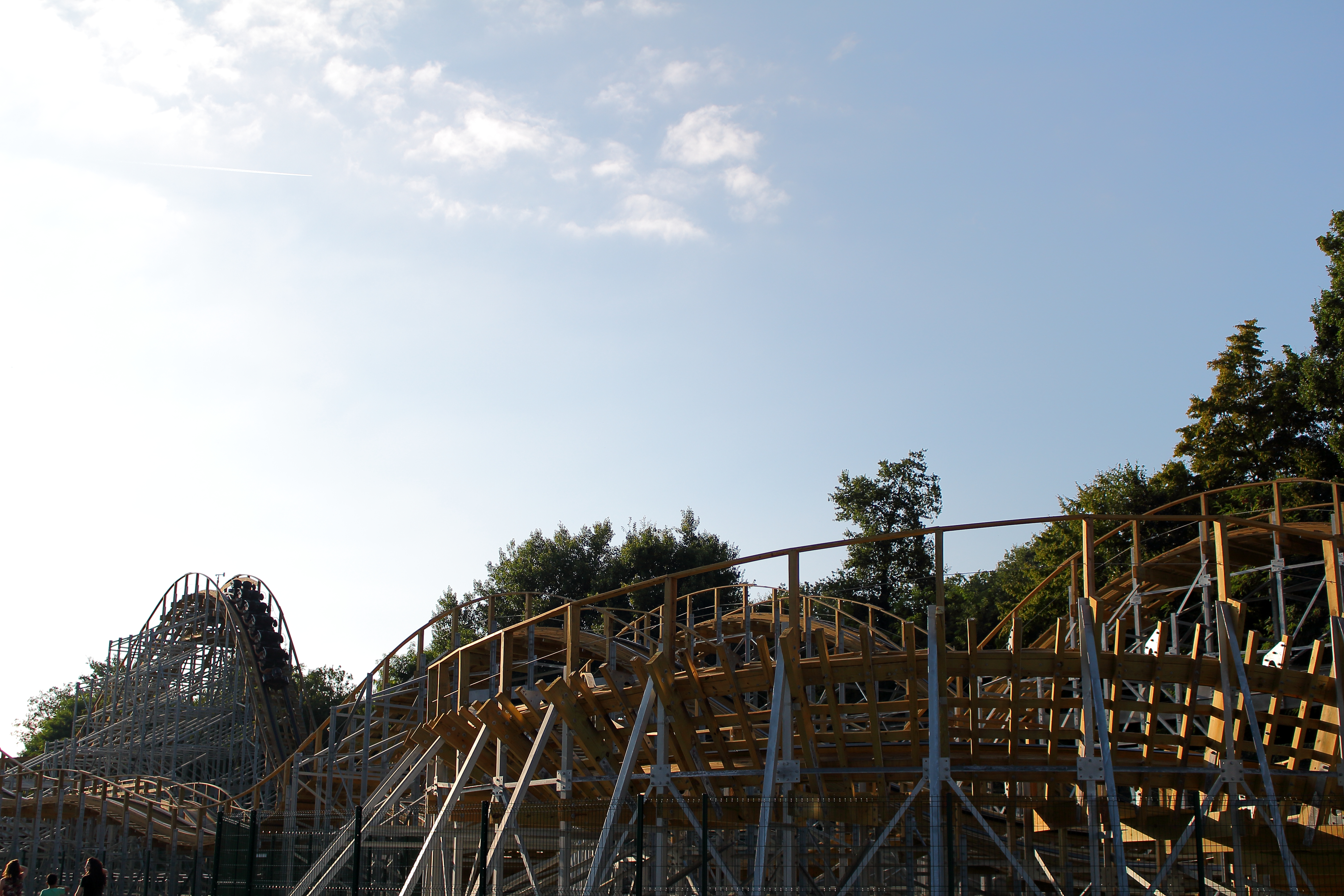 Gott segne die Timberliner, weil sich die Bügel nicht weiter schließen, und die russische Queen of Wild Mouse daneben.