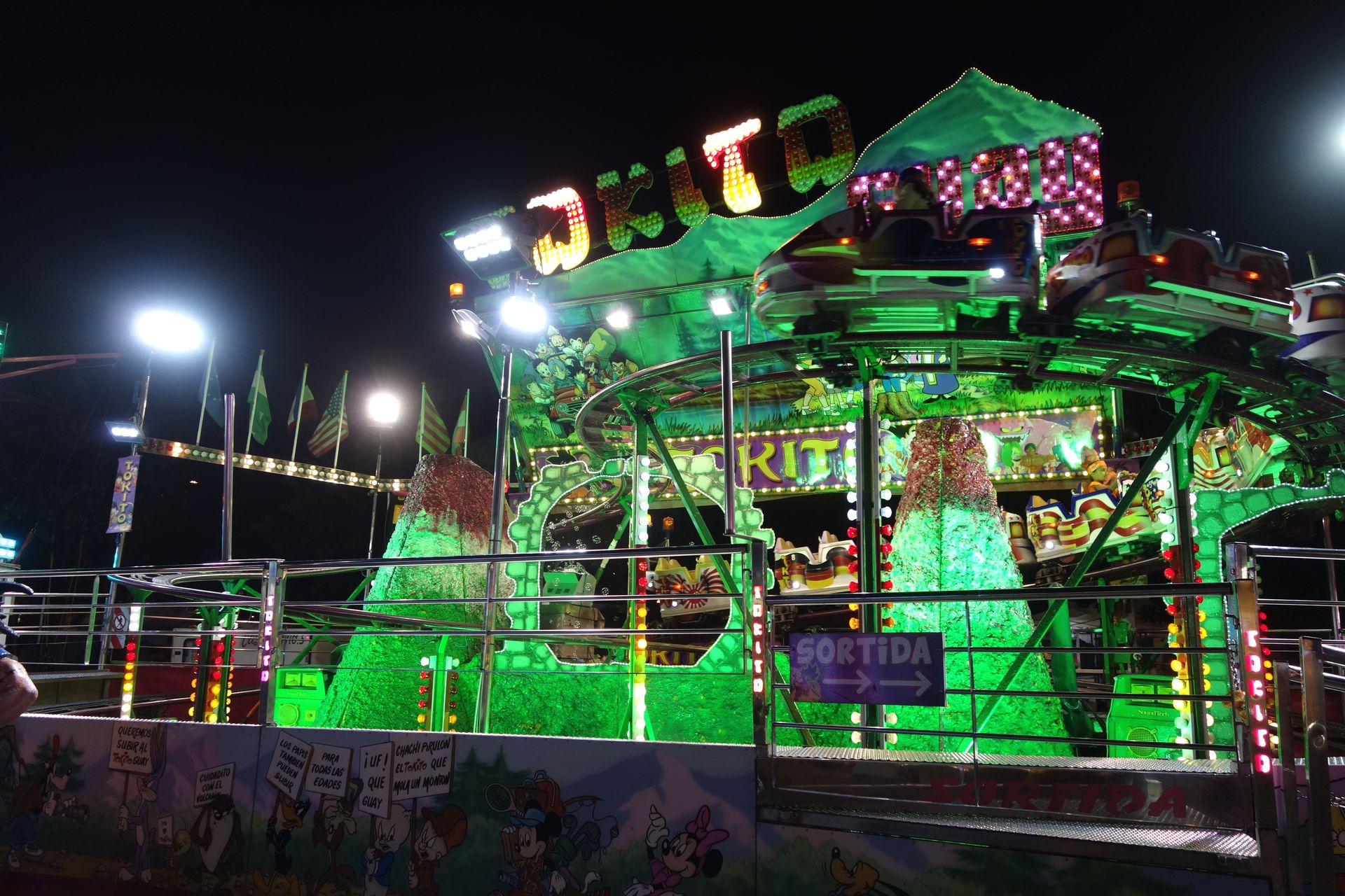 Von meinem letzten Sightseeing-Ziel, dem Arc de Triomf, fuhr mich ein Bus der Linie 39 direkt in den Hafen zur Kirmes. Die war wohl Teil des Festa Major de Barceloneta, also dem Stadtfest des Viertels Barceloneta. Das wiederum findet jedes Jahr um den 29. September, dem Michaeilistag (Sant Miquel, also der Erzengel Michael, ist der Schutzpatron des Viertels), statt. Um mich von hinten nach vorne durchzuarbeiten - und vor allem weil ich die erste Haltestelle verpasst hatte - stieg ich an der zweiten Haltestelle am Riesenrad aus. Dort standen außerdem gleich zwei der in Spanien äußerst beliebten Rundfahrgeschäfte des Typs Saltamontes direkt nebeneinander. Namentlich Canguro Show und Super Rana XXL.