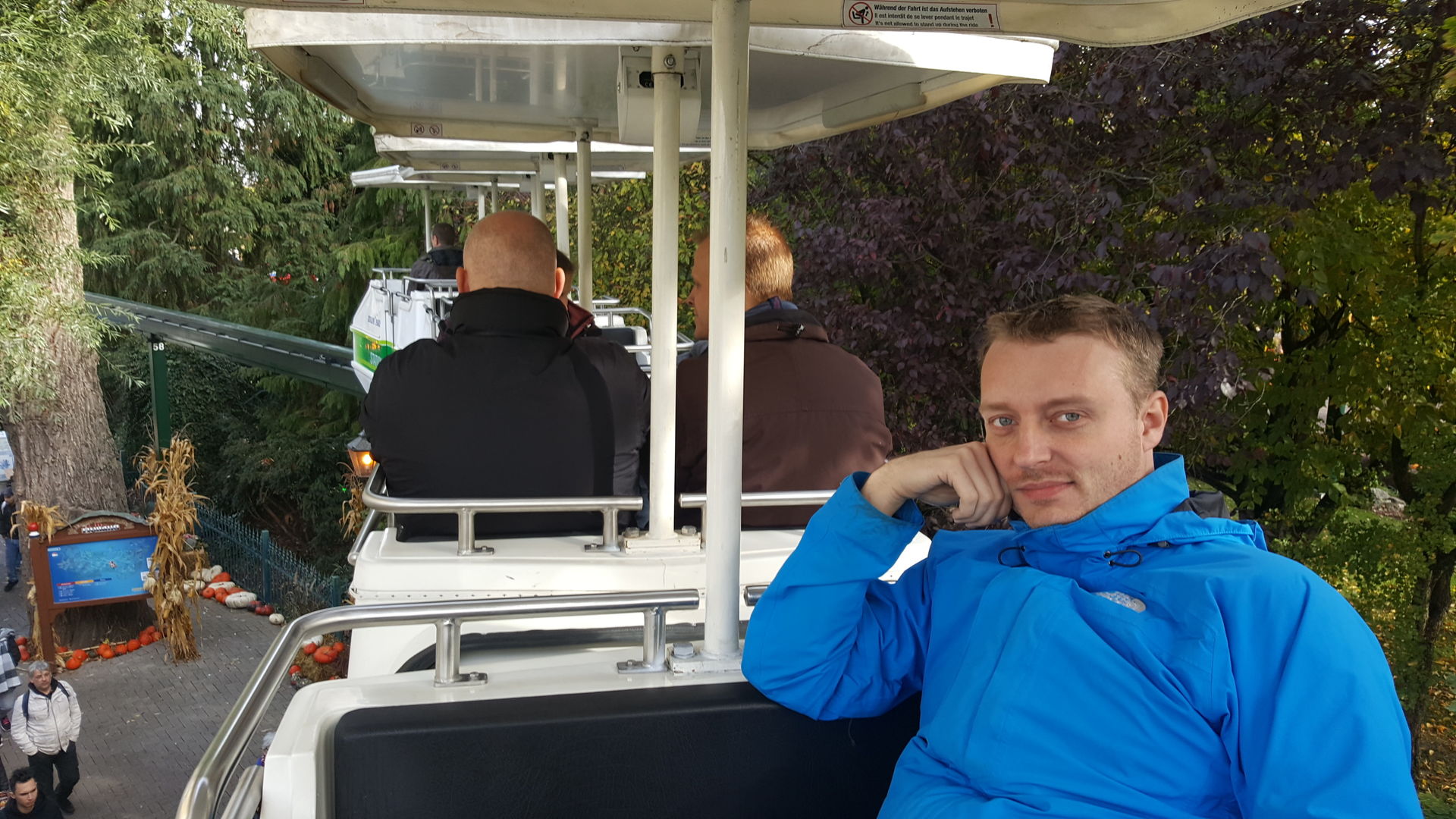 Mack) sei Dank, war dem aber nicht wirklich so. Da ich seit der onride-US-Westküsten-Tour 2013 noch immer leicht Halloween-geschädigt bin und der Preis für Traumatica zustätzlich zum eigentlichen Eintrittsticket mit eben mal 31€ zu buche schlägt, habe ich auf Traumatica, wie alle anderen außer den Kluths auch, verzichet. Flexis Hinweis, dass das Voletarium bereits vor 9 Uhr öffnen würde, führte dann dazu, dass insgesamt 14 Onrider um kurz nach 8 Uhr vor einem verschlossenen Tor noch vor dem Brunnen standen