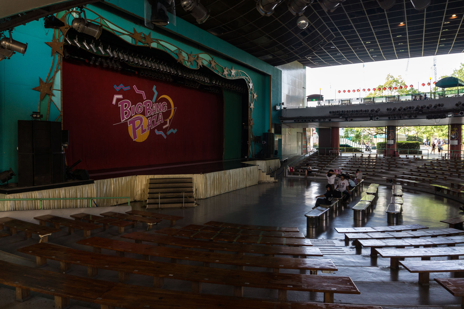 Nachdem wir das großzügig gestaltete Portal durchschritten haben befinden wir uns sogleich auf dem Space Bazar, der Mainstreet des Parks. Von hier aus wenden wir uns nach rechts in Richtung der Big Bang Plaza. Vorbei am riesigen Show-Theater, dem Anime-Museum Gundam World und der, bis auf einem Meteoriten und etwas Mondgestein, leerstehenden Astresta-Halle zieht es uns in Richtung der Achterbahn Venus GP, die wir bereits auf dem Weg zum Freizeitpark bestaunen durften.