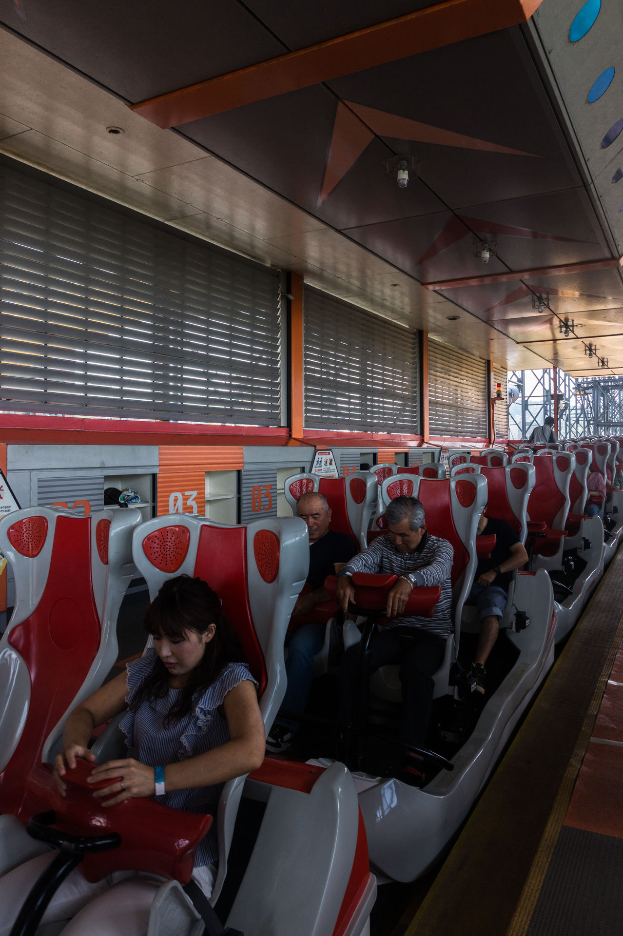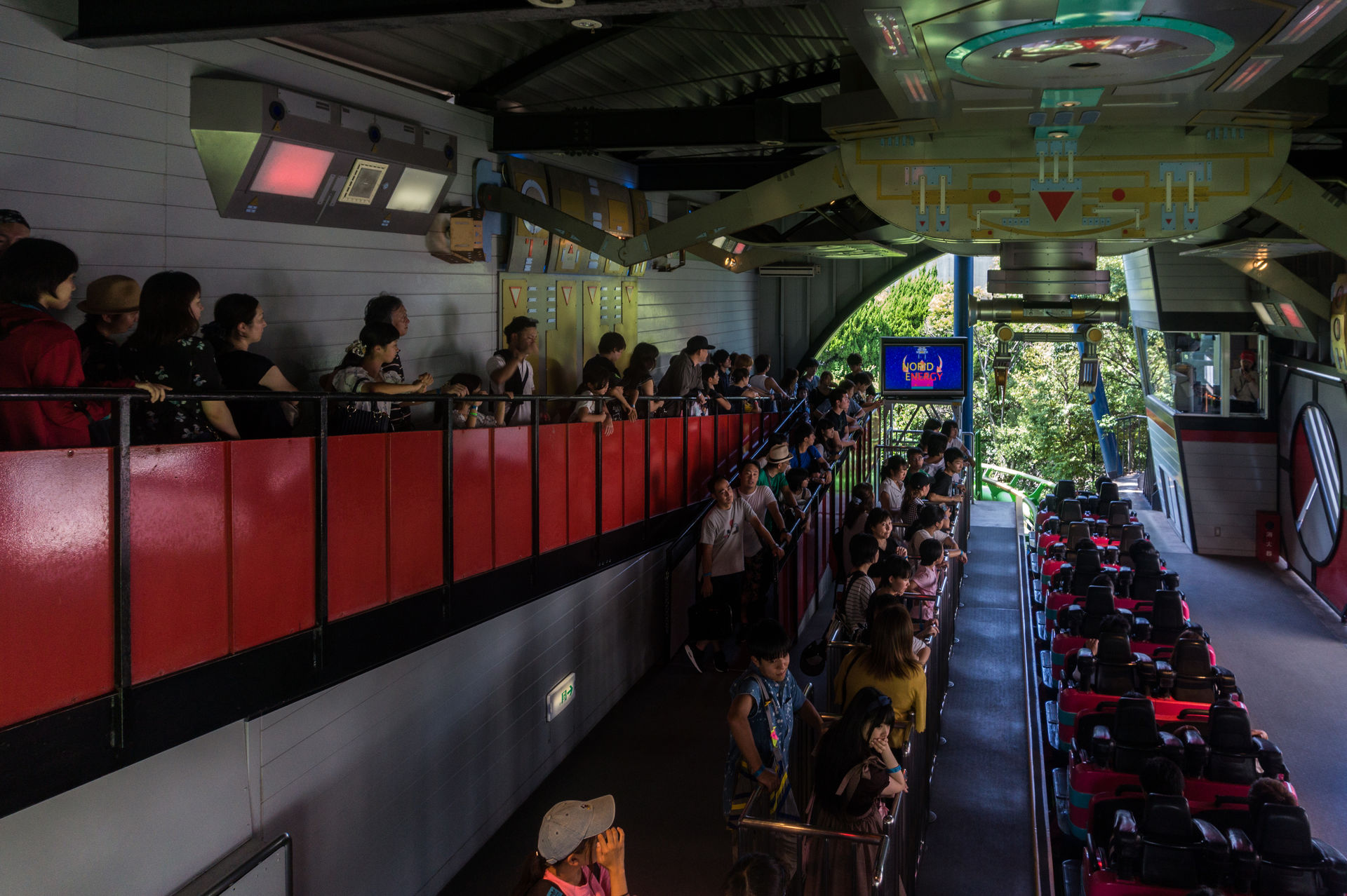 Nachdem man die überaus nervtötende Queue samt Daueransage vom Band überstanden hat darf man das Treppenhaus hinauf zur Station erklimmen und dort auch noch einige (viele) Minuten warten. Wie sollte es in der Space World anders sein, wird hier natürlich nicht mit der vollen Kapazität gefahren und so darf man sich etwa alle zehn Minuten über einen frisch abgefertigten Zug freuen. Bei 24 Personen pro Zug immerhin eine Kapazität von sagenhaften 150 Personen pro Stunde, statt der ursprünglich mal möglichen 1500 Personen.