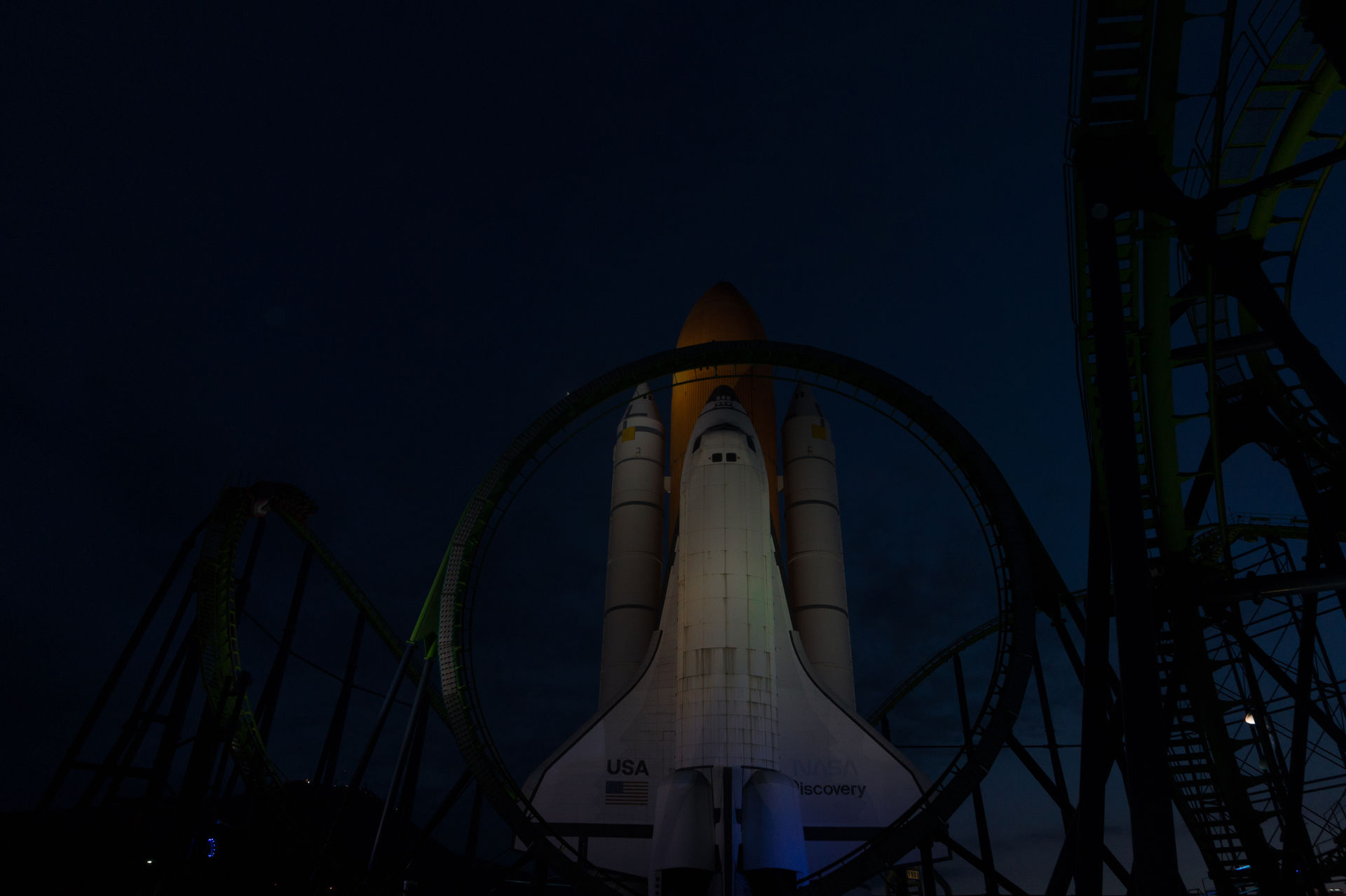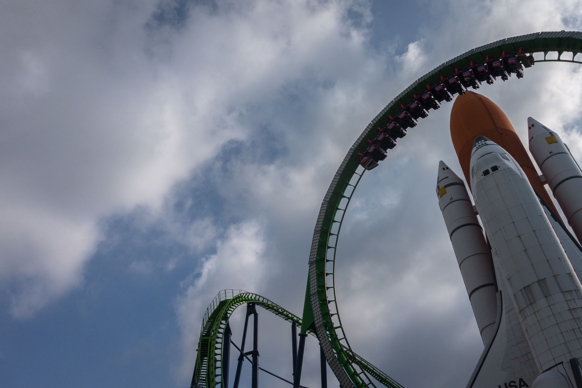 Dieser ist dann auch zügig abgefertigt, woraufhin man die Station in Richtung des Lifthügels verlässt. Nach einer Linkskurve wird man per Kette auf die Ausgangshöhe von 40m befördert. Oben angekommen bleibt ein kurzer Moment, ehe man sich voller Vorfreude auf der Rückseite des Space-Shuttles Discovery in die Tiefe stürzt. Mit der nun aufgebauten Geschwindigkeit erklimmt man eine hochgeständerte Wendekurve, bevor man sich zielgenau in den beinahe kreisrunden