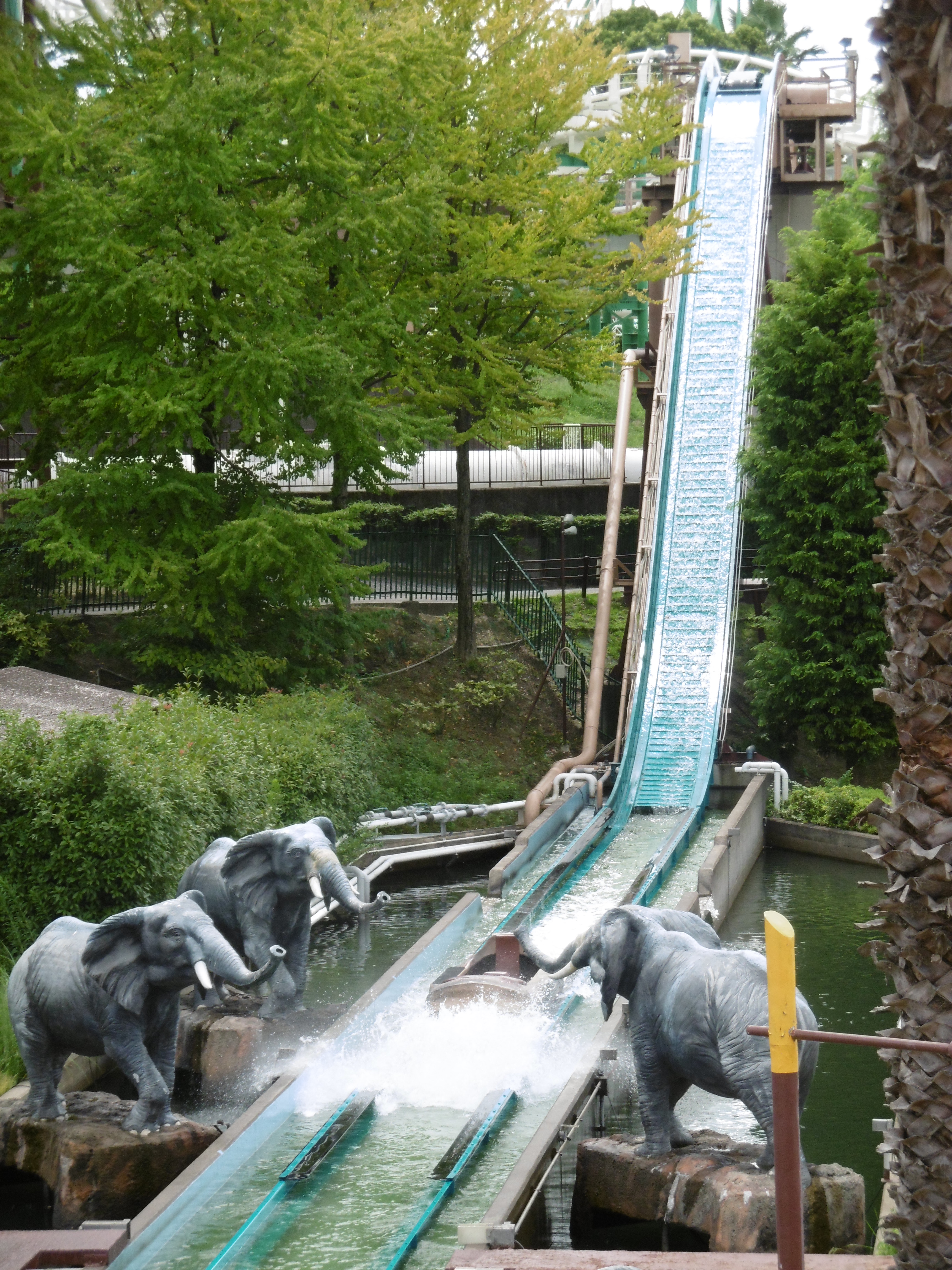 Leider hielt sich der Nässegrad sehr zurück. Instinktiv bin ich den zwei Japanern vor mir gefolgt, wurde dann aber wieder aus dem Boot gebeten. Bei dem Völlegrad bekommt jede Besuchergruppe sein eigenes Boot, womit aber leider einfach das Gewicht gefehlt hat, wodurch nur 4-5 Tropfen den Weg ins Boot fanden. Dazu ist das Rafting als eine der wenigen Anlagen im Park auch nicht sonderlich ansehnlich. Die Fahrt läuft die ganze Zeit nur durch einen Betonkanal.