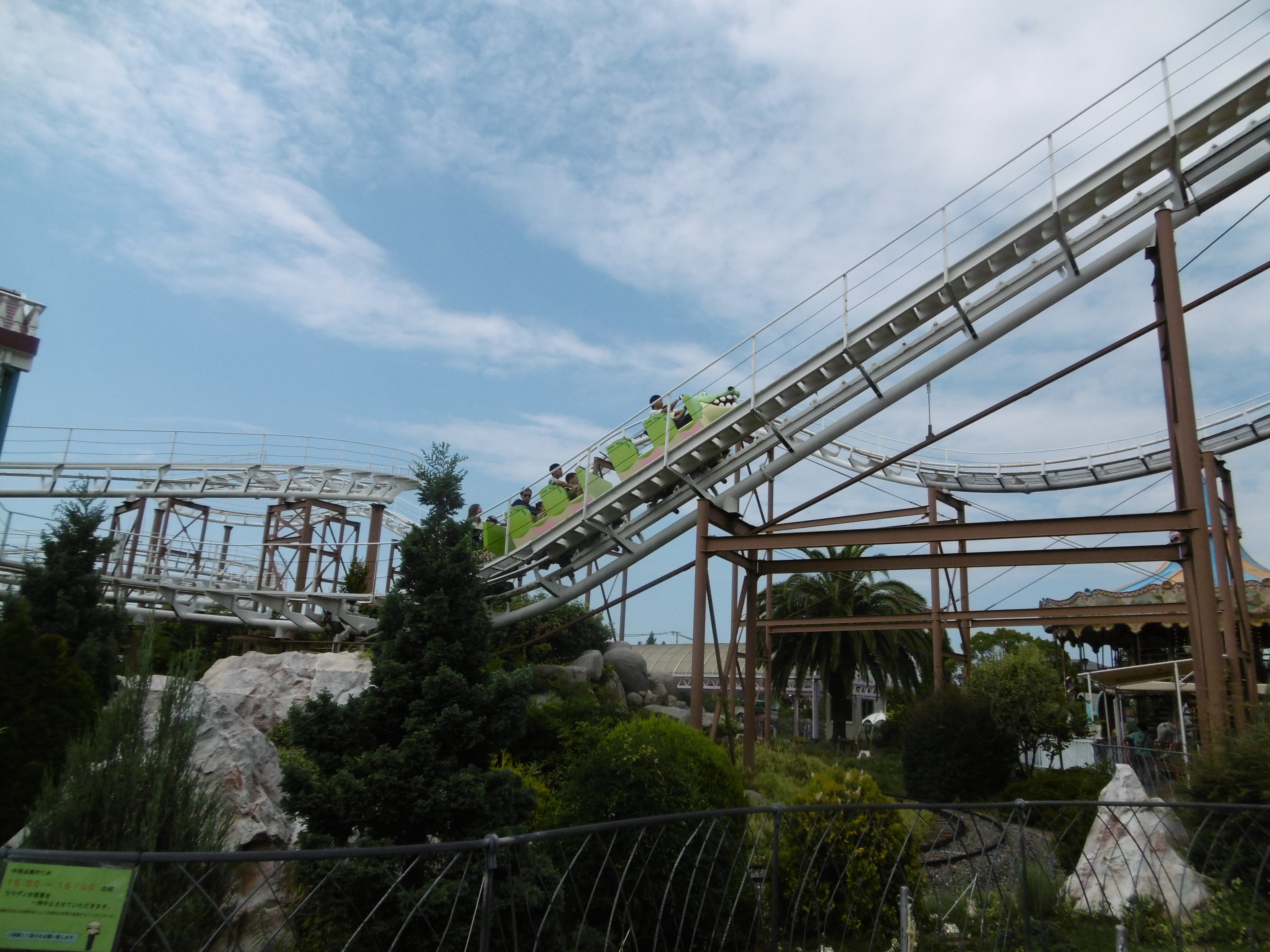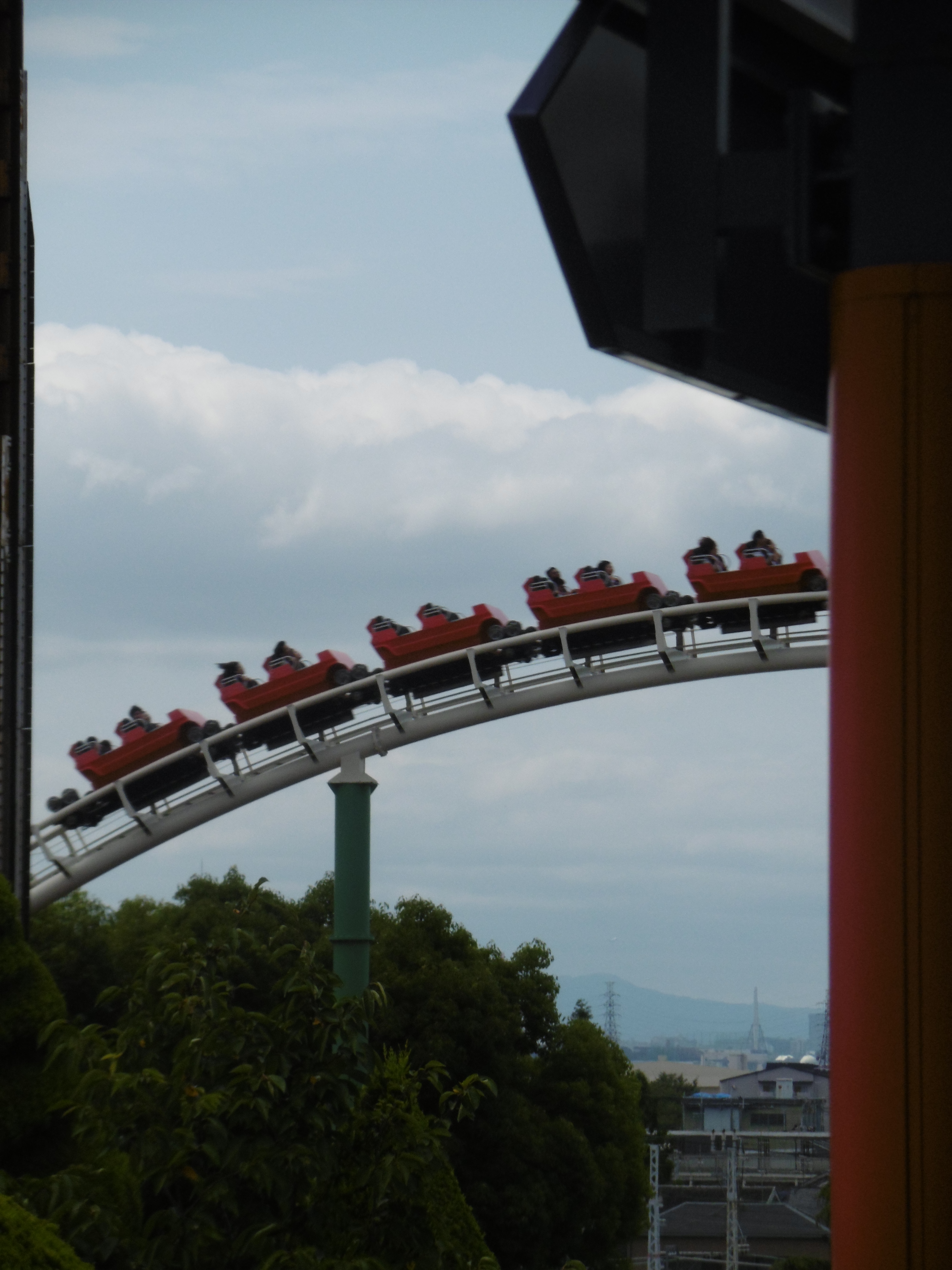 Die Fahrt selbst ist dann zwar extrem lang und mit 70 km/h die schnellste Attraktion im Park, jedoch sehr familienfreundlich gehalten. Neben der echt tollen Aussicht auf Osaka sind dabei aber noch zwei Stellen erwähnenswert: Nach der auf dem oberen Bild gezeigten Wende und dem folgenden Hügel schließt sich eine Abfahrt an, die von mir bei RCT gebaut sein könnte. Mit einer leichten Rechtskurve und somit leichtem Banking nach rechts geht es hinunter ins Tal. Da sich nach der Ende der Abfahrt direkt eine weitere Rechtskurve anschließt und kein Platz mehr für ein passendes Banking war, ist dieser tiefste Punkt eben auch nach rechts geneigt. So gibt es aufgrund des abrupten Richtungswechsels einiges an Druck auf die rechte Hüftseite und schon von weitem ein großes Lachen auf unserem Gesicht.
