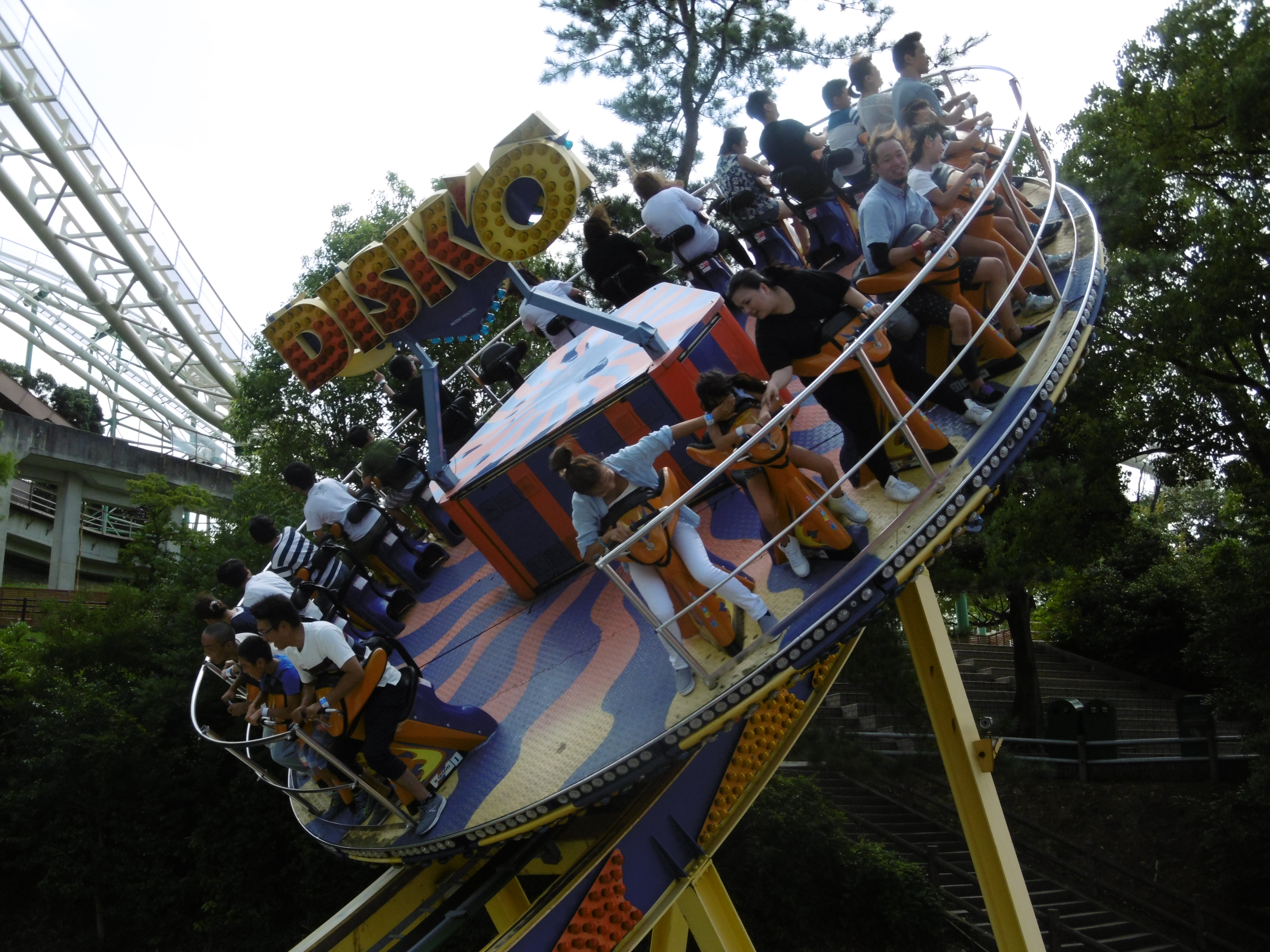 Wieder so eine Bahn, die besser nicht hinten gefahren werden sollte. Die erste Fahrt unternahmen wir noch weit hinten im Zug, wo wir uns zum ersten Mal in die engen Sitzreihen zwängen durften. Lustig ist es dann den Japanerinnen zu zusehen, die beim Hinsetzen denken, dass bald eine Sitzbank folgt, die sich jedoch erst nach einigen Zentimetern blicken lässt und so die Mädels mit einem „Uh“ und Gelächter in den Zug plumpsen. Für größere Leute würde ich zudem empfehlen auf die jeweils zweite Reihe des Wagens zu verzichten. Die zweite Fahrt unternahmen wir deshalb in der 3. Reihe des Zuges, da dort mehr Stauraum für die Füße ist. Dies musste dann auch der einzig weitere Ausländer im Park (wir schätzten ihn aufgrund seines Aussehens auf eine Herkunft aus den skandinavischen Ländern) feststellen, der sich vor uns in die 2. Reihe setzen wollte. Nach knapp 10 Sekunden stand er aufgrund seiner Größe wieder auf und ging in den hinteren Teil des Zuges.