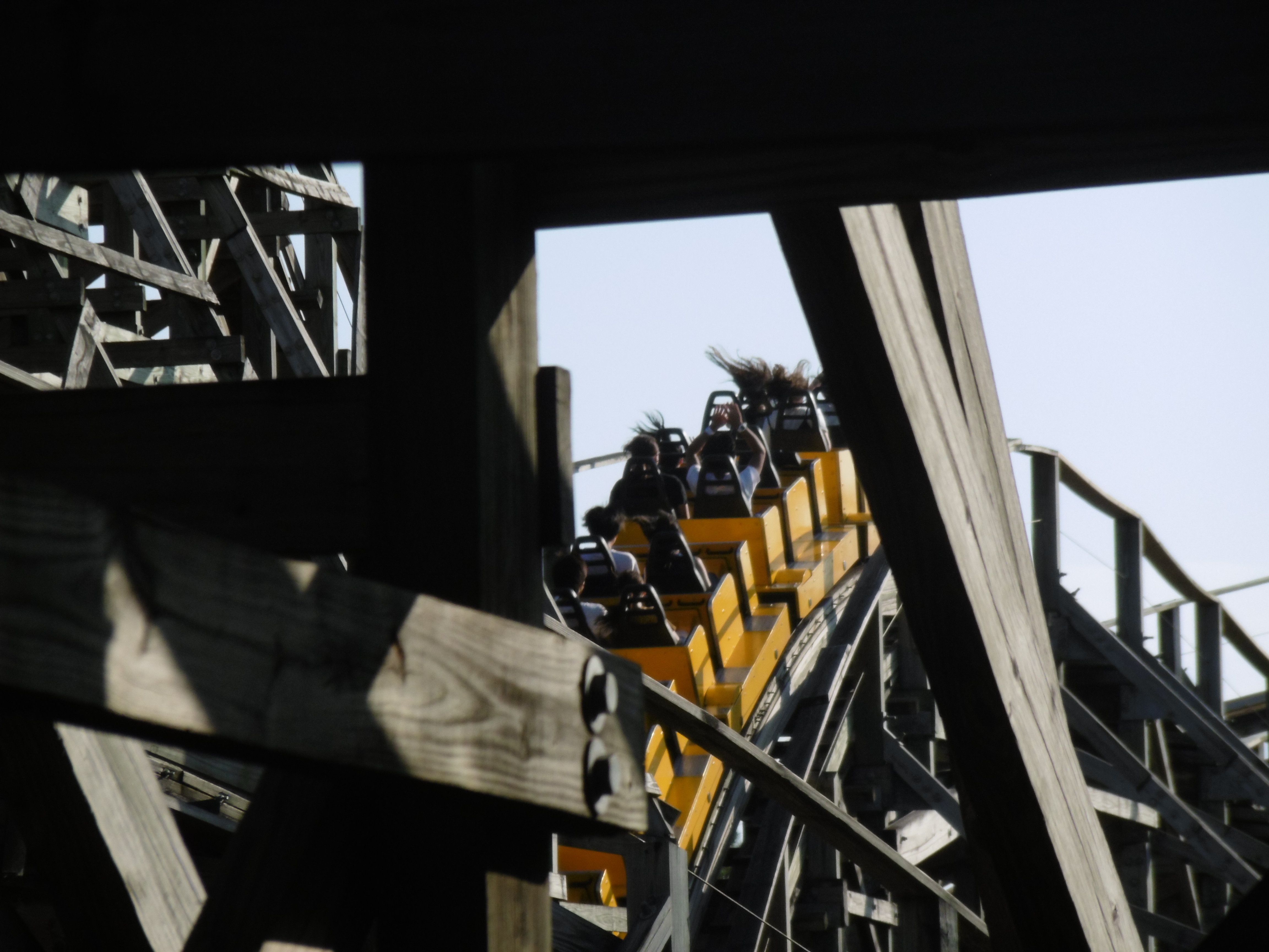 Auch wenn die Strecke nur knapp 700 Meter lang ist, hat dies länger gedauert, wodurch Tobias vor seinem Wasserpark-Besuch und ich vor dem Marathon noch die sowieso eingeplante zweite Runde mit dem Falken einschoben. Wer ein paar angenehme Airtimemomente haben möchte, sollte hinten, wer eher auf drei etwas heftigere Sitzheber (davon einen richtig knackigen) steht vorne zusteigen. Wer Holzachterbahnen genauso mag wie ich und in kürzester Zeit so viele Runden wie möglich schaffen möchte, der fährt einfach irgendwo. Bei dieser Bahn macht es jetzt nicht so einen großen Unterschied, ob er oder sie z.B. ganz hinten oder in der drittletzten Reihe sitzt. Leider war dann doch irgendwann 17 Uhr und die letzte Runde ging für mich in der letzten Reihe von statten (ich mag heftigere Airtime nicht so …).