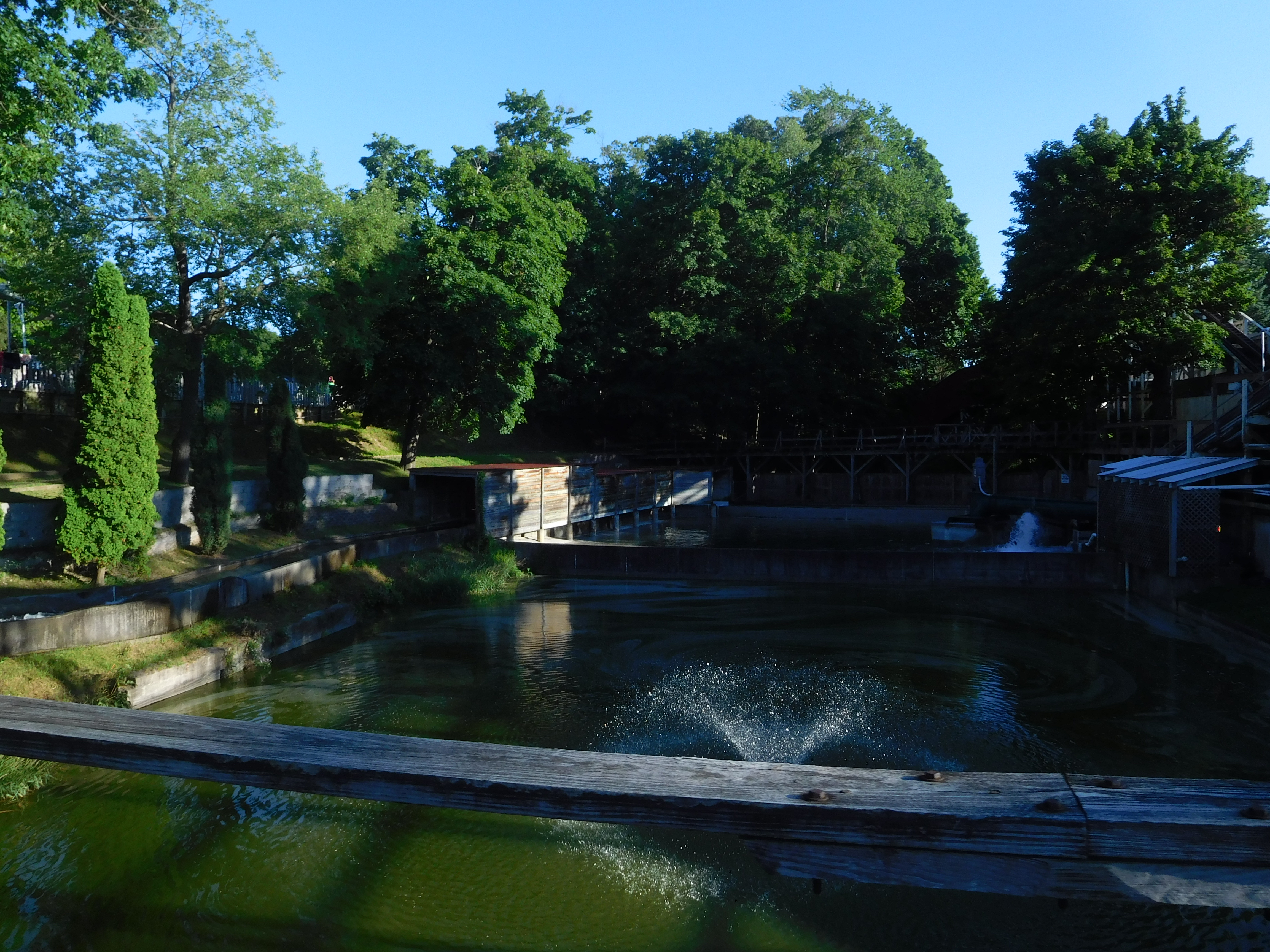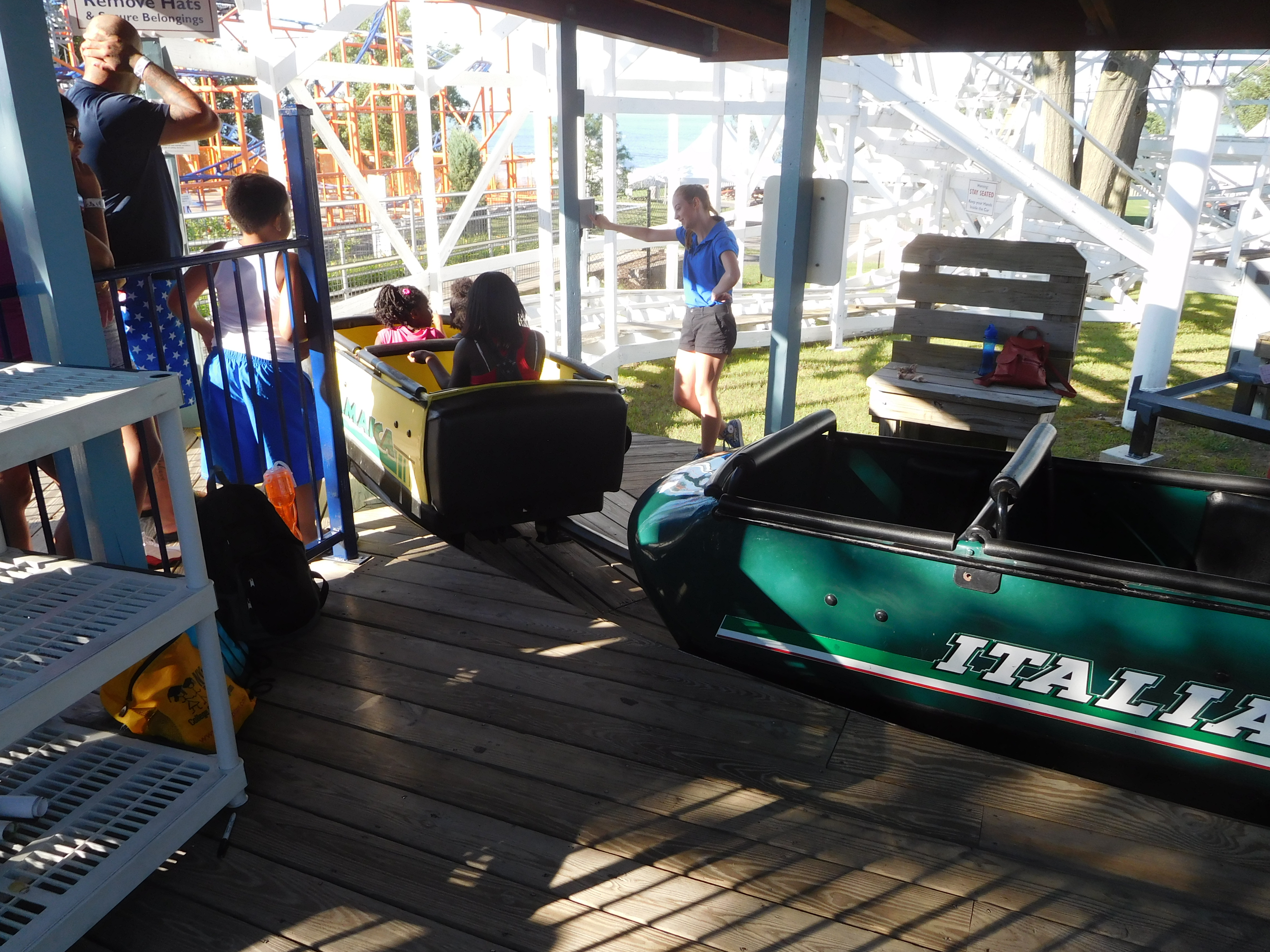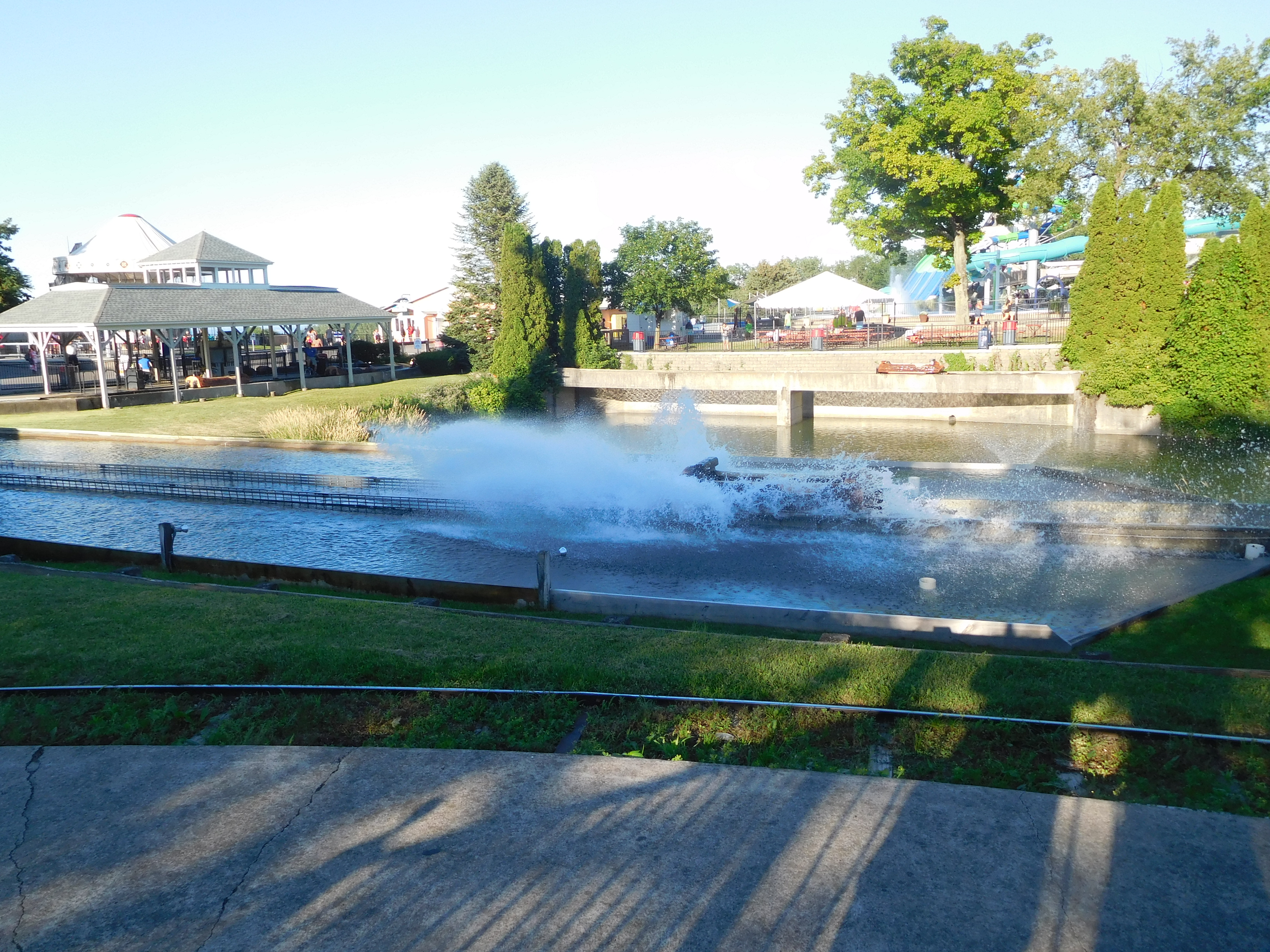 Wie beim Jack Rabbit war die Wartezeit nicht vorhanden. Schon erstaunlich, wie leer Freizeitparks in den USA am 4.Juli sein können. Da es zu fünft etwas eng im Boot geworden wäre, teilten wir uns in 2 Gruppen für die Boote auf. Ich setzte mich vorne ins Boot. Das Layout führt um einen kleinen See/Teich herum. Zu Beginn verläuft die Strecke größtenteils geradeaus und es gibt zwischendrin immer mal ein paar kleine, lustige Mini-Drops. Es wird auch ein Tunnel passiert, der auch ganz witzig ist, aber keine extremeren Überraschungsmomente bietet, wie beim Jack Rabbit.