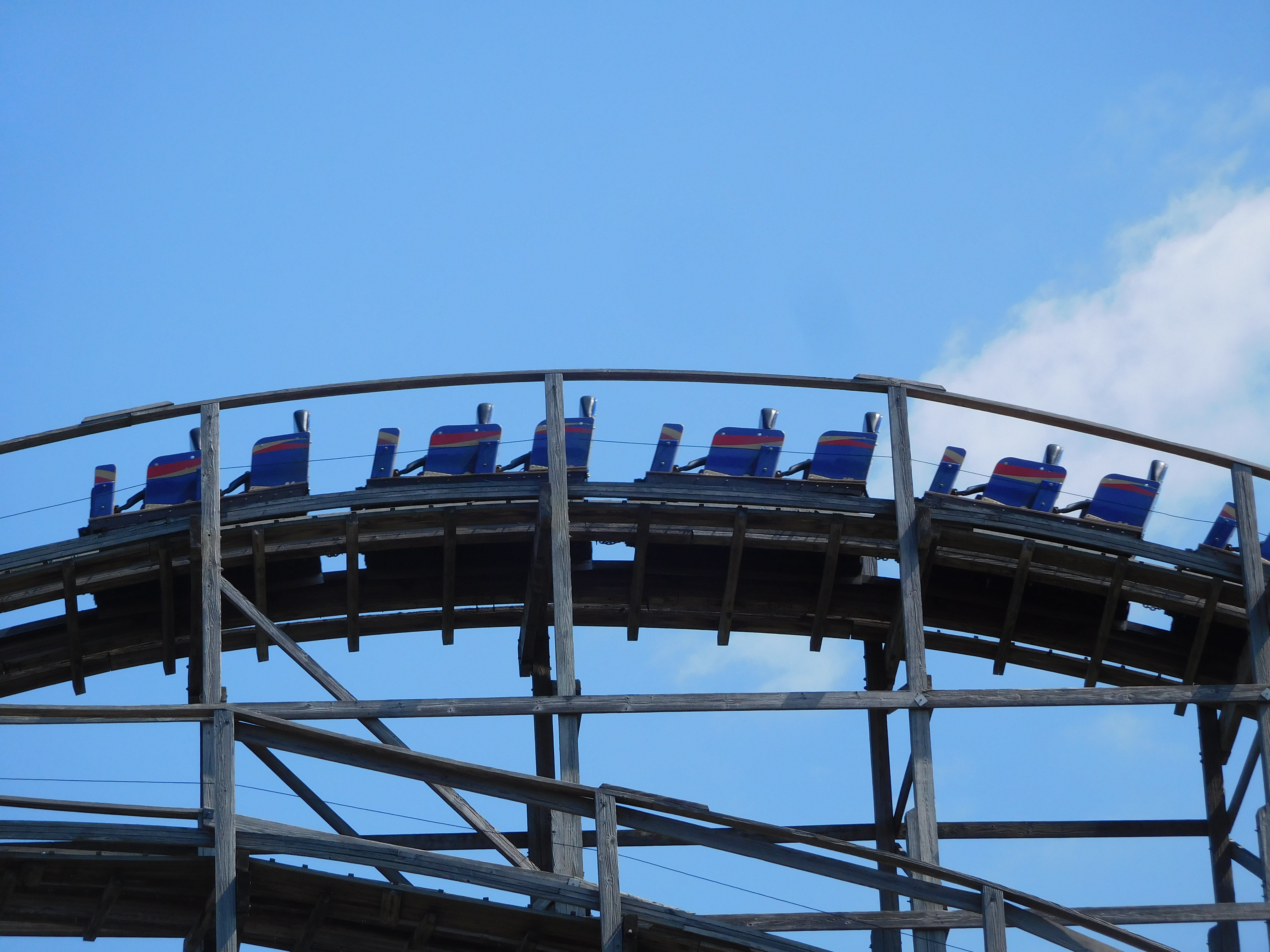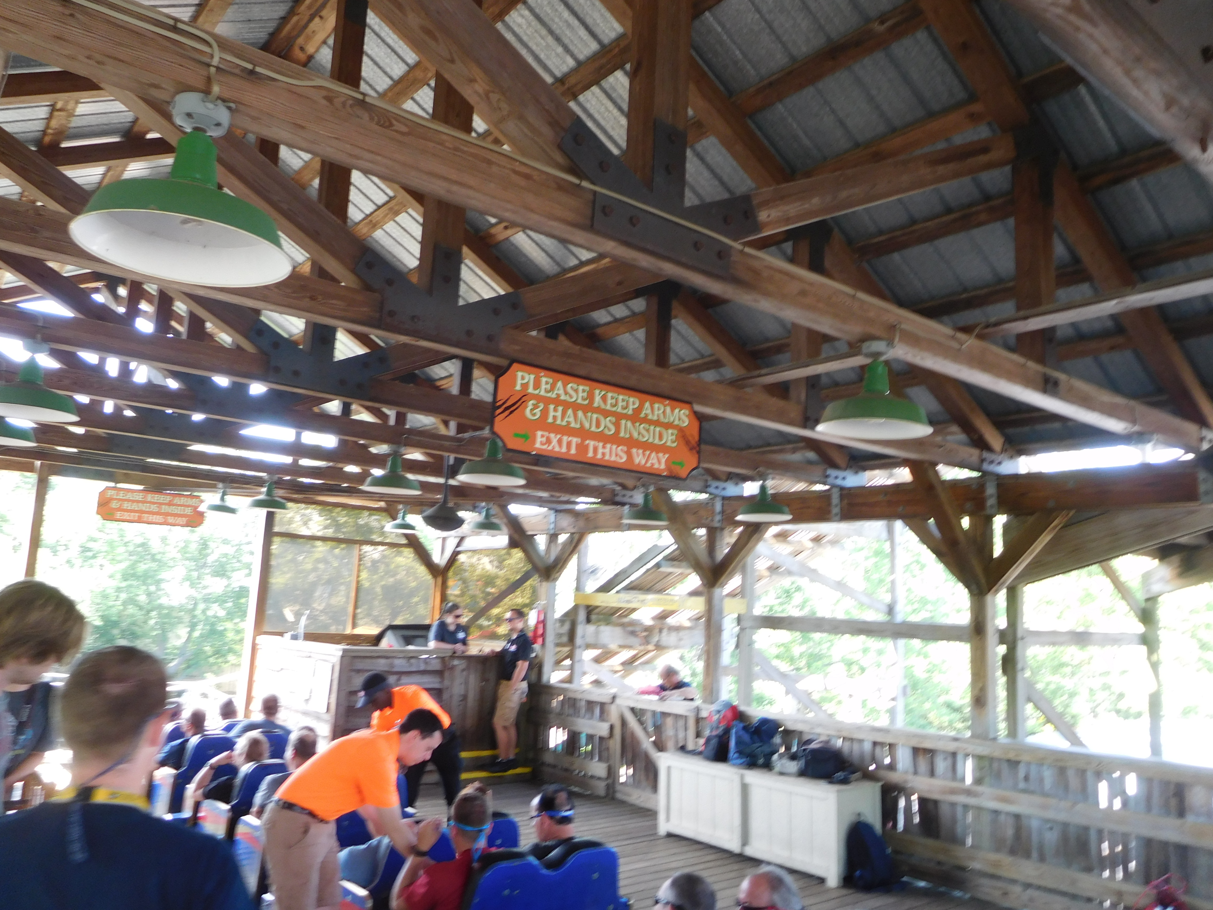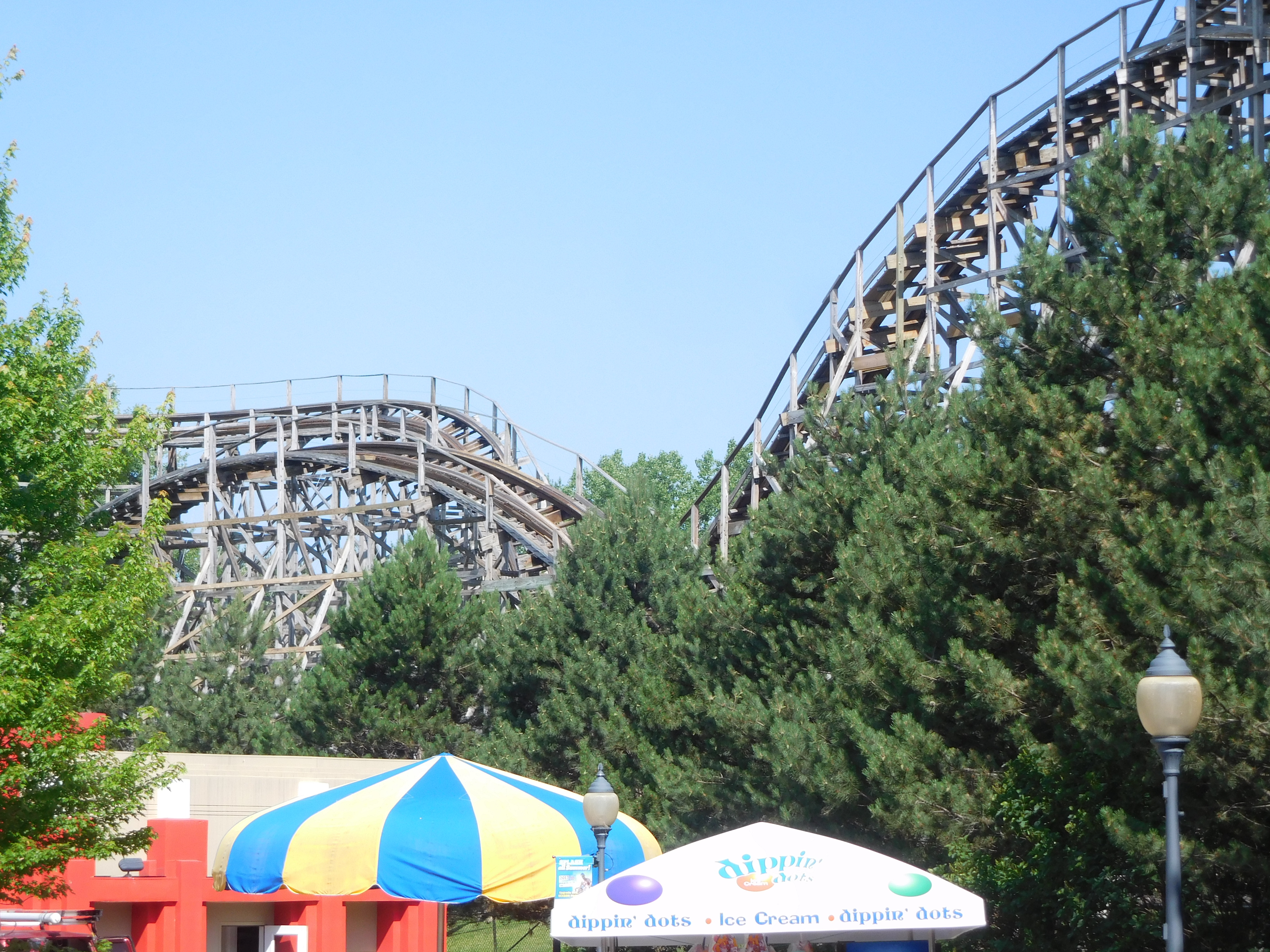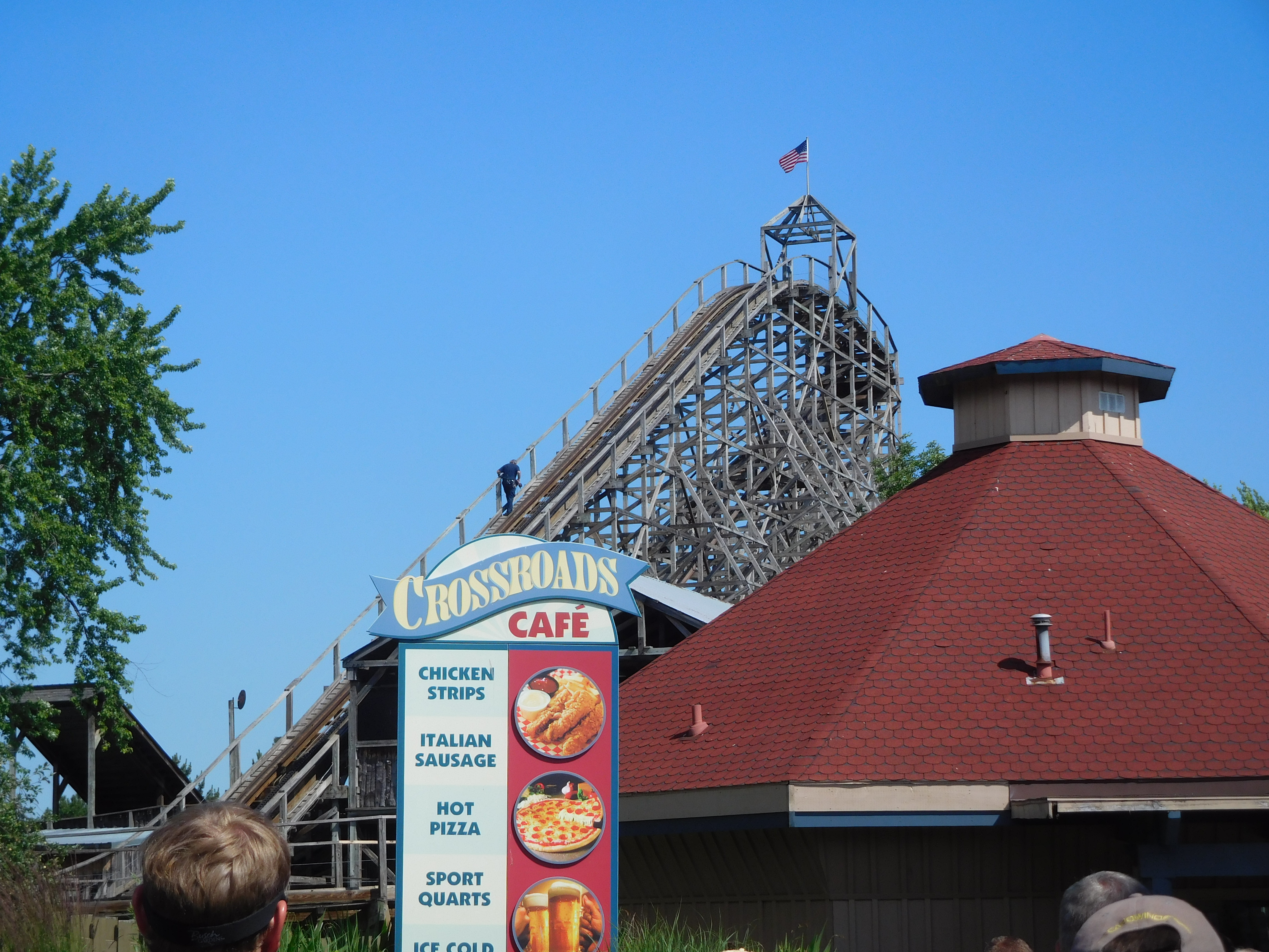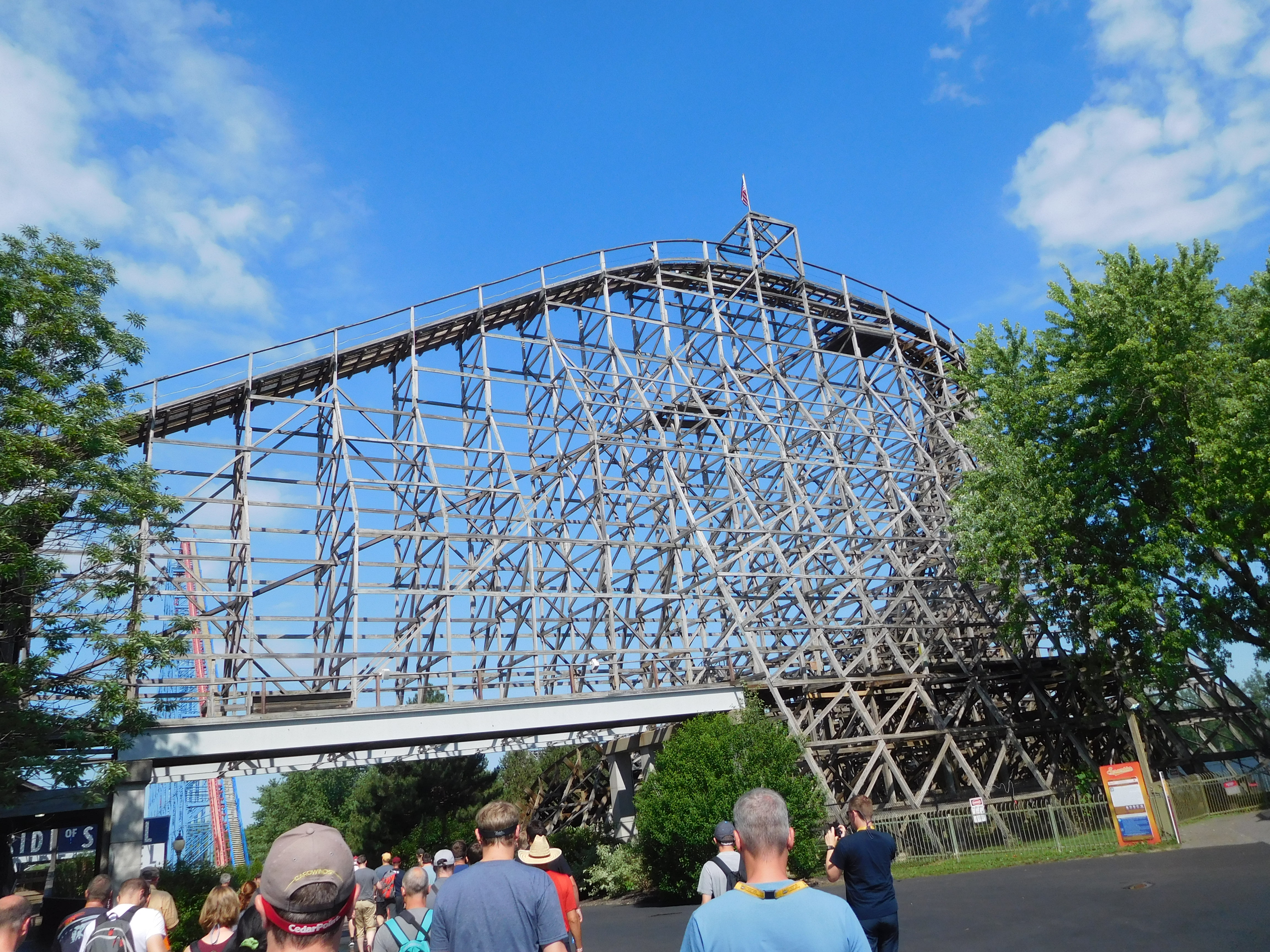 Die erste ERT war ja leider eher weniger gelungen, doch zumindest ließ man uns ja die erste Fahrt dort absolvieren. Doch man muss dem Park zugutehalten: Er hielt sogar sein Versprechen. Wir sammelten uns draußen und gingen zusammen zu der Bahn, auf der ursprünglich die ERT geplant war. Die Rede ist von der 1990 von der Dinn Corporation gebauten Holzachterbahn