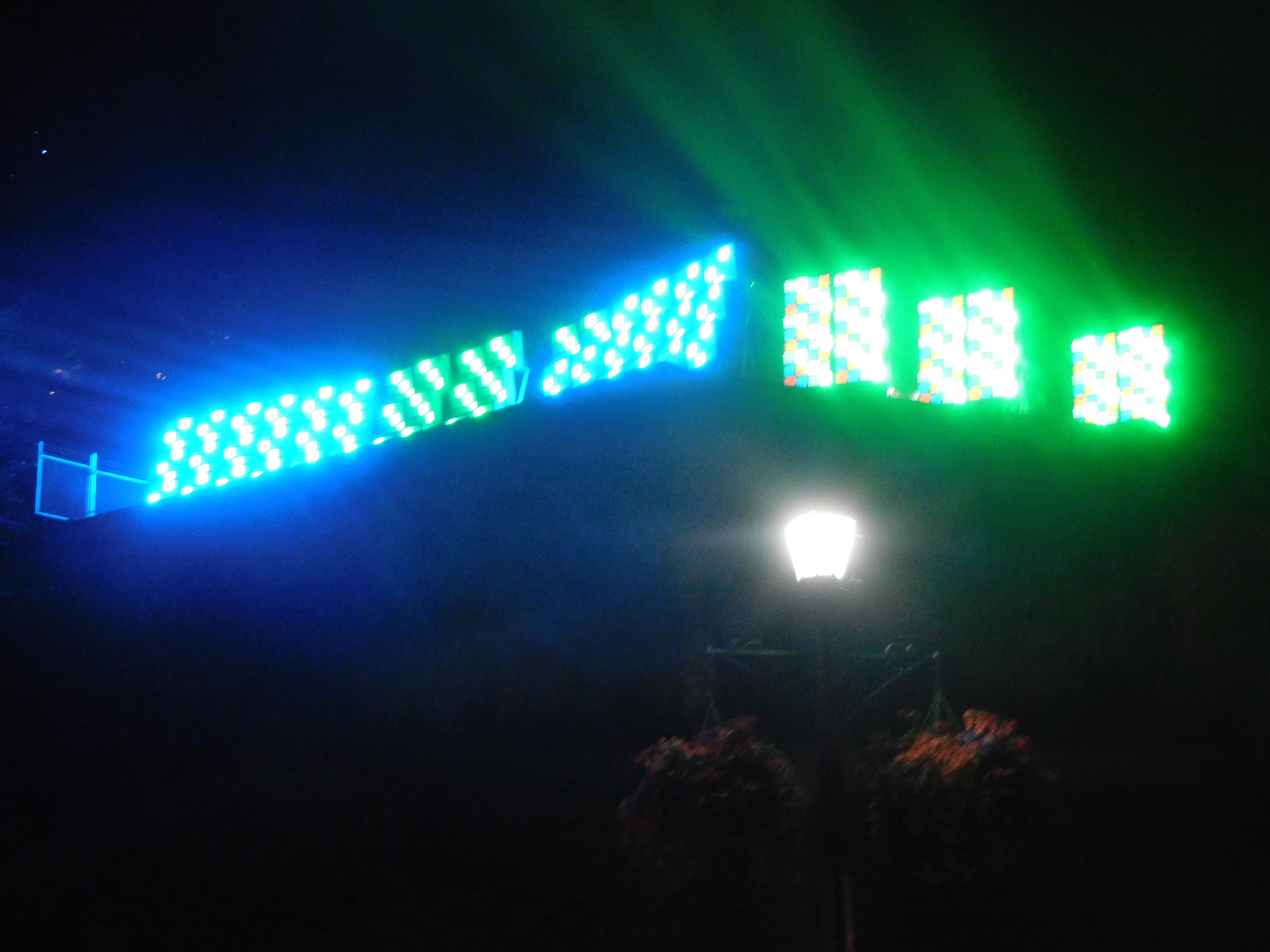 Diese Strahler beleuchten in den Abendstunden die Fälle in unterschiedlichen Farben.