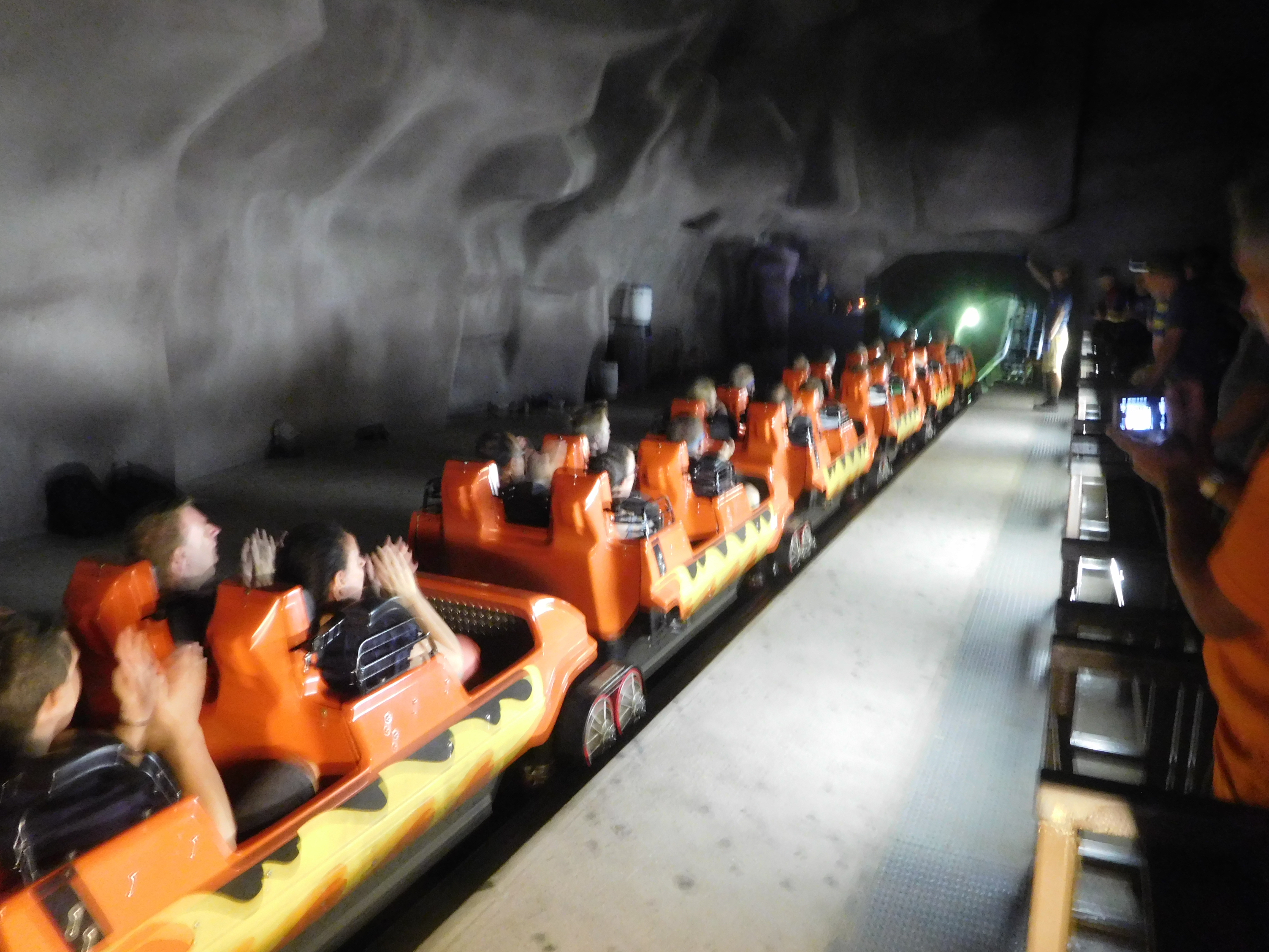 Entsprechend des Namens geht es in einen Berg hinein. Es ist sehr dunkel im Wartebereich und die Bilder sind leider alle nichts geworden. Dieses Bild vom Einstiegsbereich ist noch das am wenigsten Misslungene.