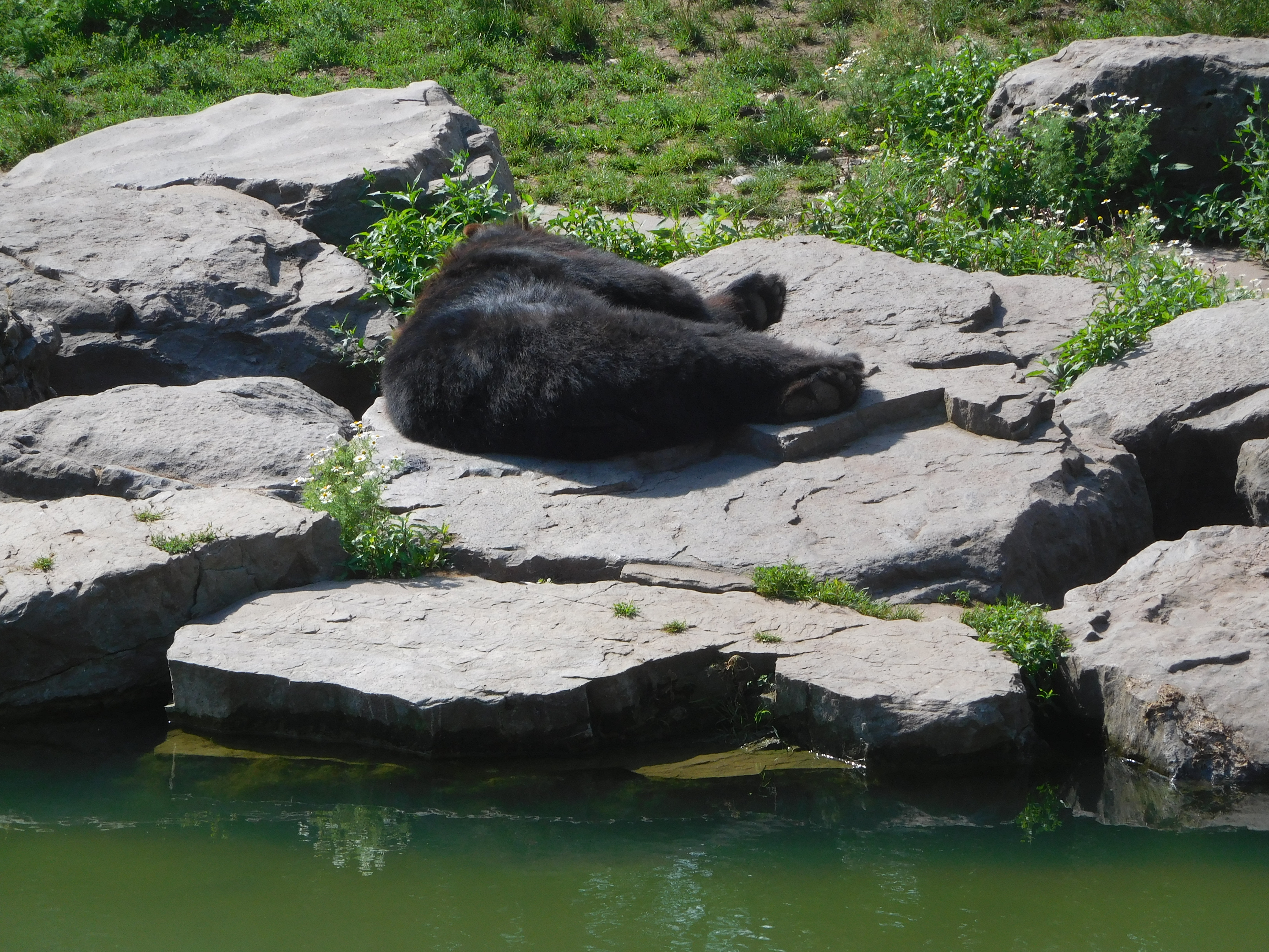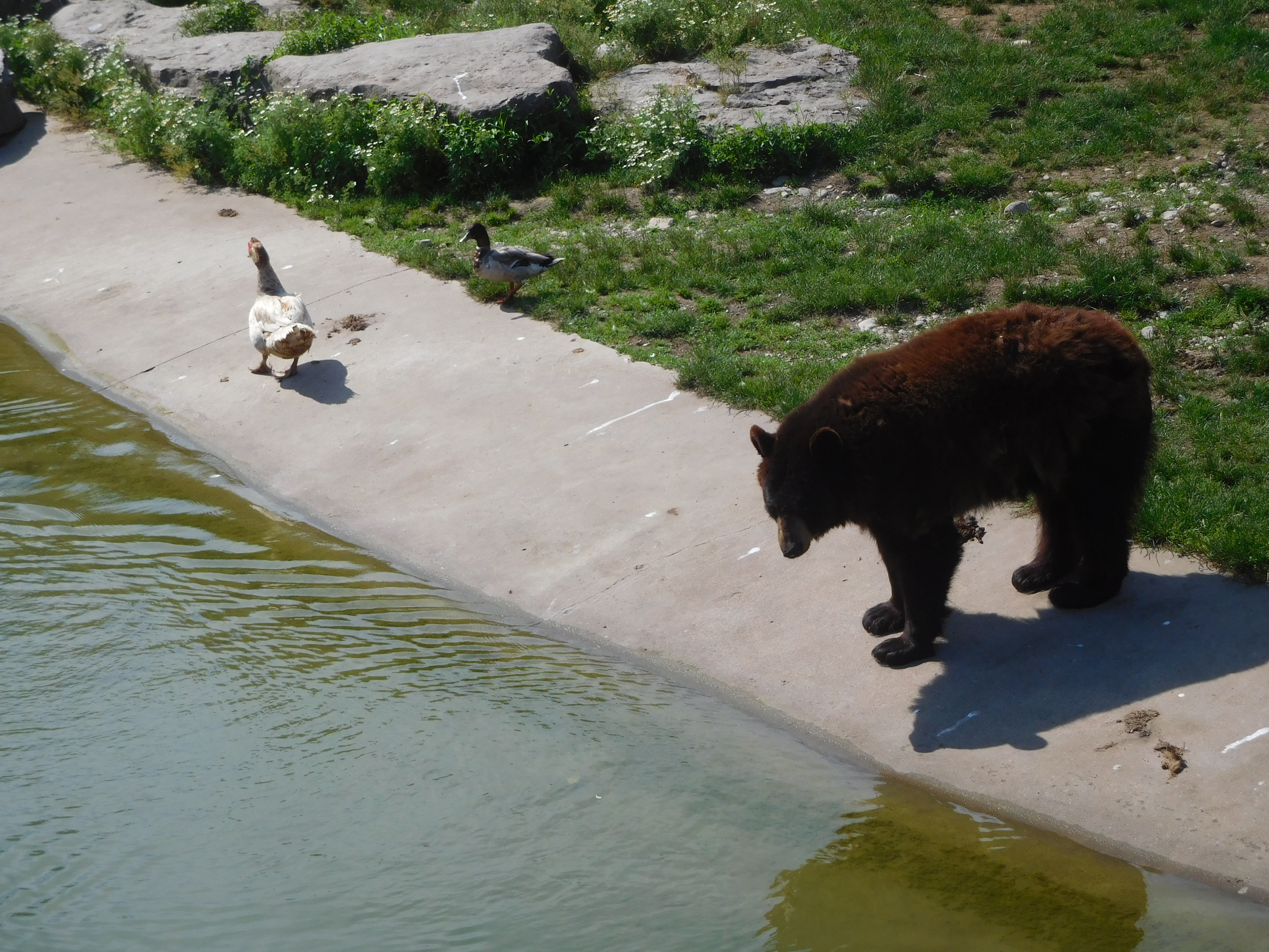 Die mir schon aus Texas bekannten Moschusenten waren hier genauso furchtlos und spatzierten vor dem Bär herum. Doch das Desinteresse war beidseitig.