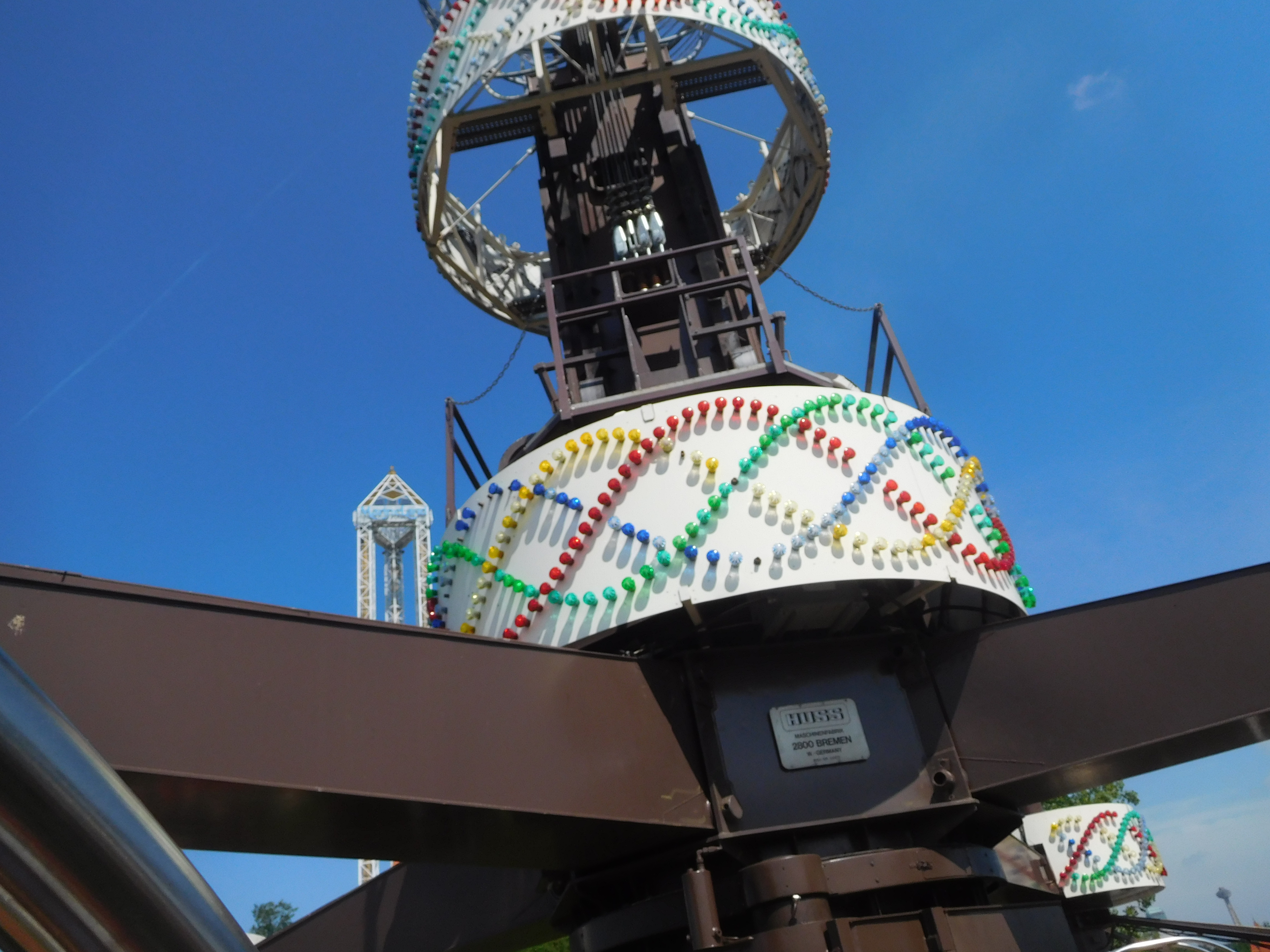 Dann ging es am Boden langsam drehend los, die Drehbewegung wird schneller und es geht noch ein wenig schneller drehend aufwärts. Auf der Mitte bleibt man kurz stehen und dreht sich nur.