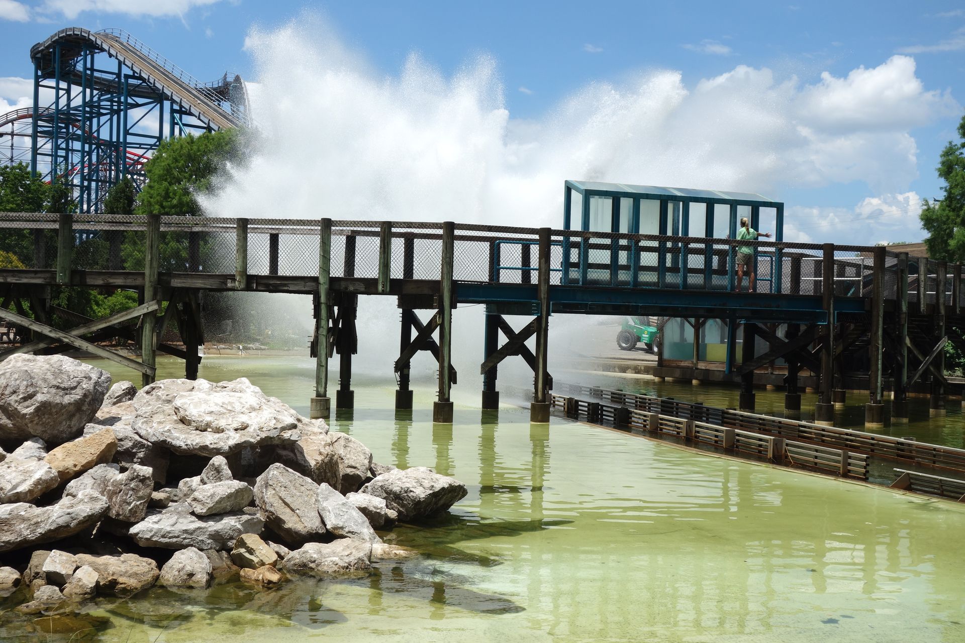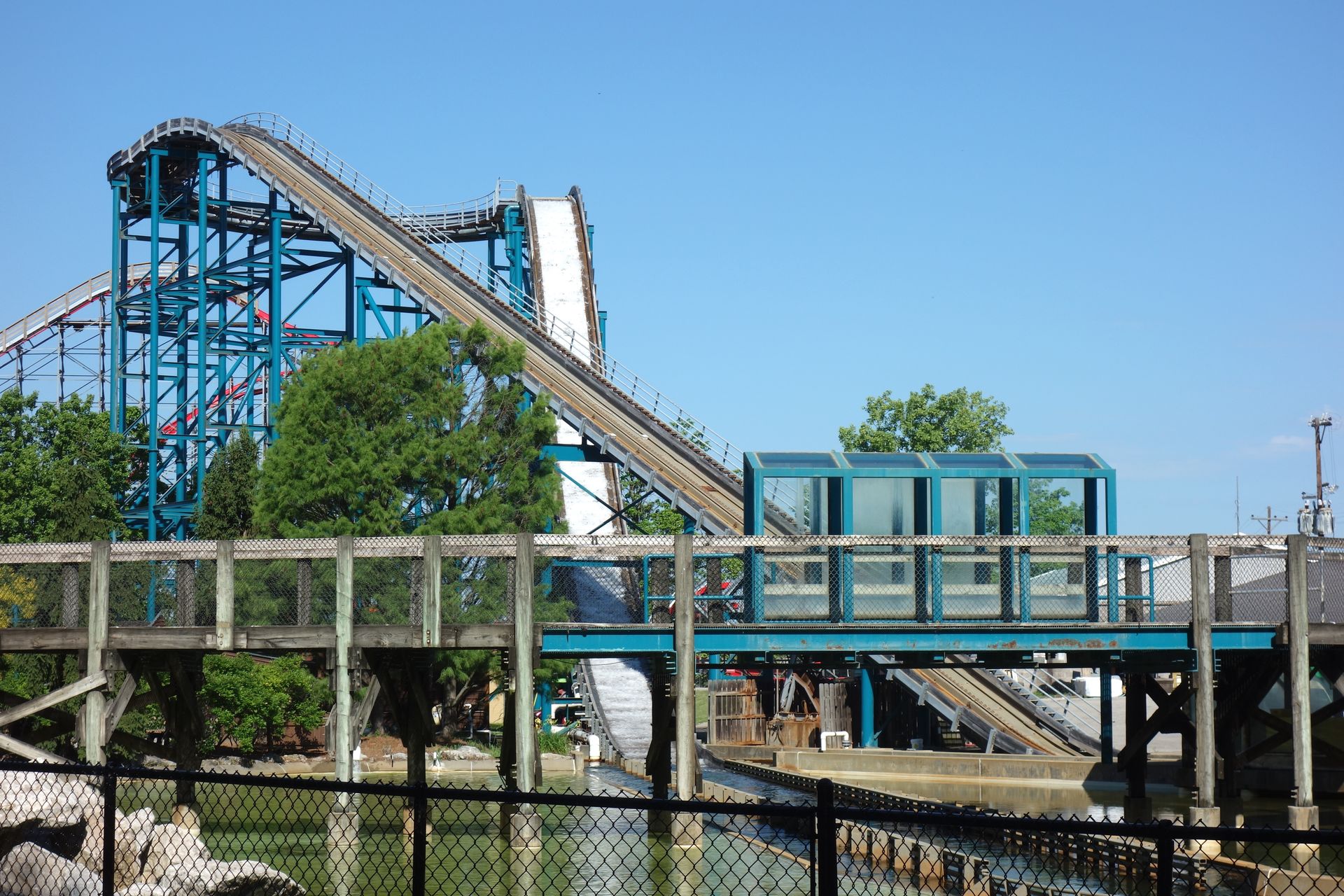 Hier sieht man übrigens noch schön die Fundamente des Shuttle Loops. Auf den großen Blöcken unterm First Drop ruhte einst der Looping.