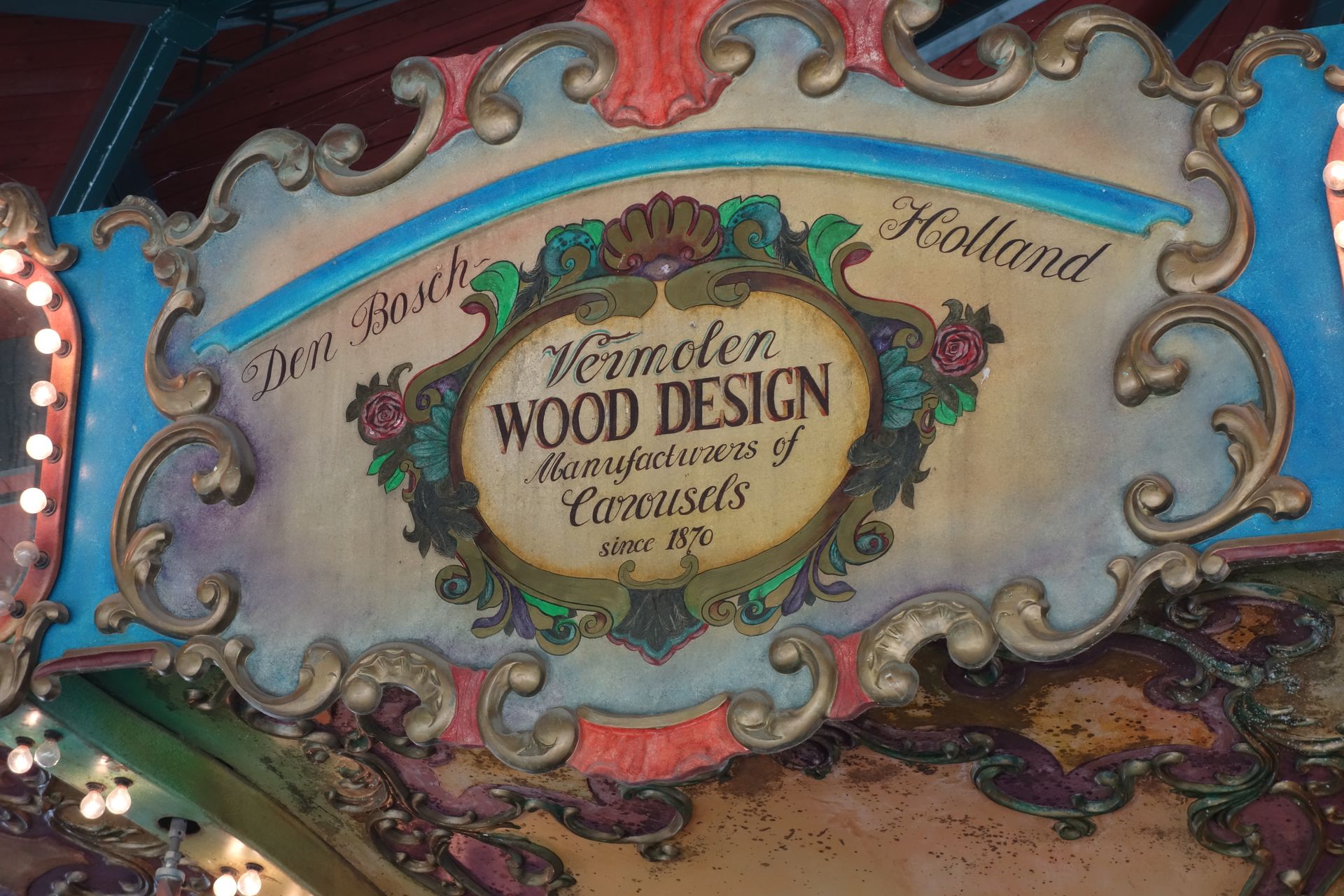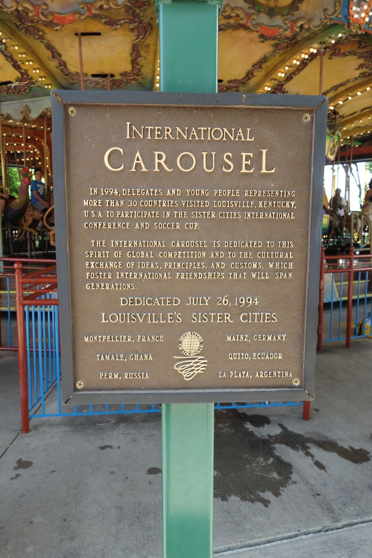 Leider findet man recht wenig über dieses Bella Musica getaufte Karussell. Wikipedia listet einzig 1996 als Eröffnungsjahr und Chance Rides als Hersteller. Angesichts des Designs wollte ich allerdings mehr erfahren. Glücklicherweise gibt es das Programm "Education in Motion" für Schulklassen, die mithilfe von Arbeitsmappen den Park erkunden können. In einer solchen fand ich die gesuchten Infos. Demnach wurde Bella Musica tatsächlich schon 1994 gebaut, und zwar von der niederländischen Firma Wood Design. Deren Referenzliste enthält auch Kentucky Kingdom, sodass ich hier eher dem Park als Wikipedia glauben möchte. Außerdem weist eine Gedenktafel darauf hin, dass das damalige International Carousel angesichts einer Konferenz samt Fußball-Turnier der Partnerstädte Louisvilles mit Vertretern aus über 30 Ländern errichtet wurde. Besonders ist das Karussell deshalb, weil es die berühmtesten Karussellbauer der Welt feiert. Sämtliche Figuren sind handgeschnitzt und wurden jenen der verschiedensten Hersteller nachempfunden. Und die Pferdeschwänze sind wohl aus echtem Pferdehaar.