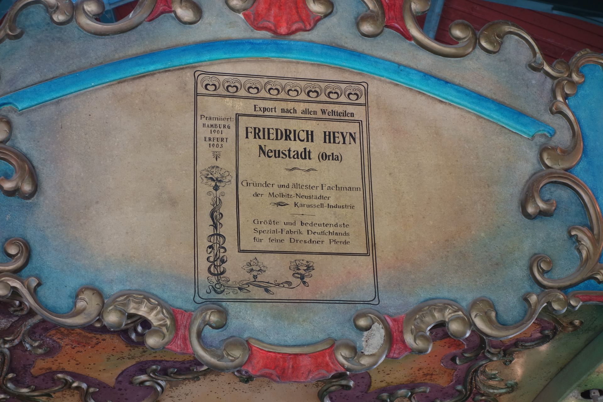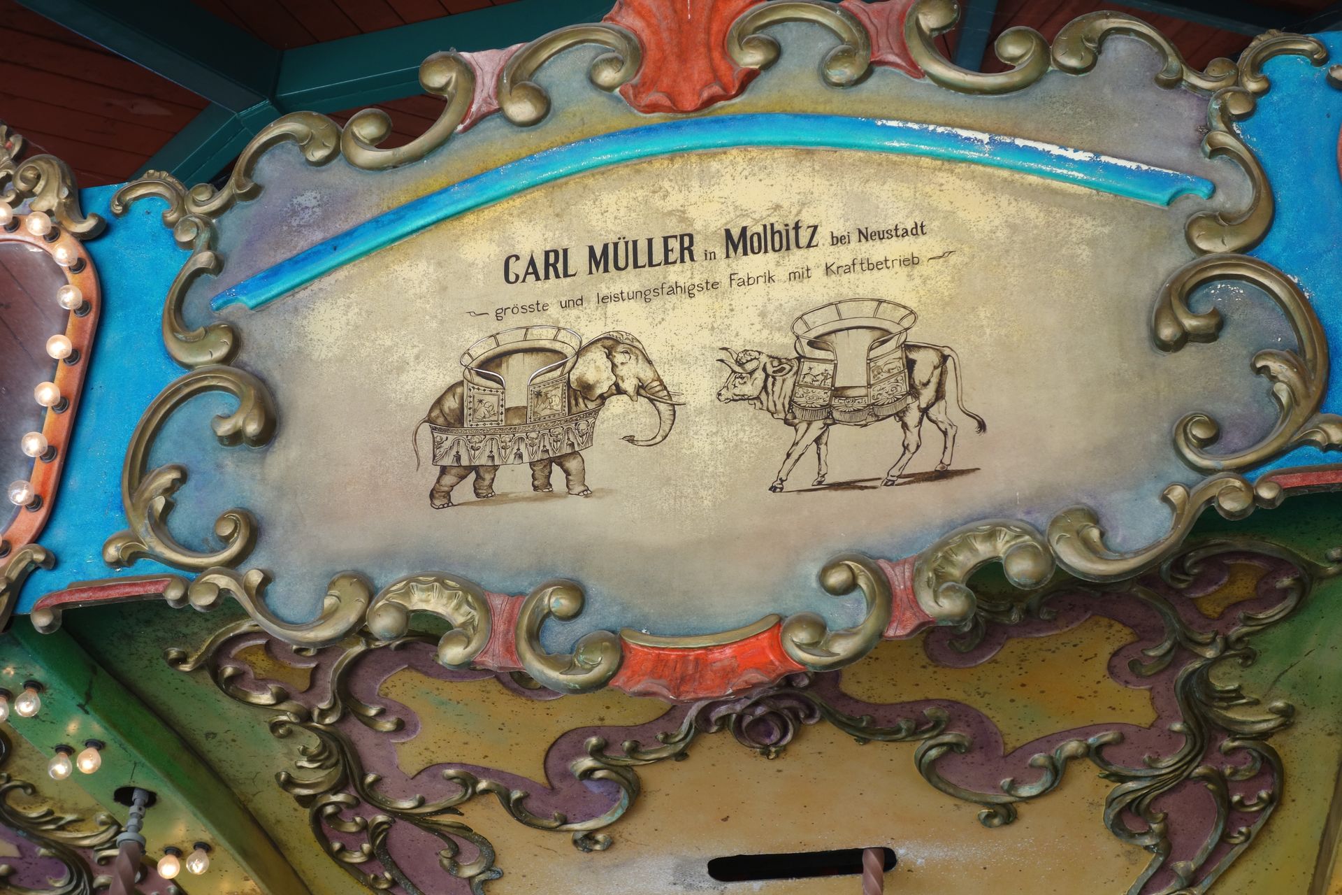 Oben sind rundherum - neben dem tatsächlichen Hersteller - die Karussellbauer aufgeführt, deren Figuren hier als Duplikate ihre Runden drehen.