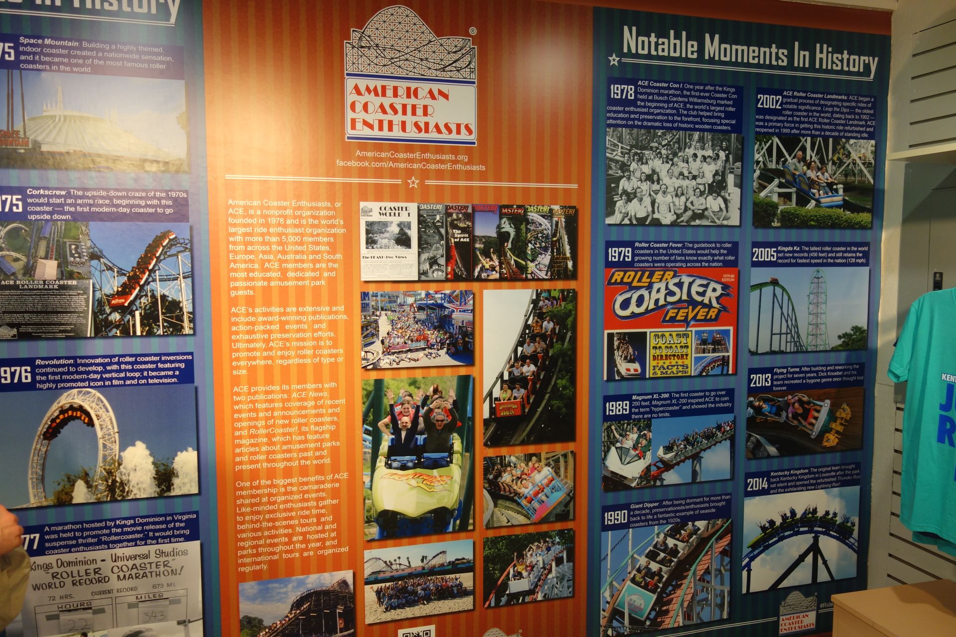 Der Hauptshop des Parks wartet mit einer kompletten Wand zur Geschichte der Achterbahnen und der American Coaster Enthusiasts auf.