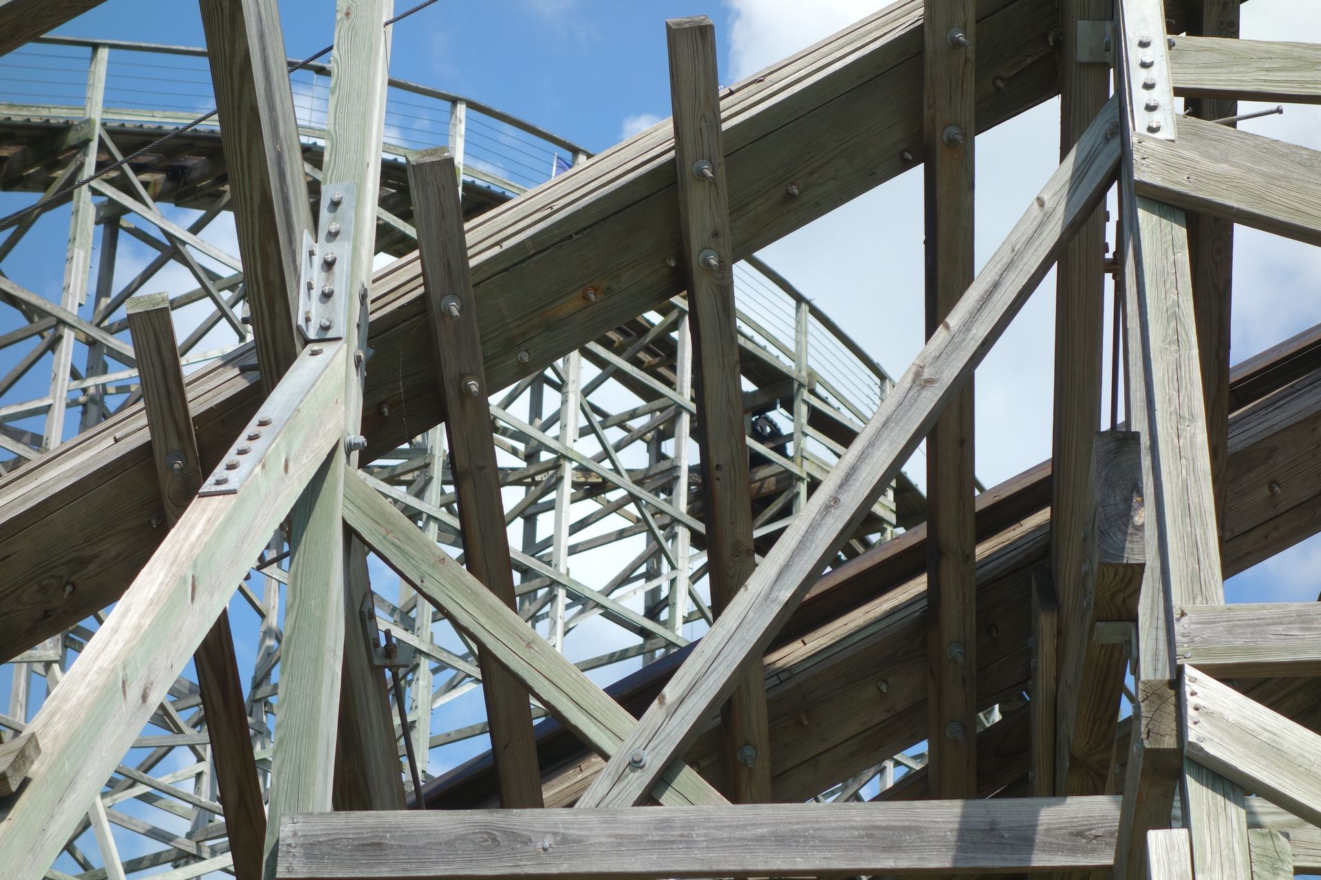 Dass die größte Attraktion des Parks von Great Coasters International zusammengezimmert wurde, ist kaum zu verkennen.