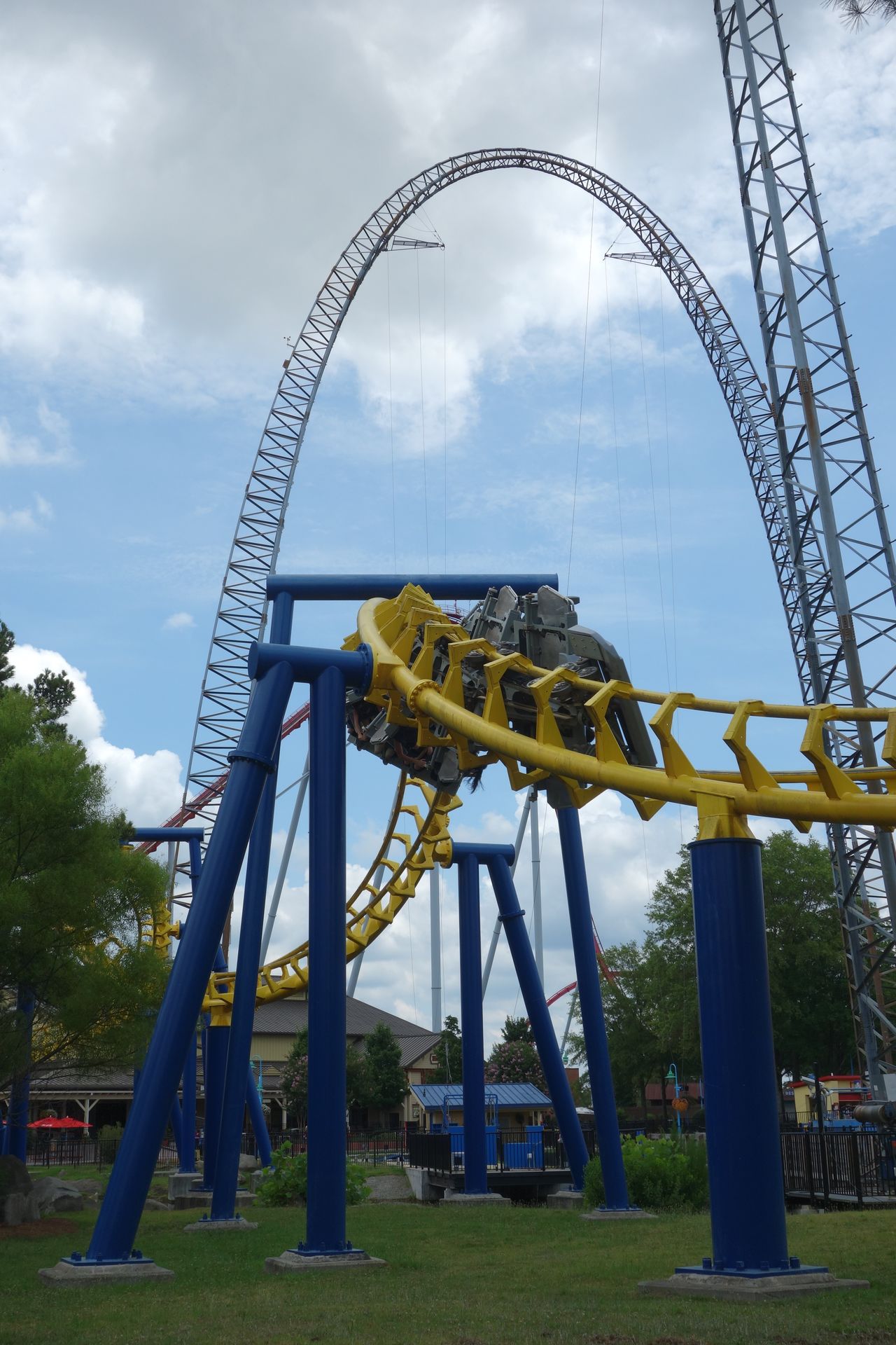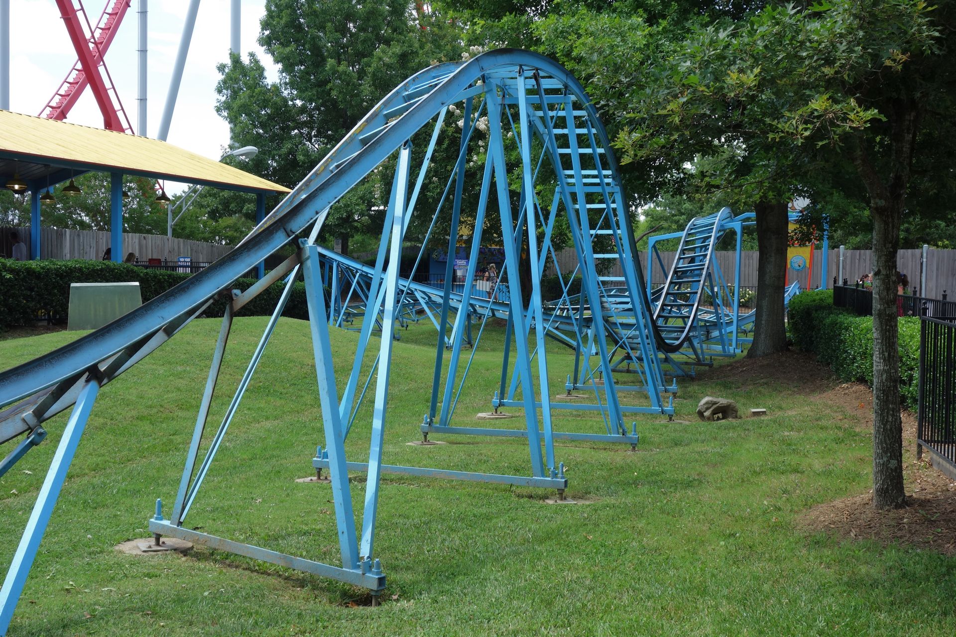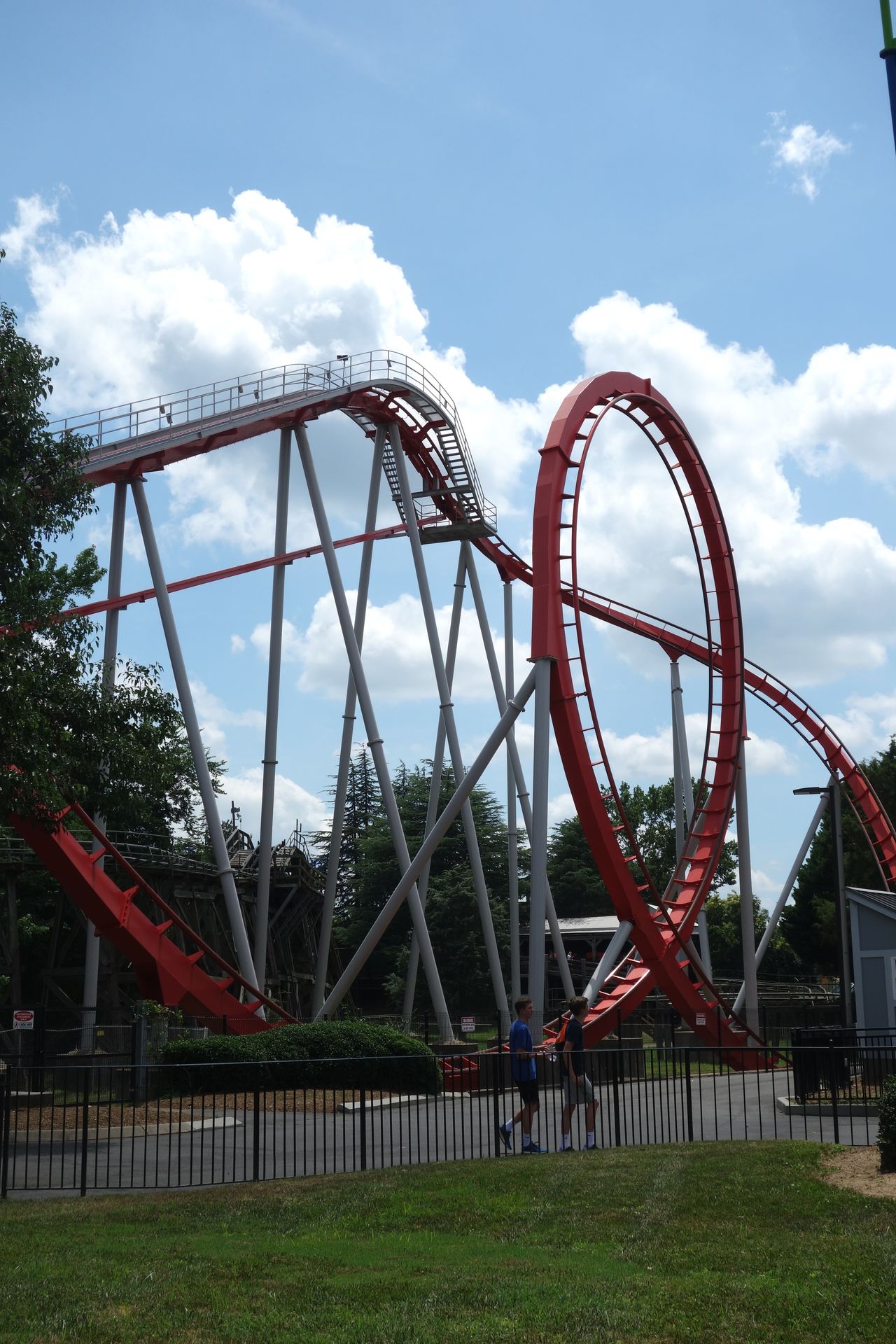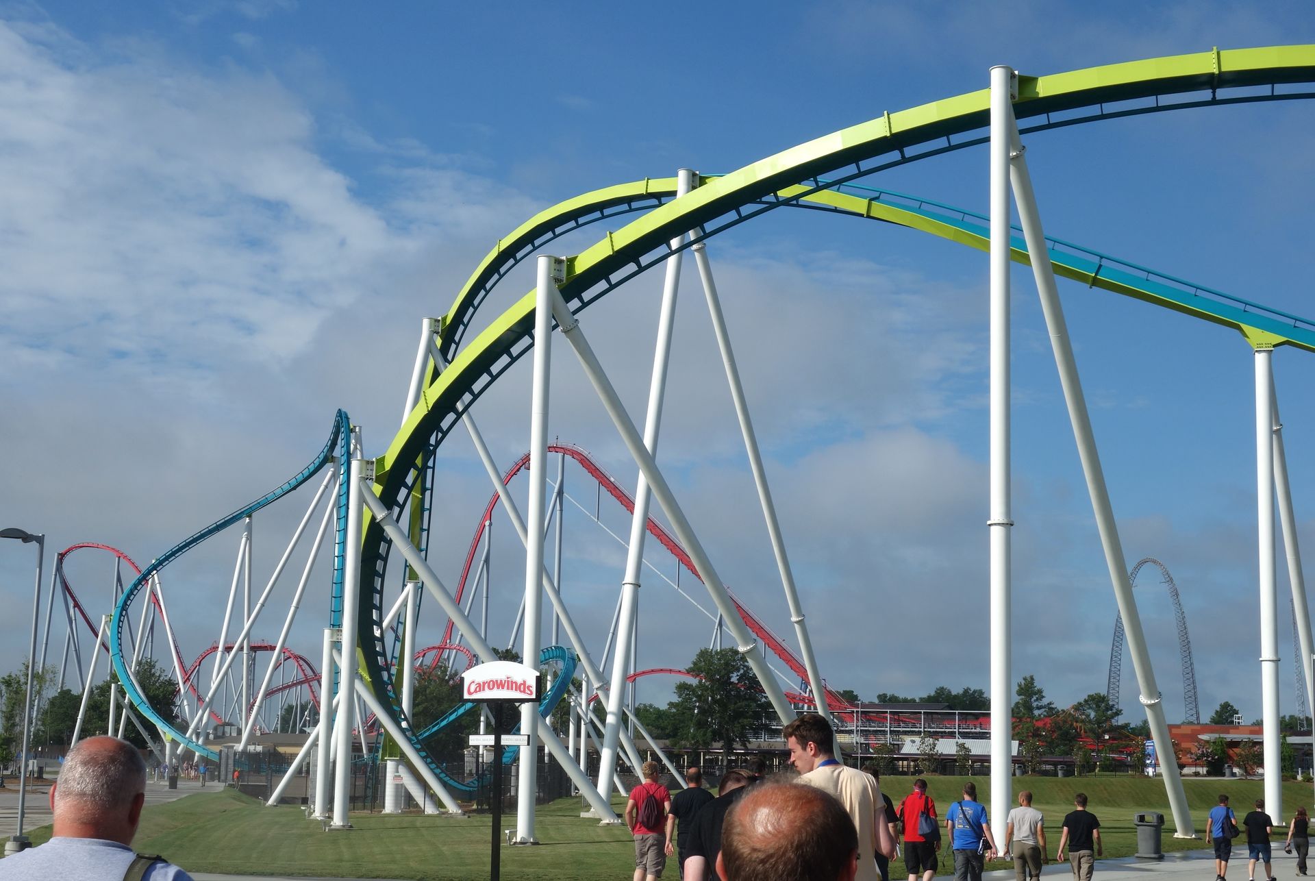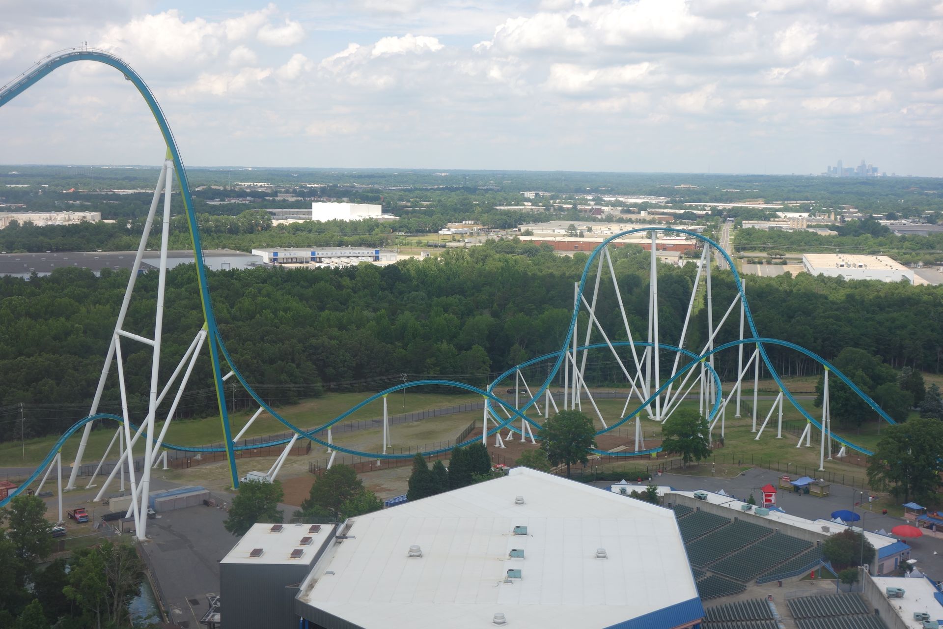 Mit gut 27 Metern Höhe gehört die Bahn zu den kleineren in Carowinds. Dafür geht es mit einem Looping direkt zur Sache.