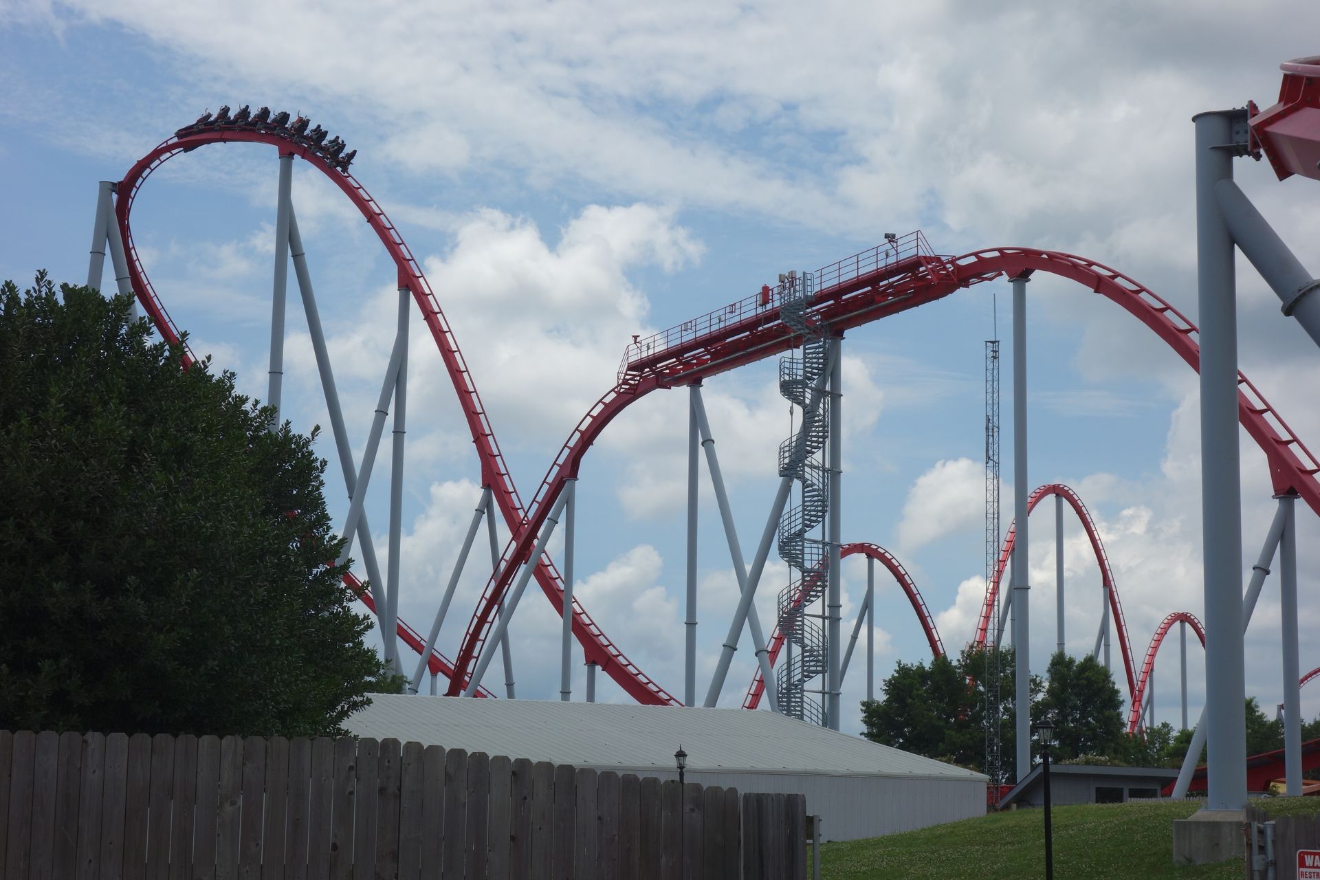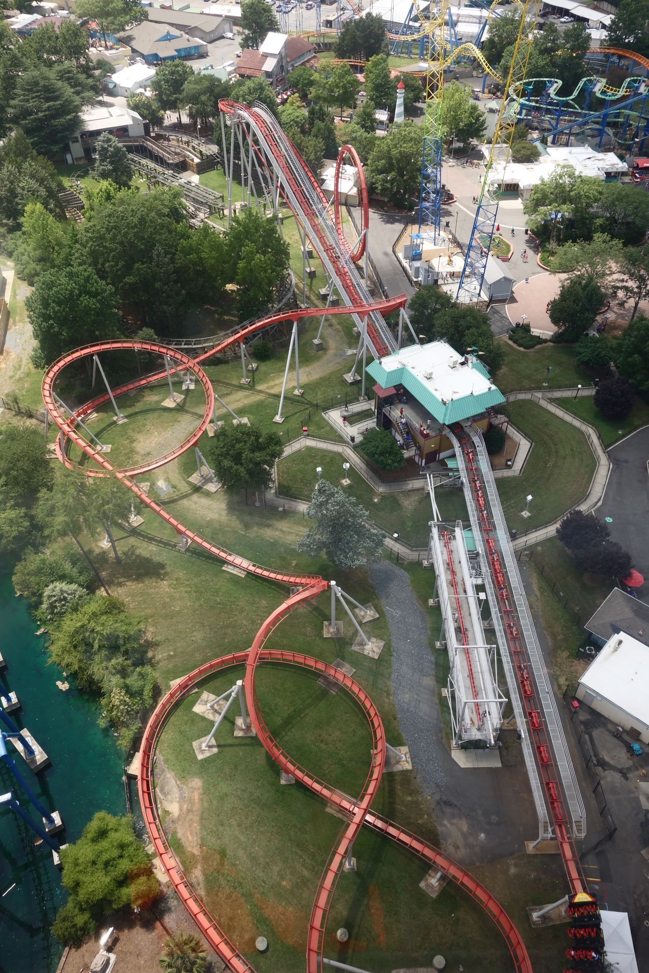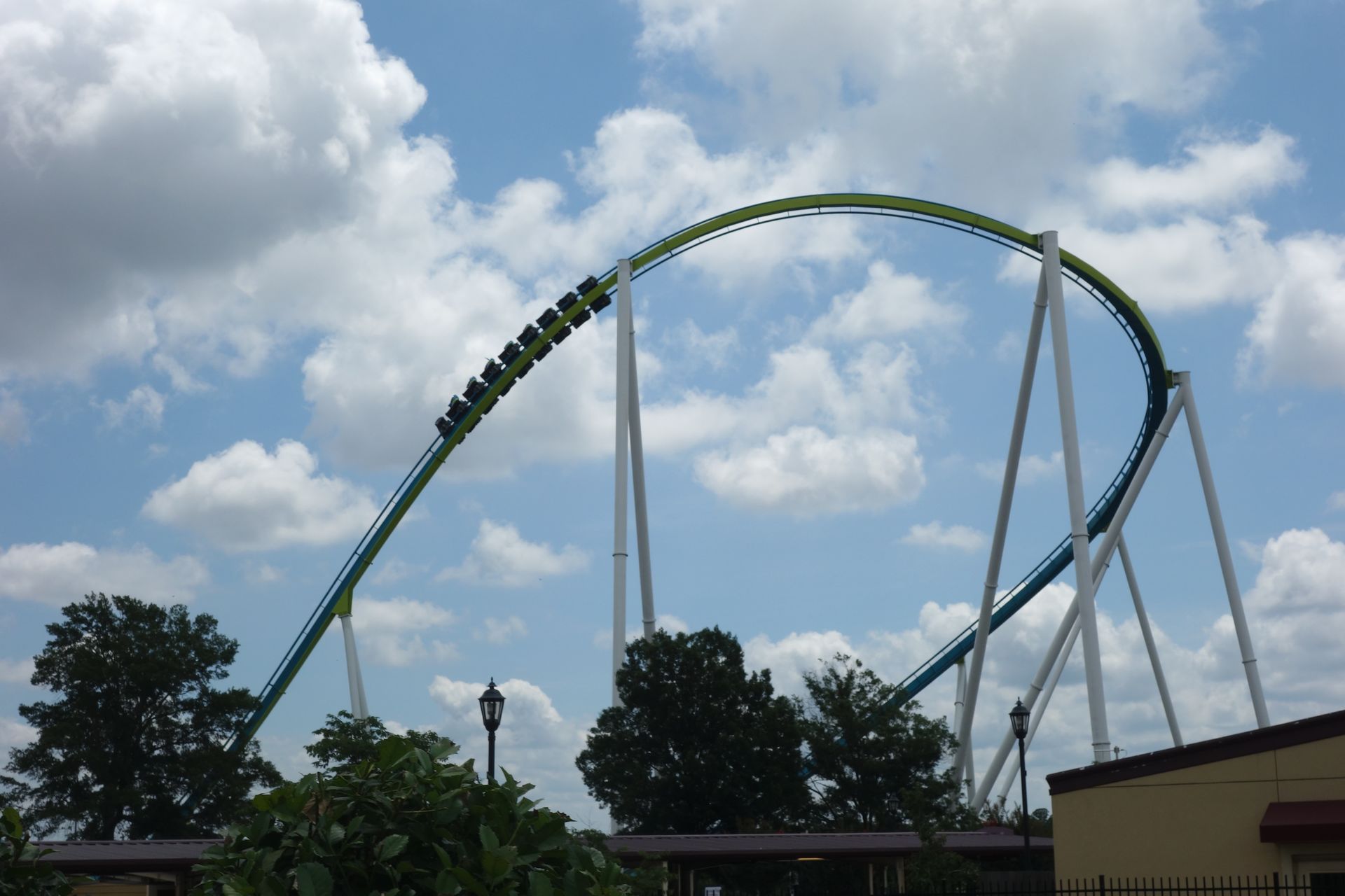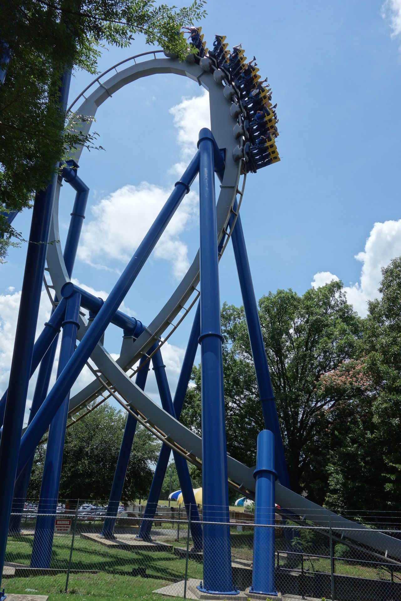 Mit gut 27 Metern Höhe gehört die Bahn zu den kleineren in Carowinds. Dafür geht es mit einem Looping direkt zur Sache.